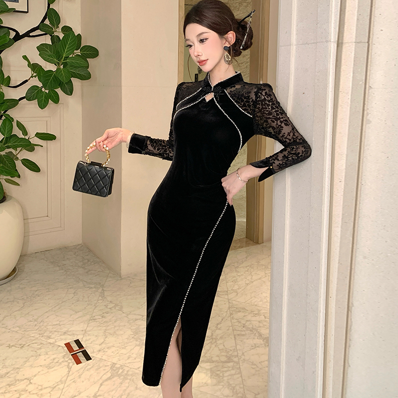 FA46628# 秋季新款旗袍女人味修身钉珠蕾丝丝绒连衣裙聚会礼服