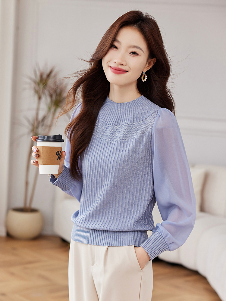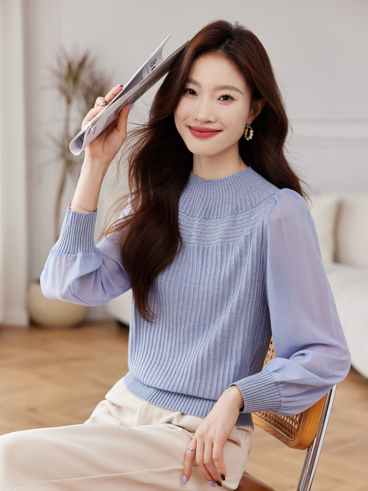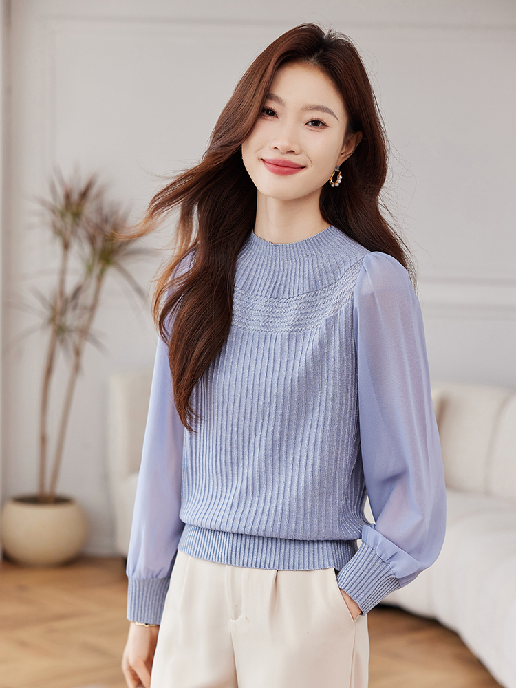 FA46821# 秋季新款时尚雪纺长袖拼接立领针织衫女修身设计感上衣 服裝批發女裝批發服飾貨源