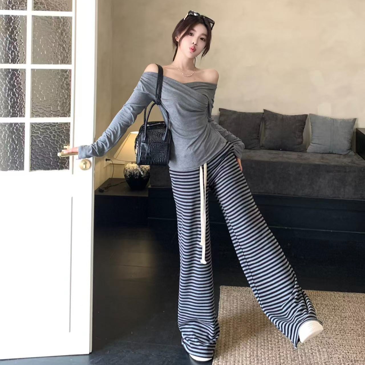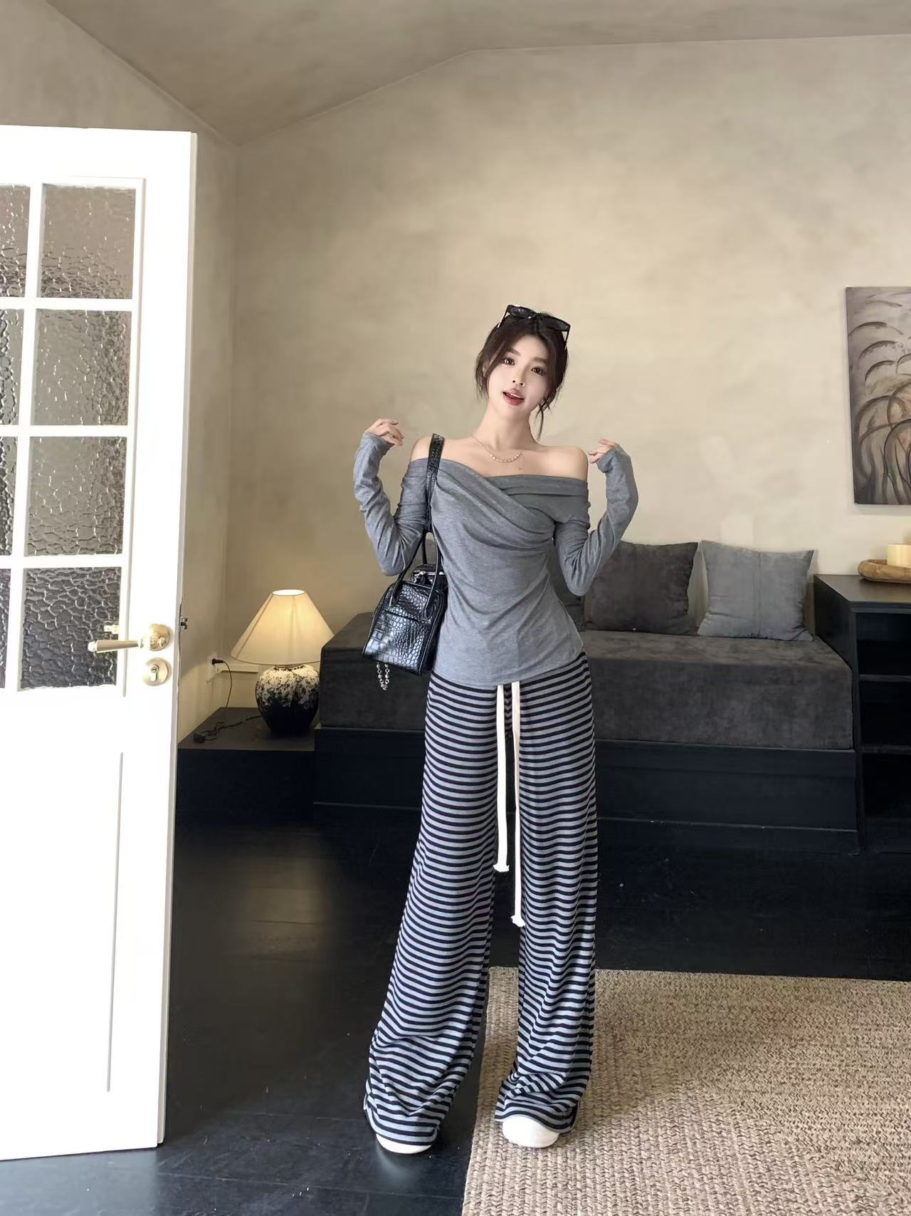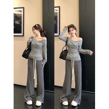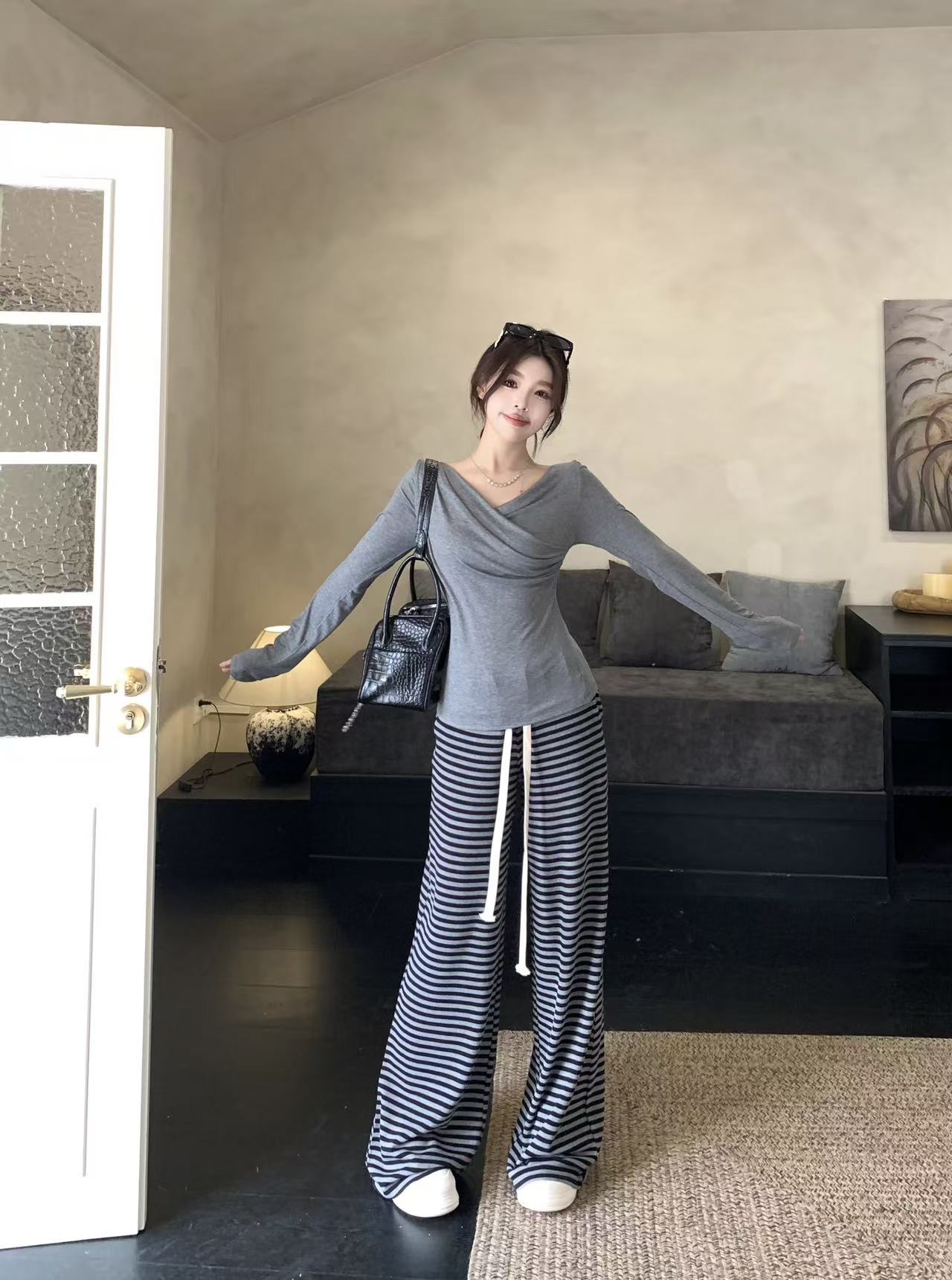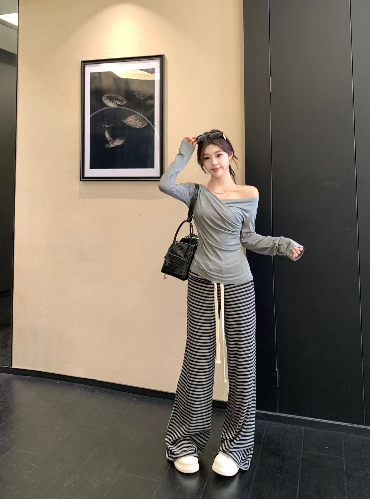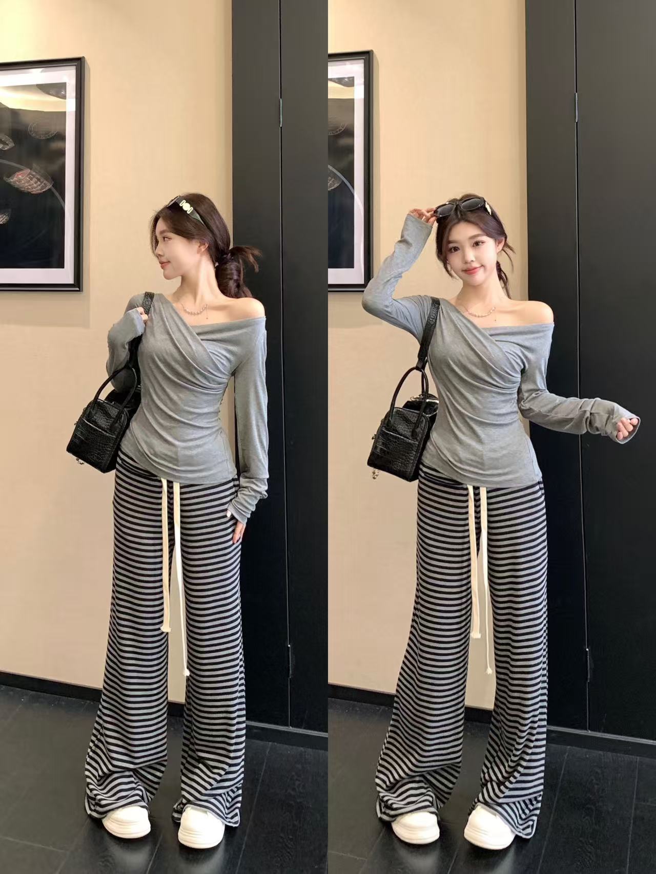 FA47872# 韩版褶皱灰色上衣和垂感懒懒长款裤条纹慵懒风针织套装 服裝批發女裝批發服飾貨源