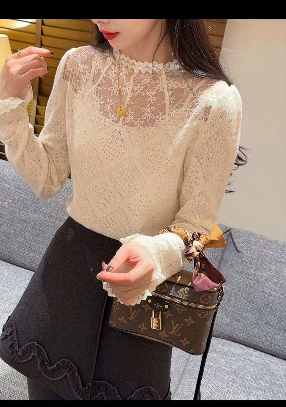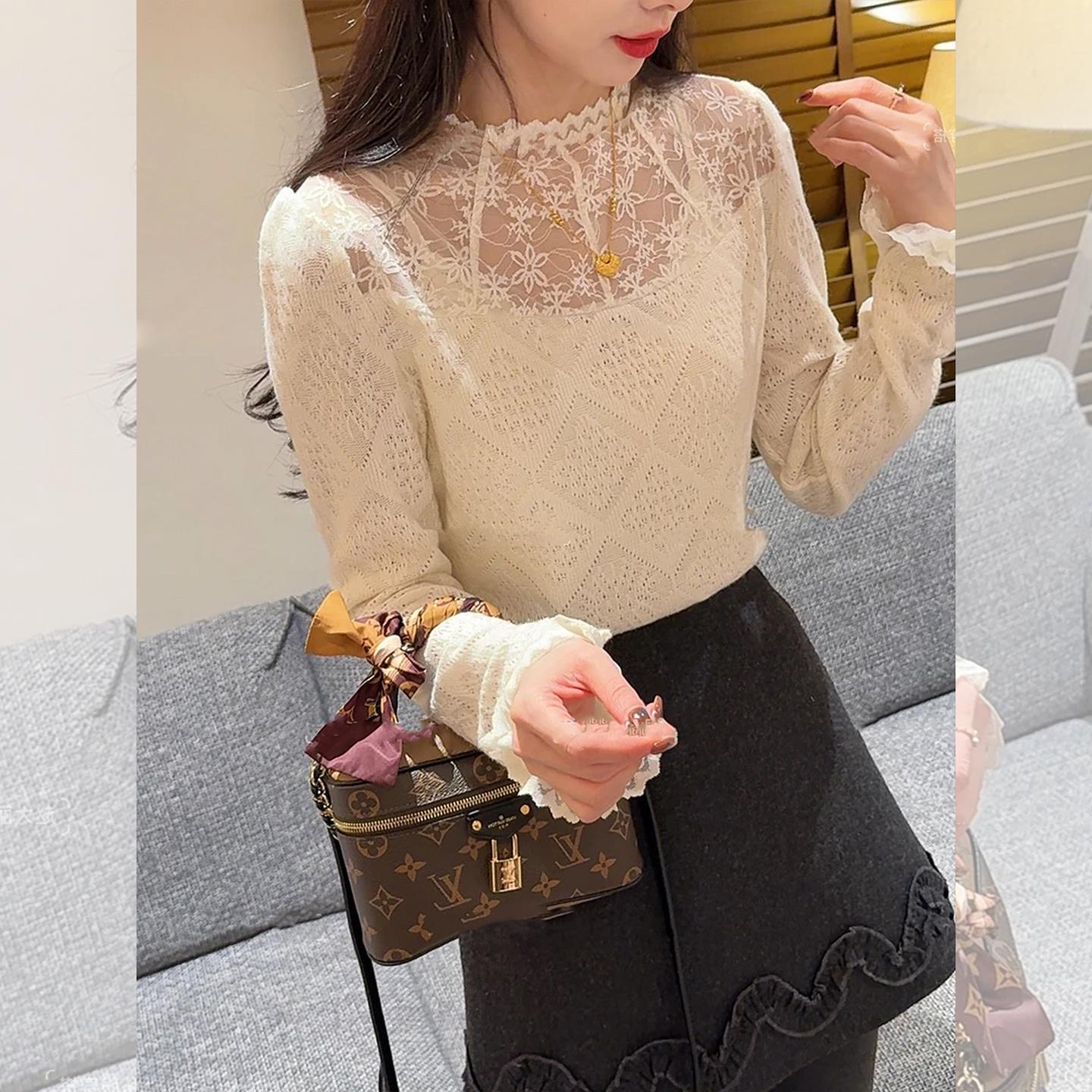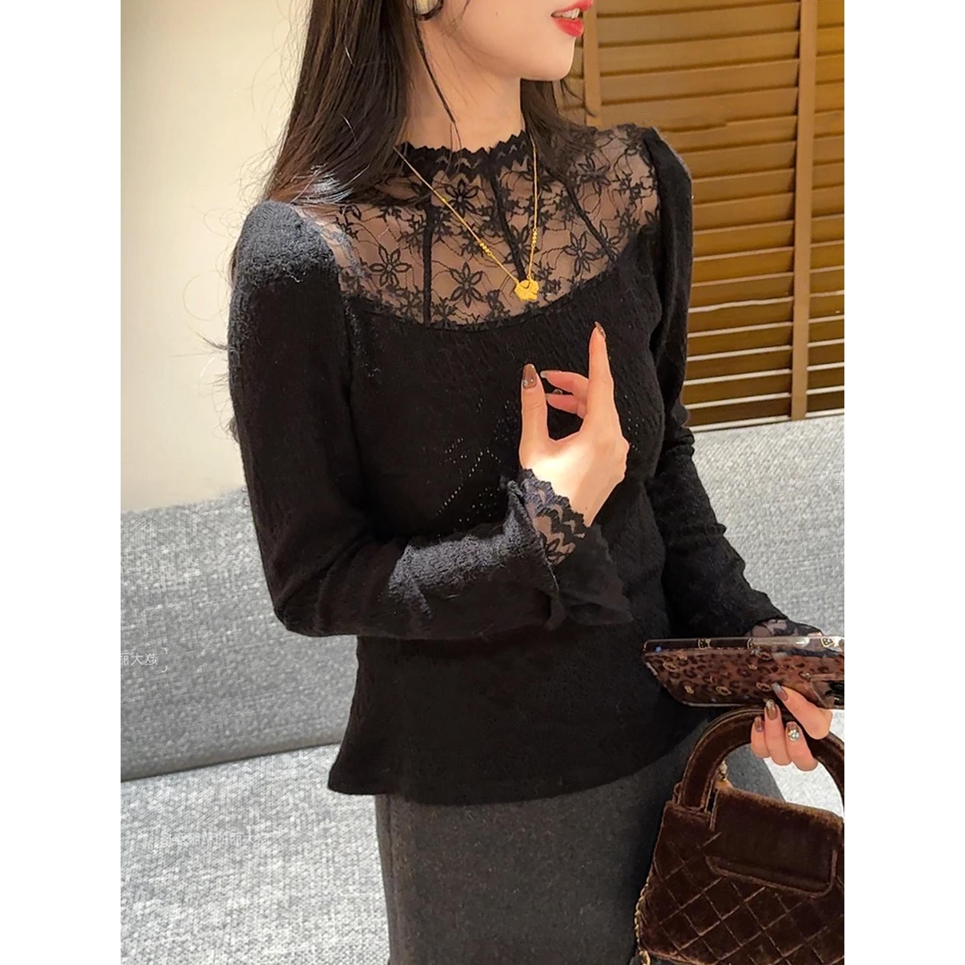 FA48020# 法式半高领镂空蕾丝拼接内搭女秋冬款高级感气质百搭显瘦上衣 服裝批發女裝批發服飾貨源