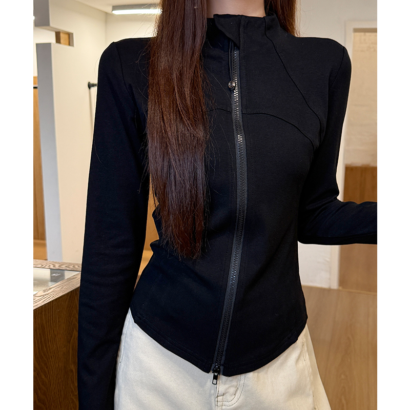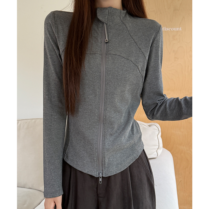 FA48037# 立领德绒拉链长袖t恤女冬季设计感修身灰色加绒加厚短款 服裝批發女裝批發服飾貨源
