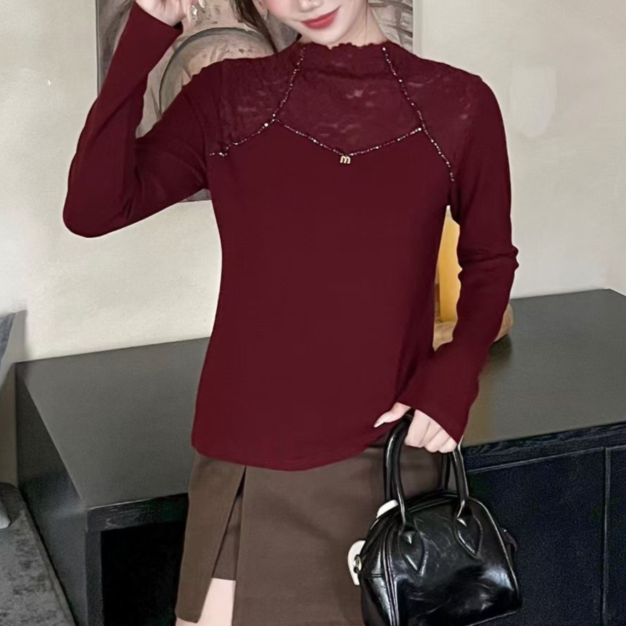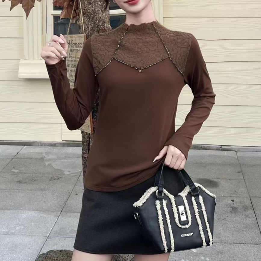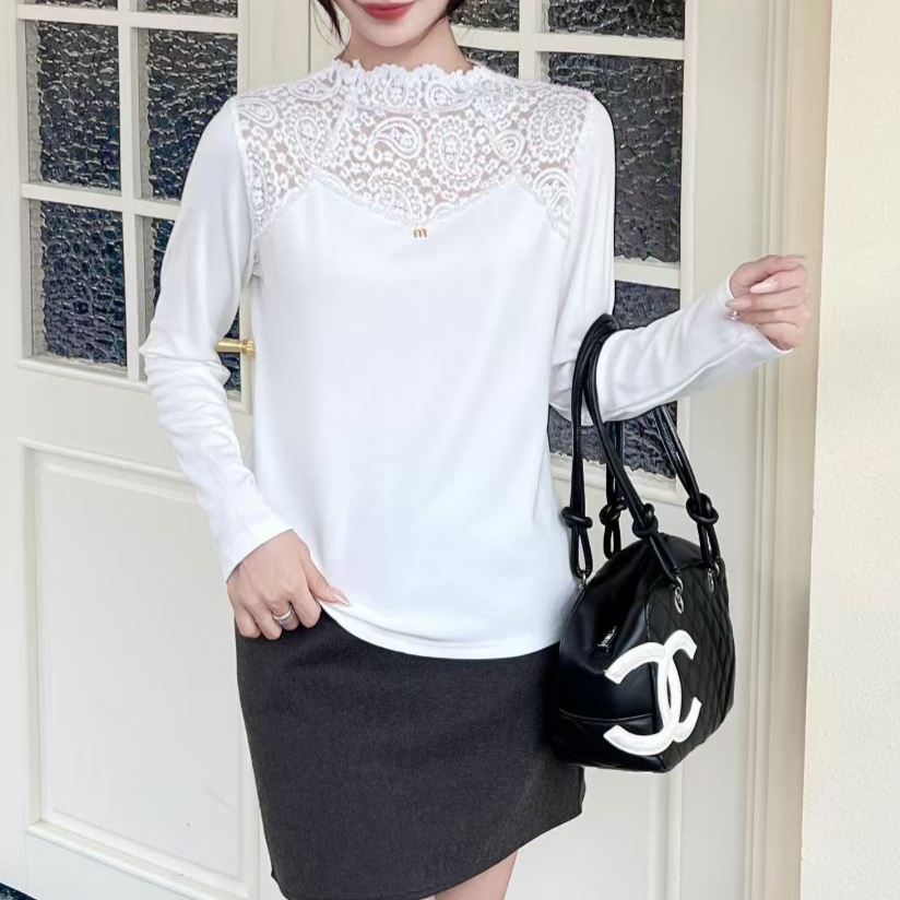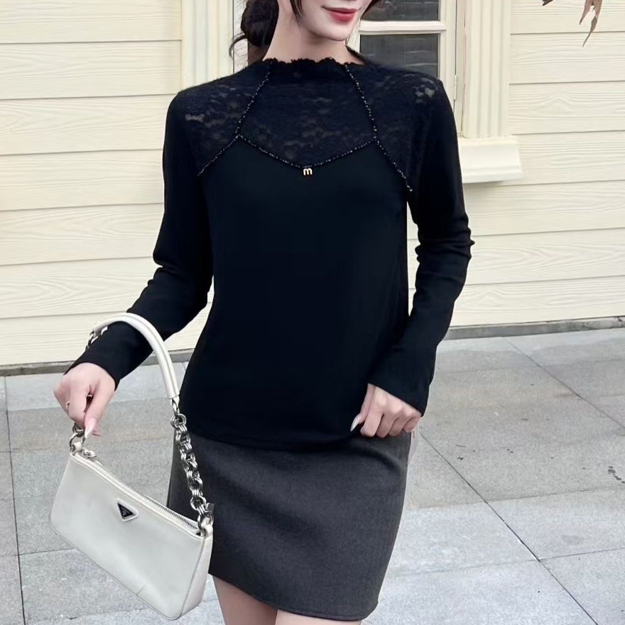 FA48040# 秋冬半高领蕾丝拼接长袖打底衫时尚洋气百搭显瘦打底上衣 服裝批發女裝批發服飾貨源