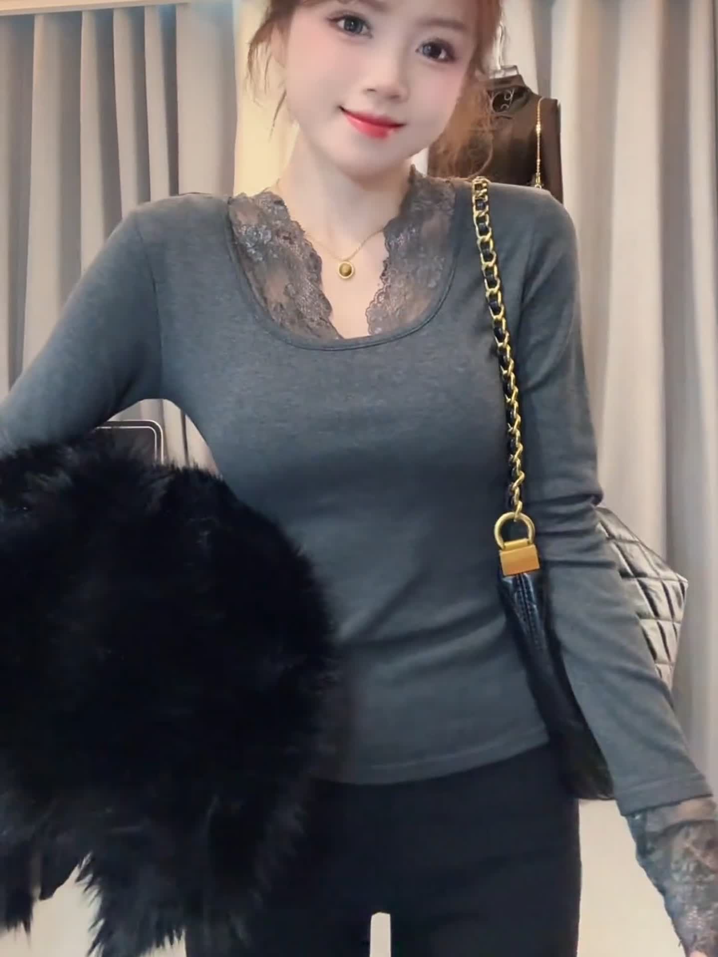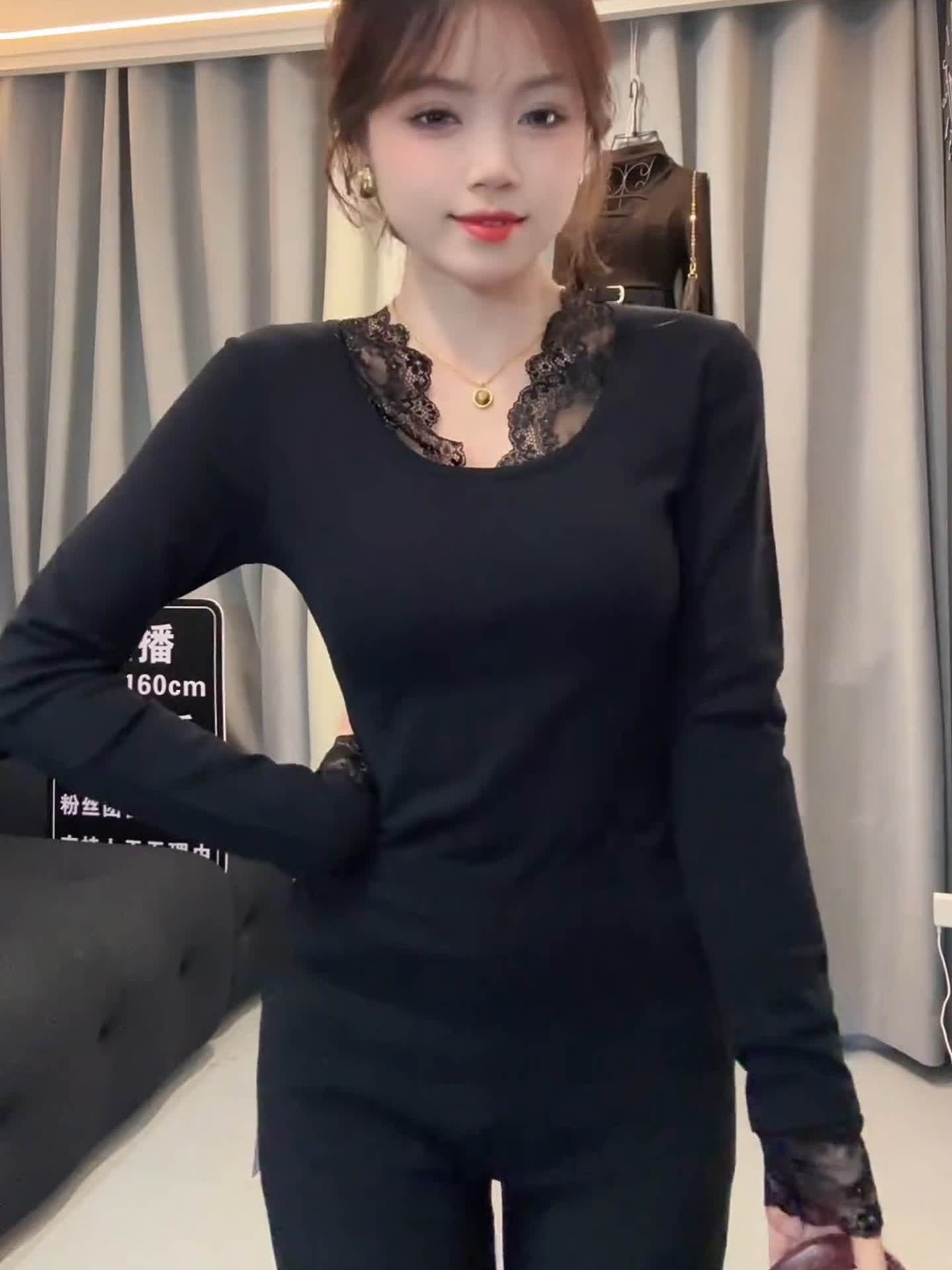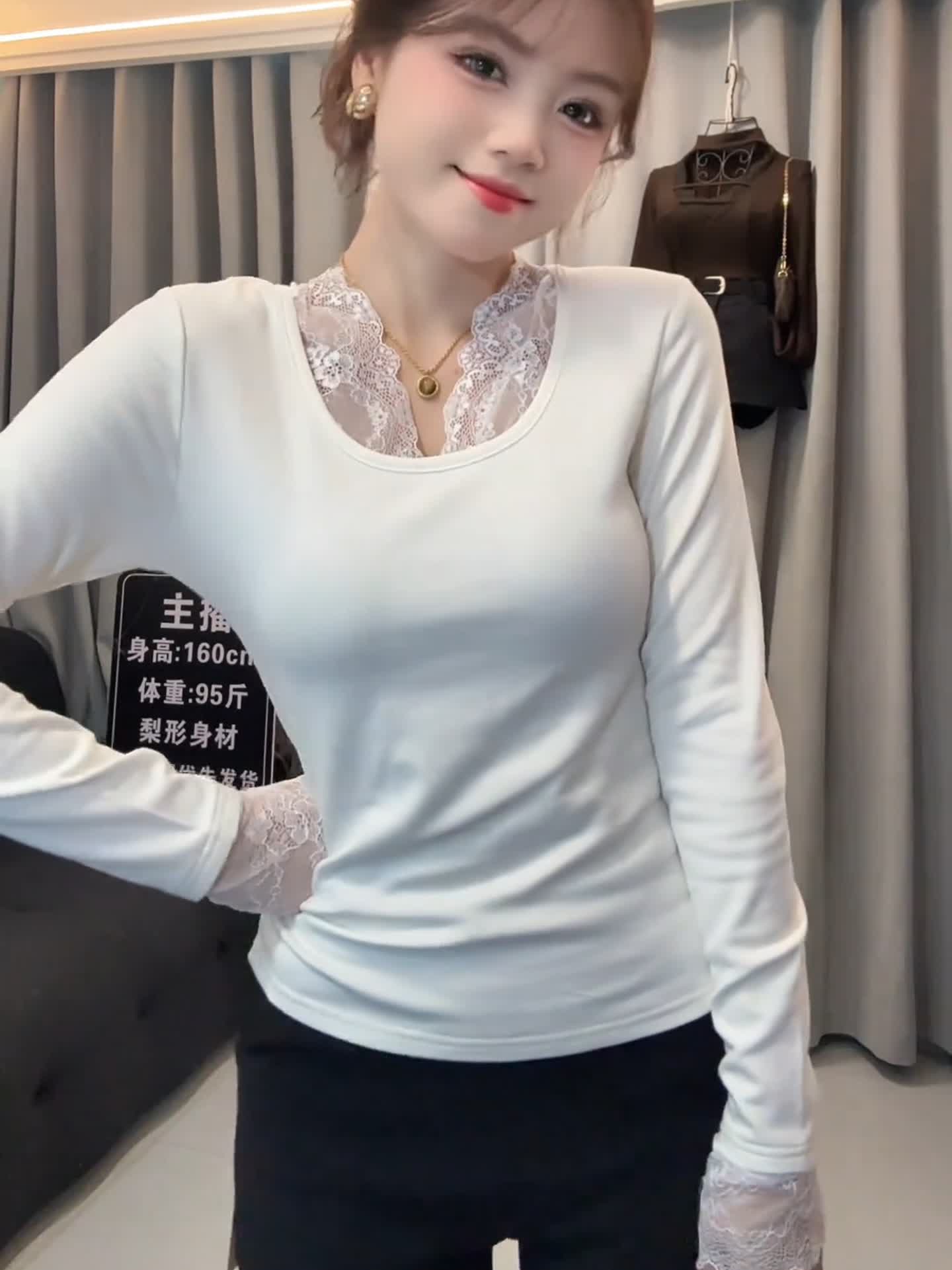 FA48047# 性感内搭蕾丝拼接打底衫女秋冬新款纯欲气质修身长袖t恤上衣 服裝批發女裝批發服飾貨源