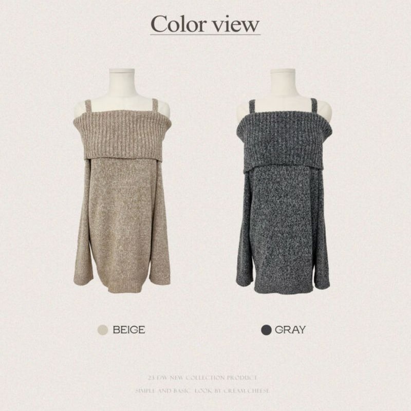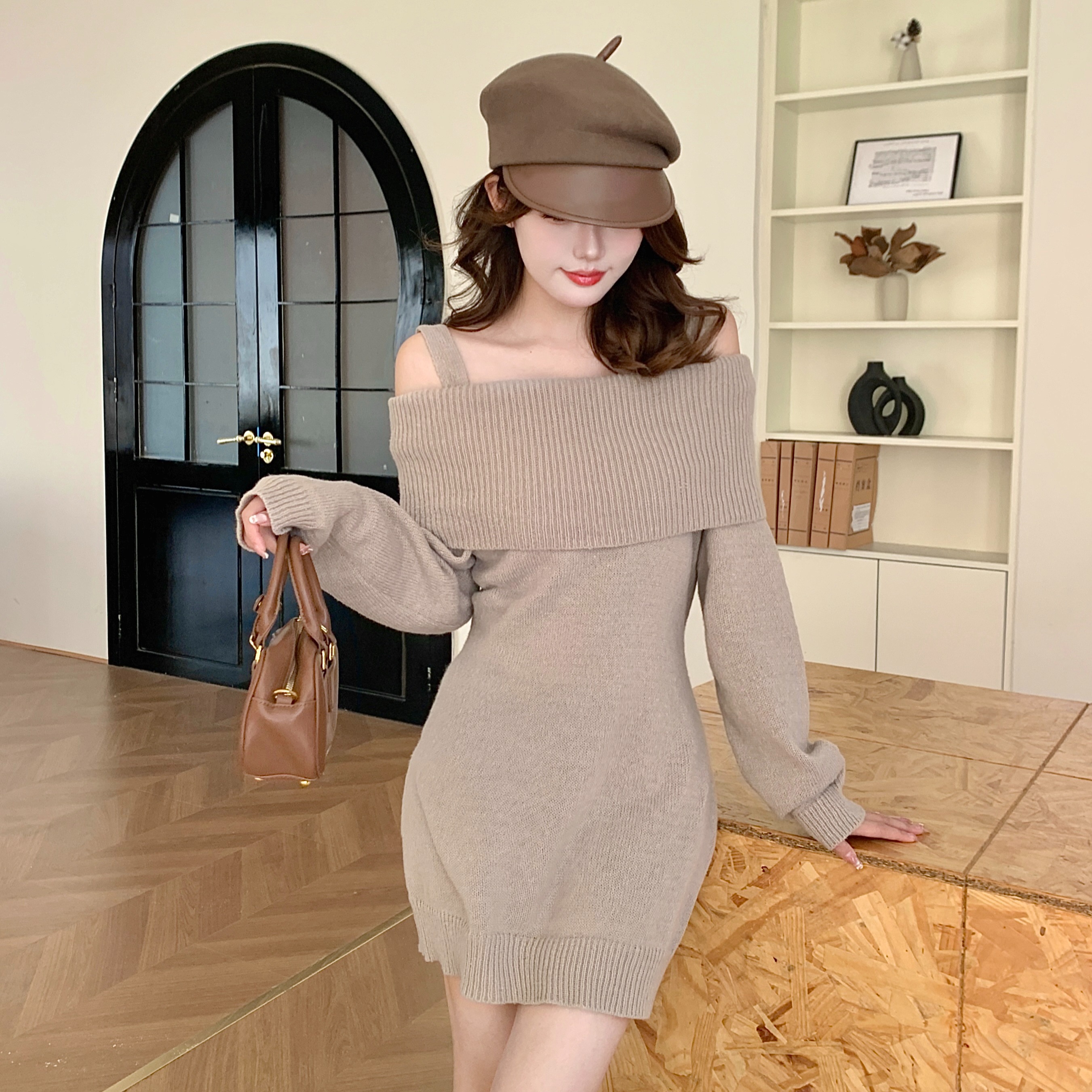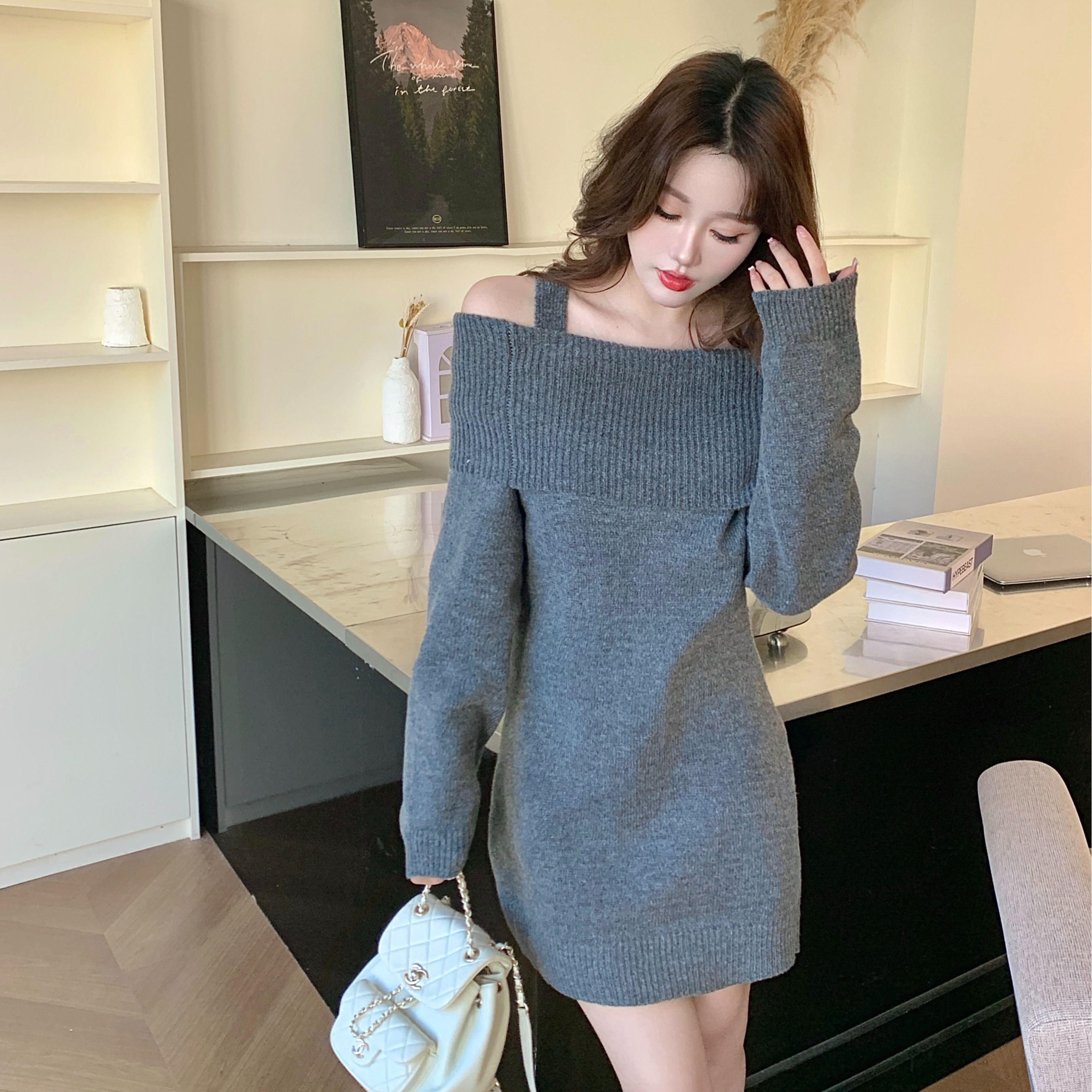 FA48150# 韩国chic性感露肩一字领针织连衣裙气质洋气吊带毛衣裙 服裝批發女裝批發服飾貨源