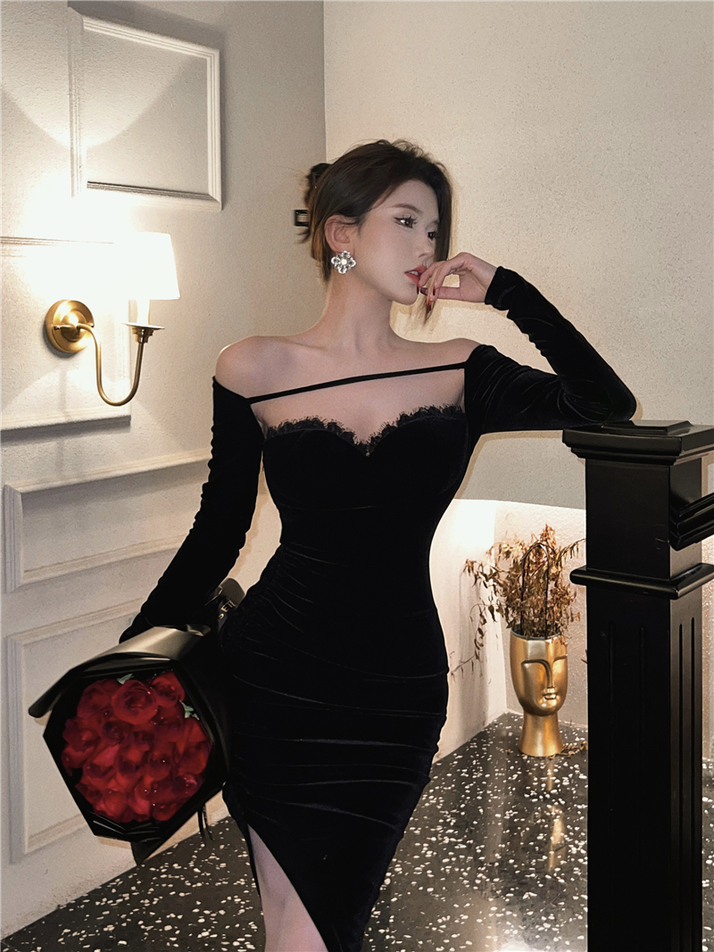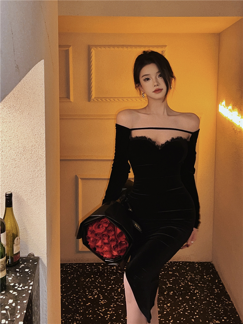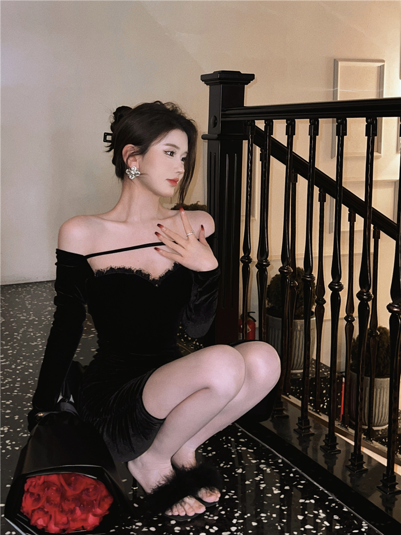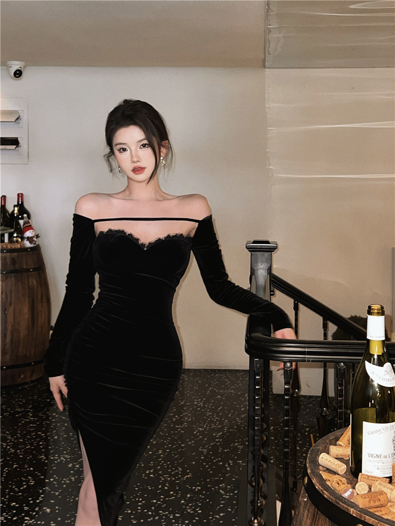 FA48221# 赫本风名媛性感气质黑色一字领露肩金丝绒长袖高级法式礼服 服裝批發女裝批發服飾貨源
