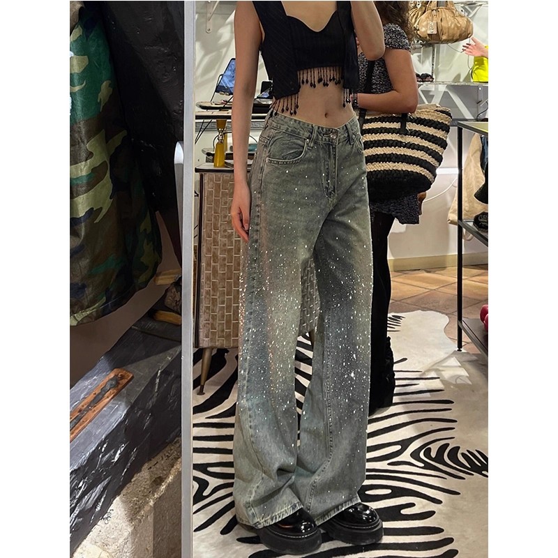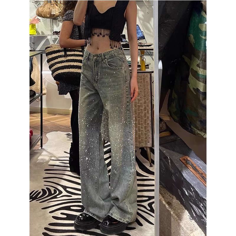 FA48261# 美式复古设计感烫钻石牛仔裤女新款满天星重工千禧辣妹爆闪长裤子 服裝批發女裝批發服飾貨源