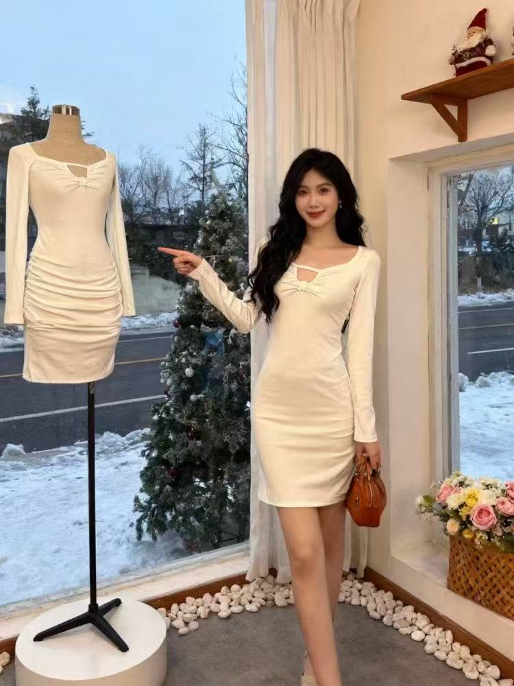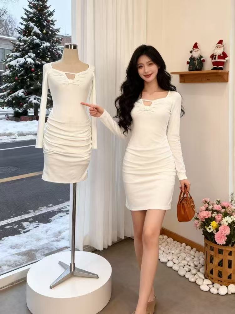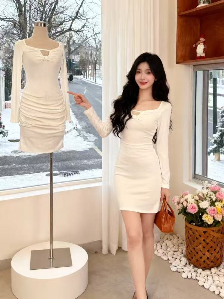 FA48286# 韩系纯欲风镂空褶皱长袖T恤秋冬新款精致别致千金感包臀裙 服裝批發女裝批發服飾貨源