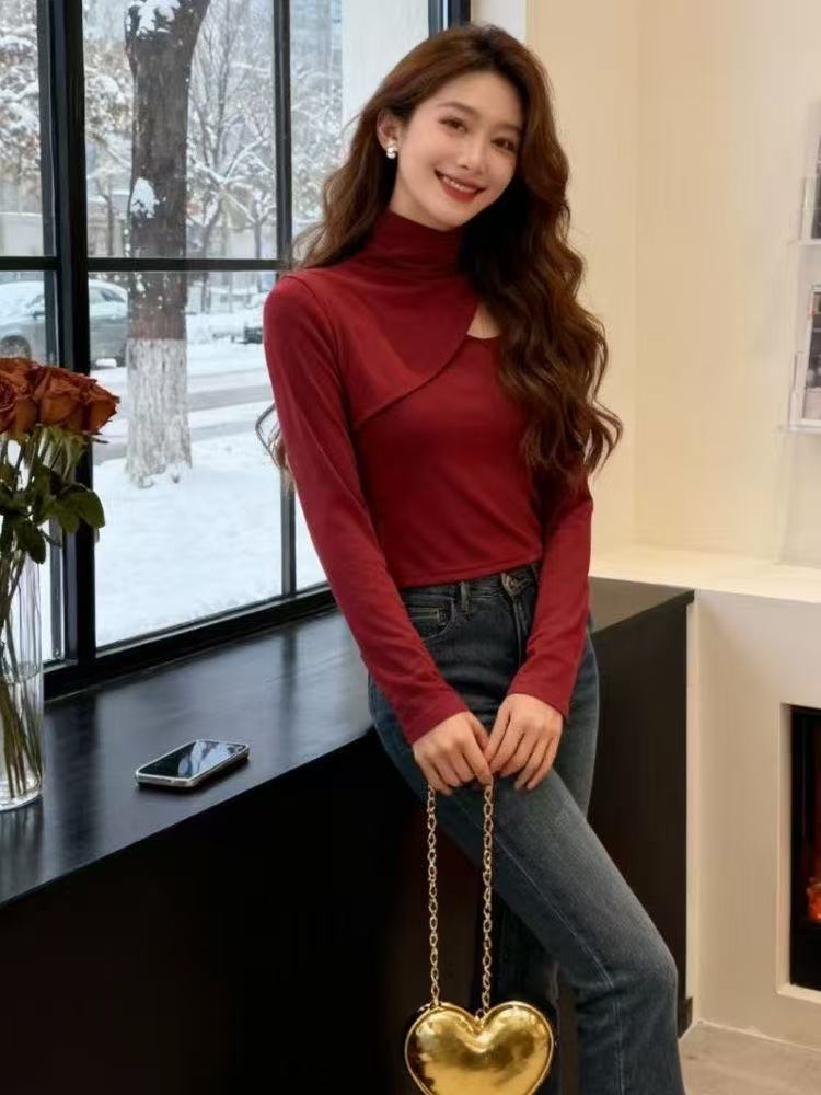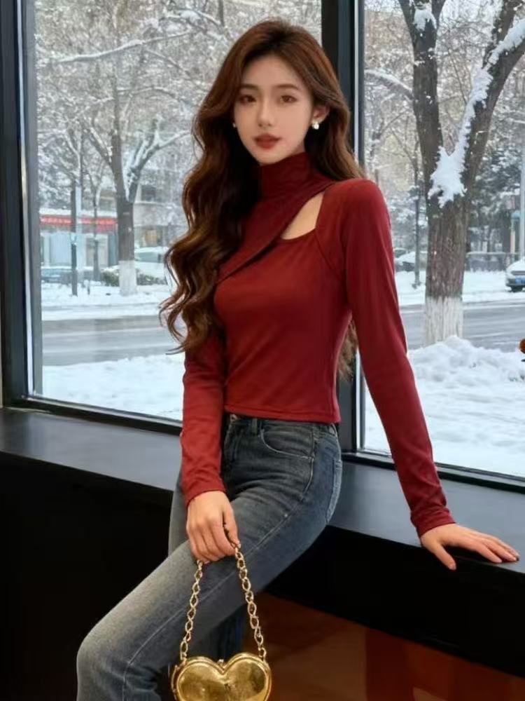 FA48288# 法式辣妹风镂空高领长袖T恤秋冬新款独特小众修身短款上衣 服裝批發女裝批發服飾貨源