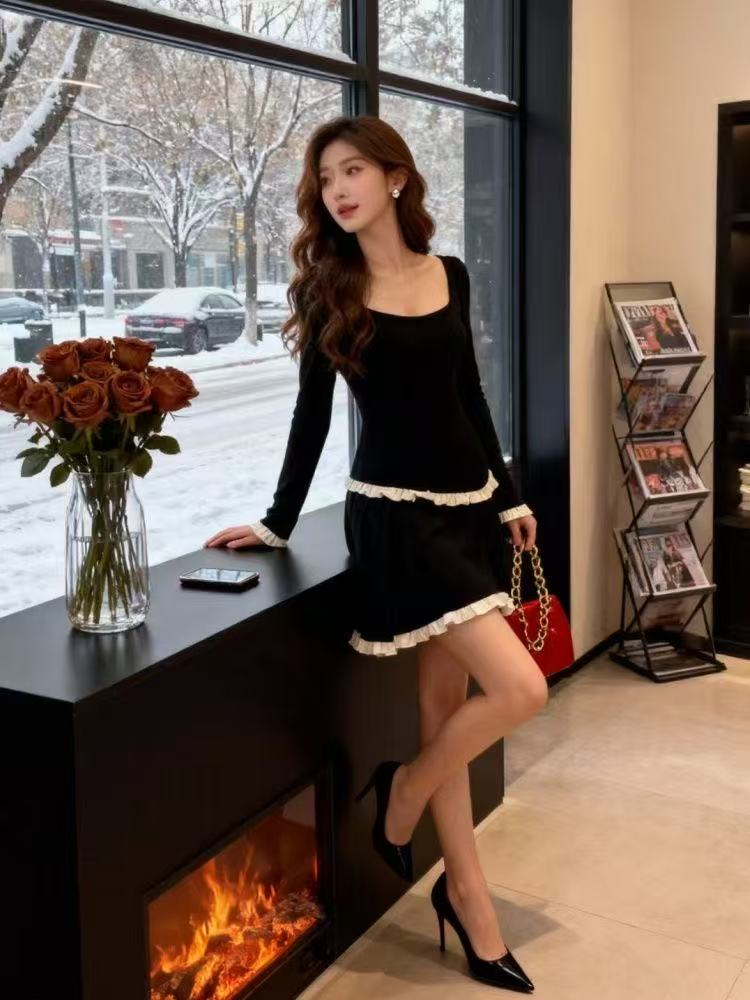 FA48292# 韩系纯欲风千金方领荷叶边长袖秋冬新款时尚收腰精致连衣裙 服裝批發女裝批發服飾貨源
