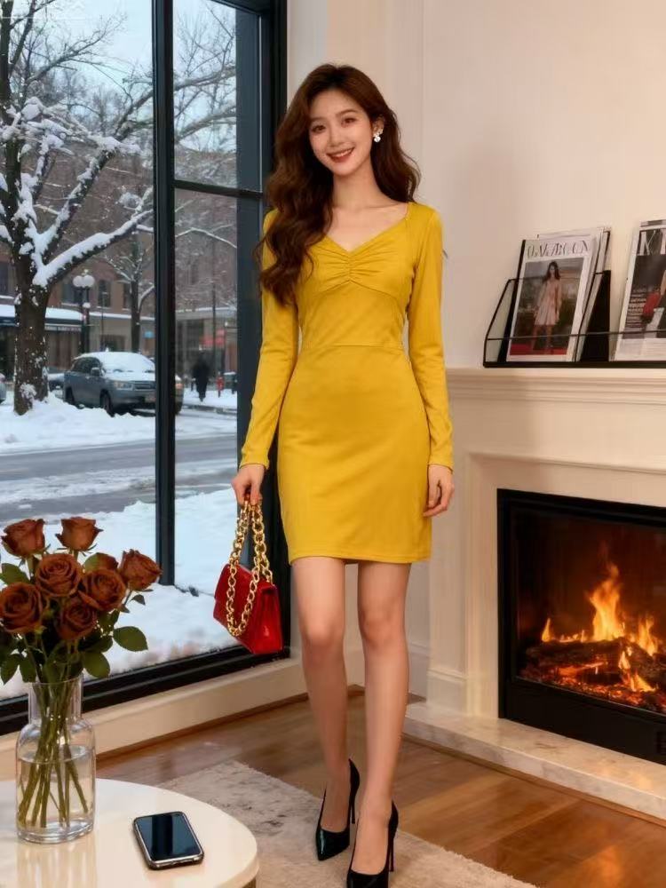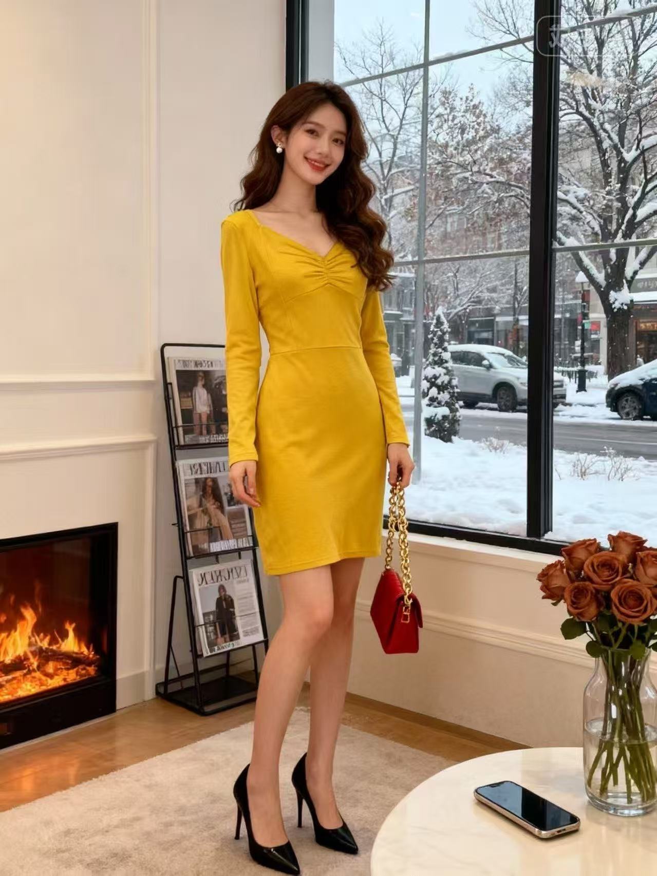 FA48294# 韩系简约风黄色V领褶皱长袖连衣裙秋冬新款气质设计感包臀裙 服裝批發女裝批發服飾貨源