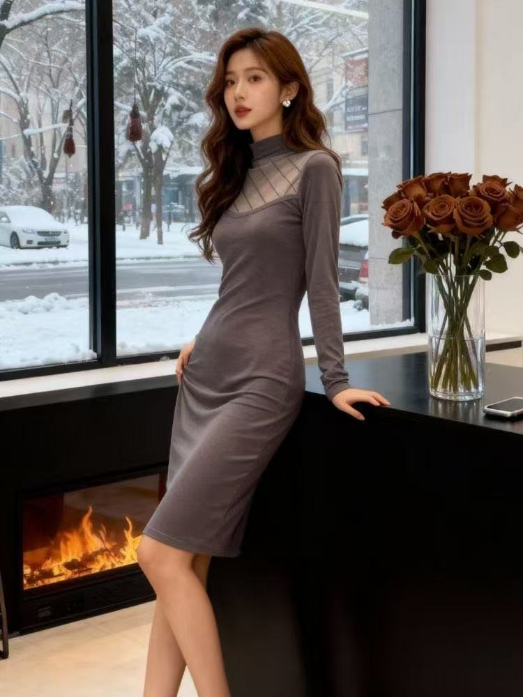FA48295# 韩系简约风网纱拼接立领长袖连衣裙秋冬新款别致收腰包臀裙 服裝批發女裝批發服飾貨源
