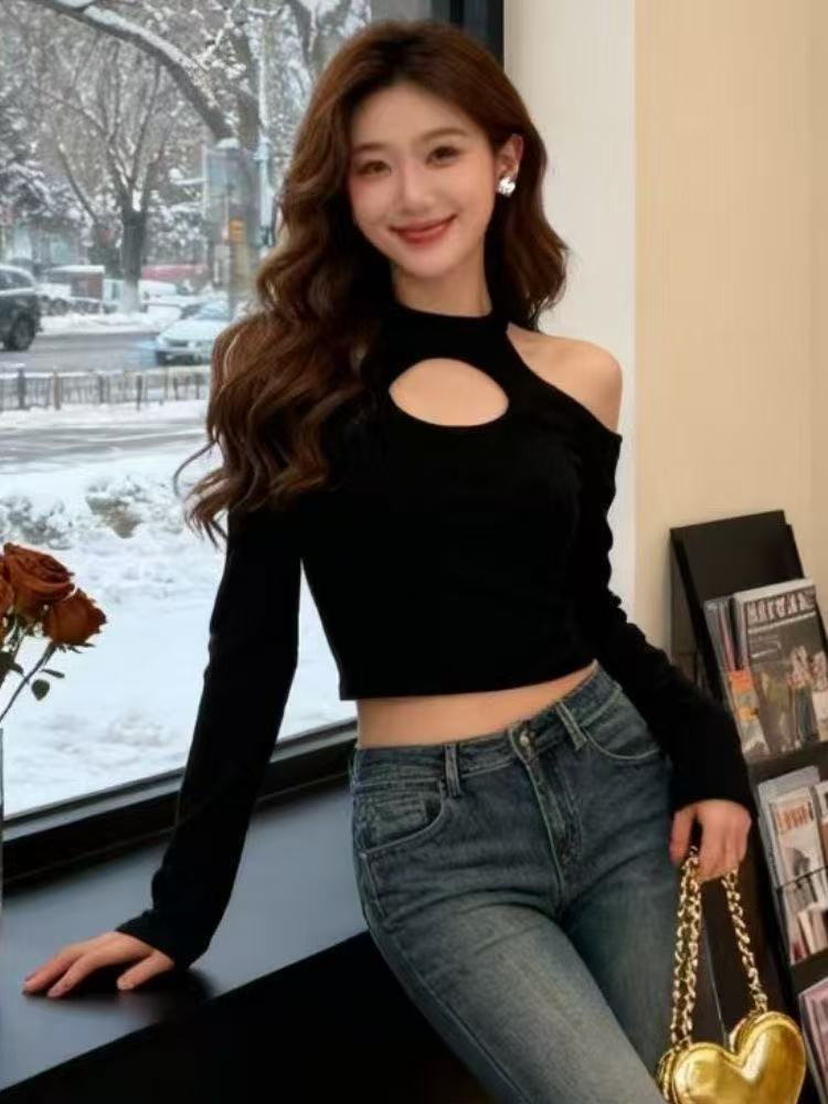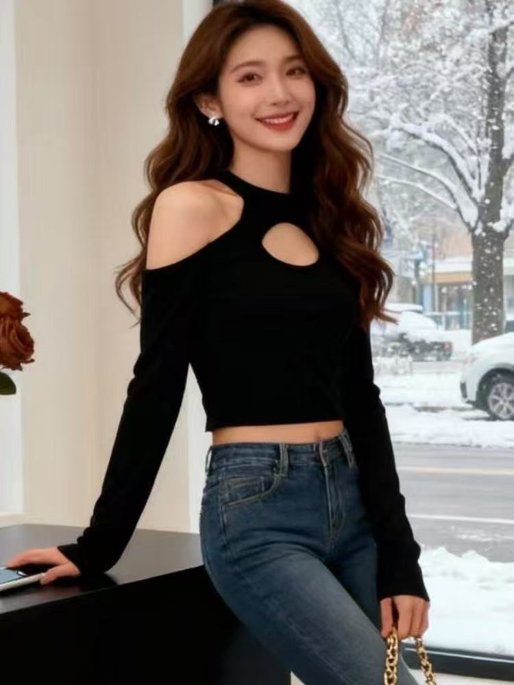 FA48300# 气质优雅风挂脖镂空圆领长袖T恤秋冬新款设计感修身显瘦上衣 服裝批發女裝批發服飾貨源