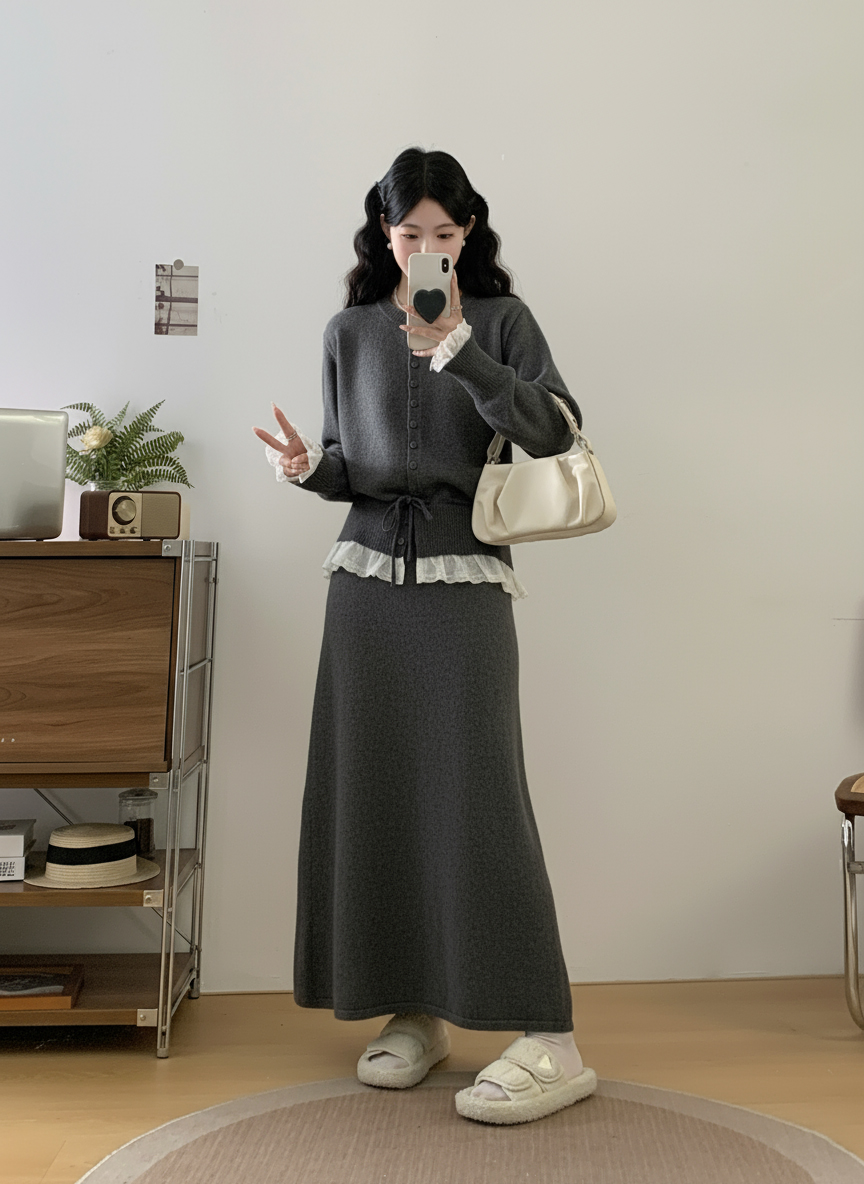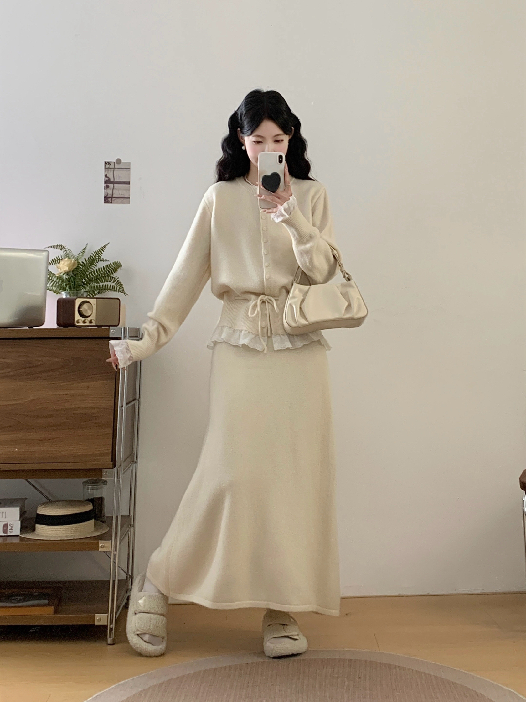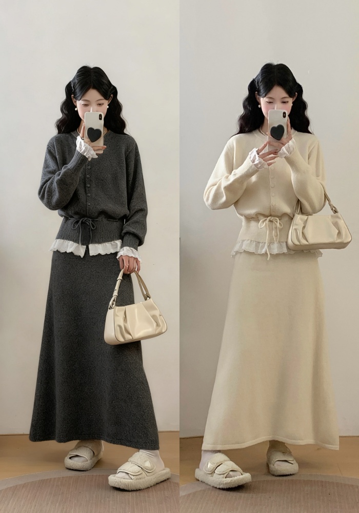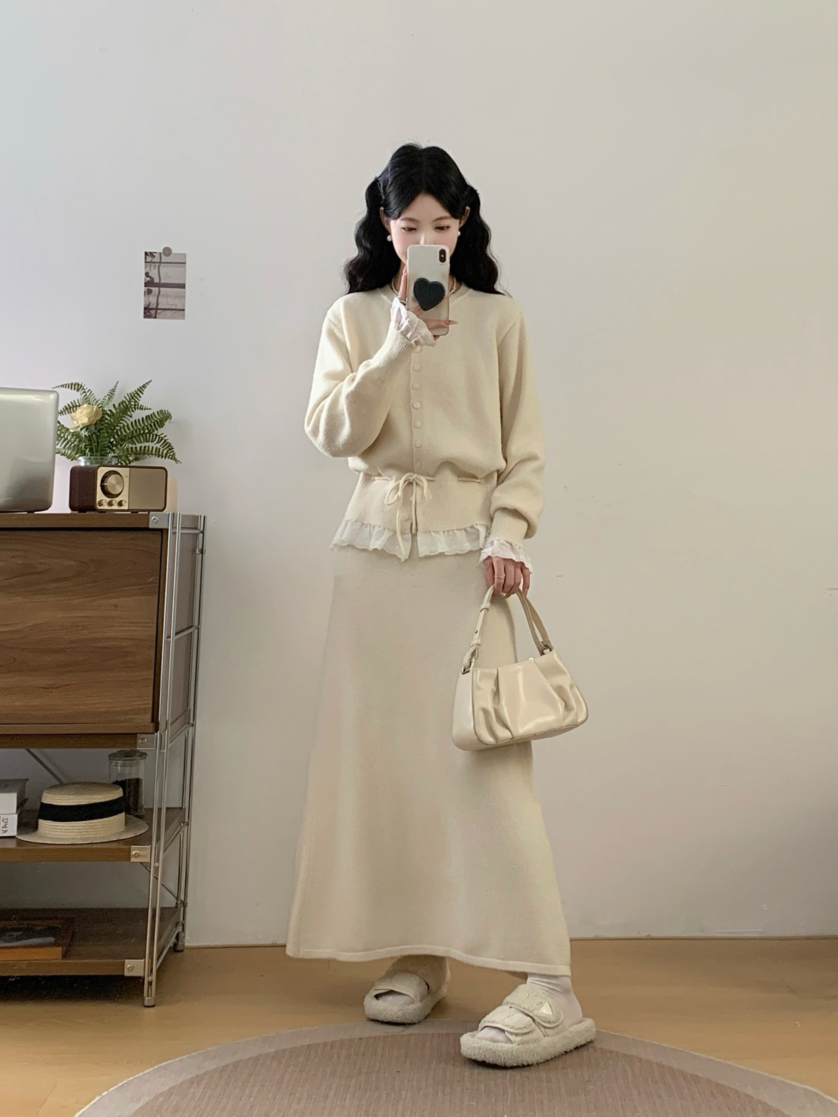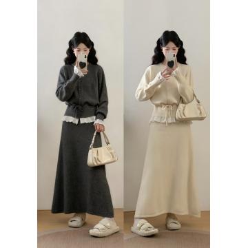 FA48350# 荷叶边拼接圆领毛衣外套甜美宽松胖MM针织厚开衫半身裙套装 服裝批發女裝批發服飾貨源