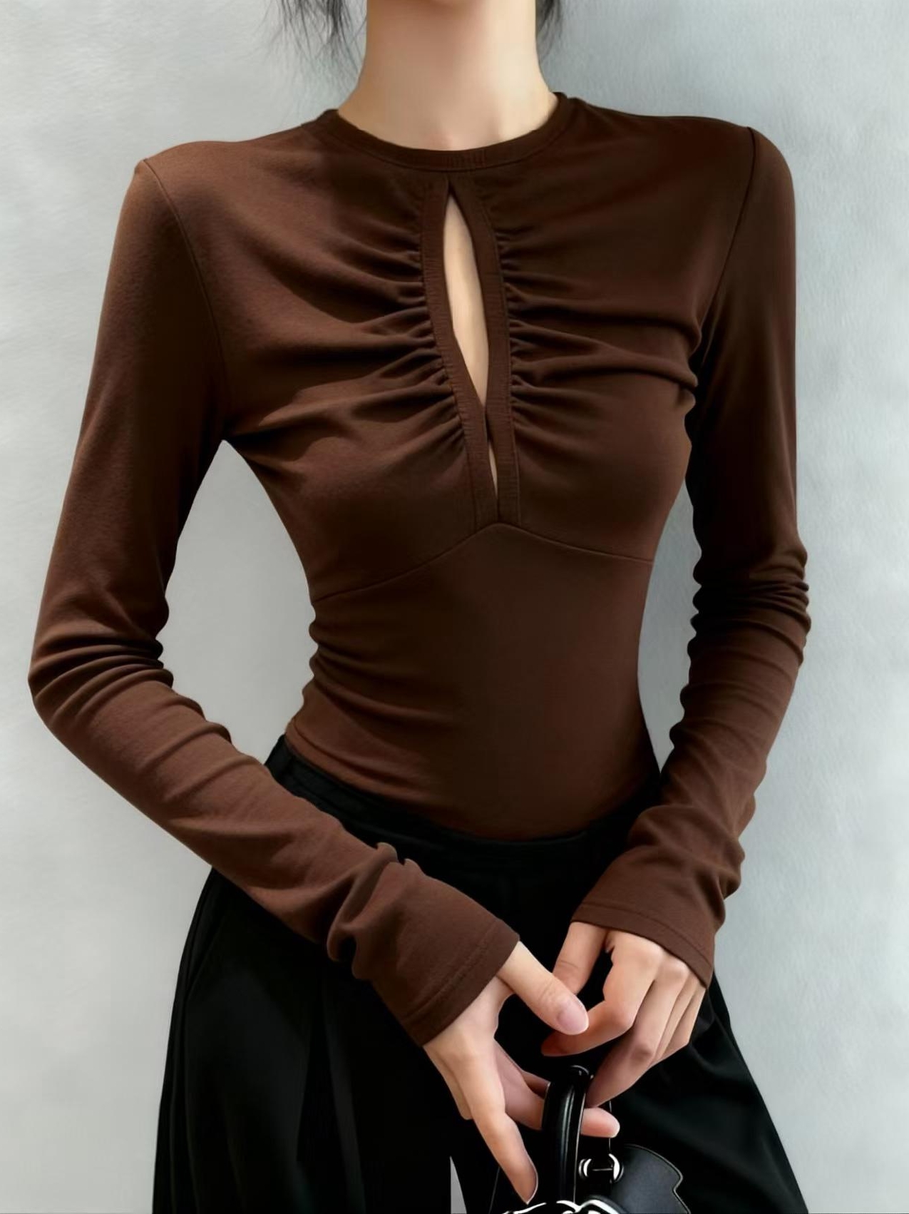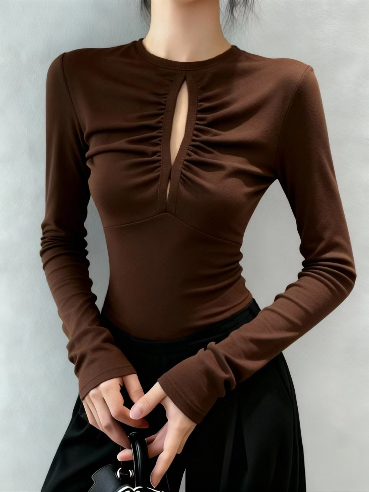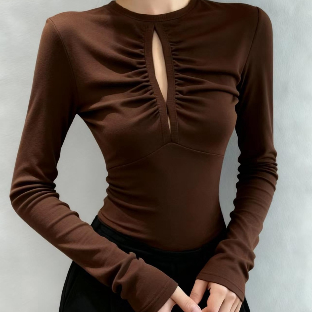 FA48435# 秋冬纯欲甜辣妹镂空修身显瘦圆领上衣女时尚气质百搭长袖上衣 服裝批發女裝批發服飾貨源