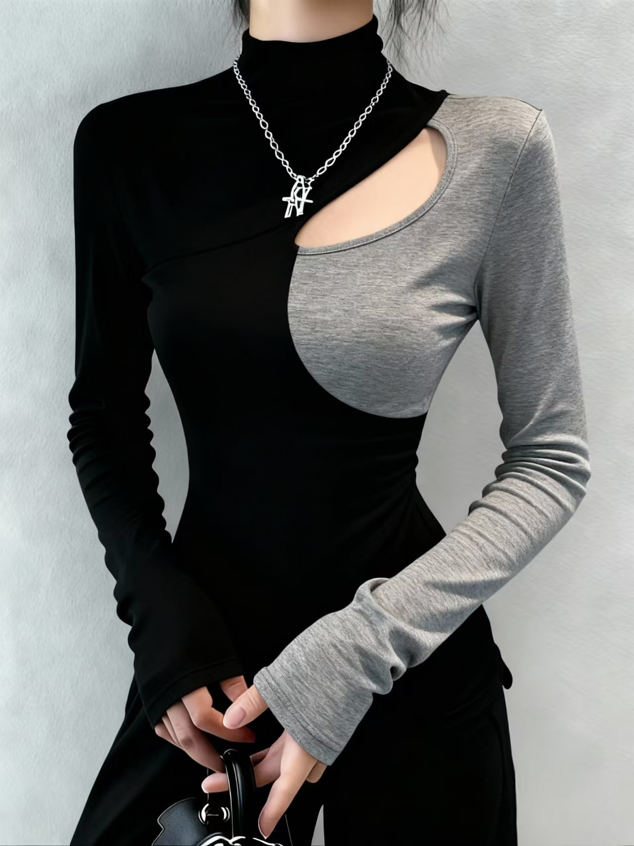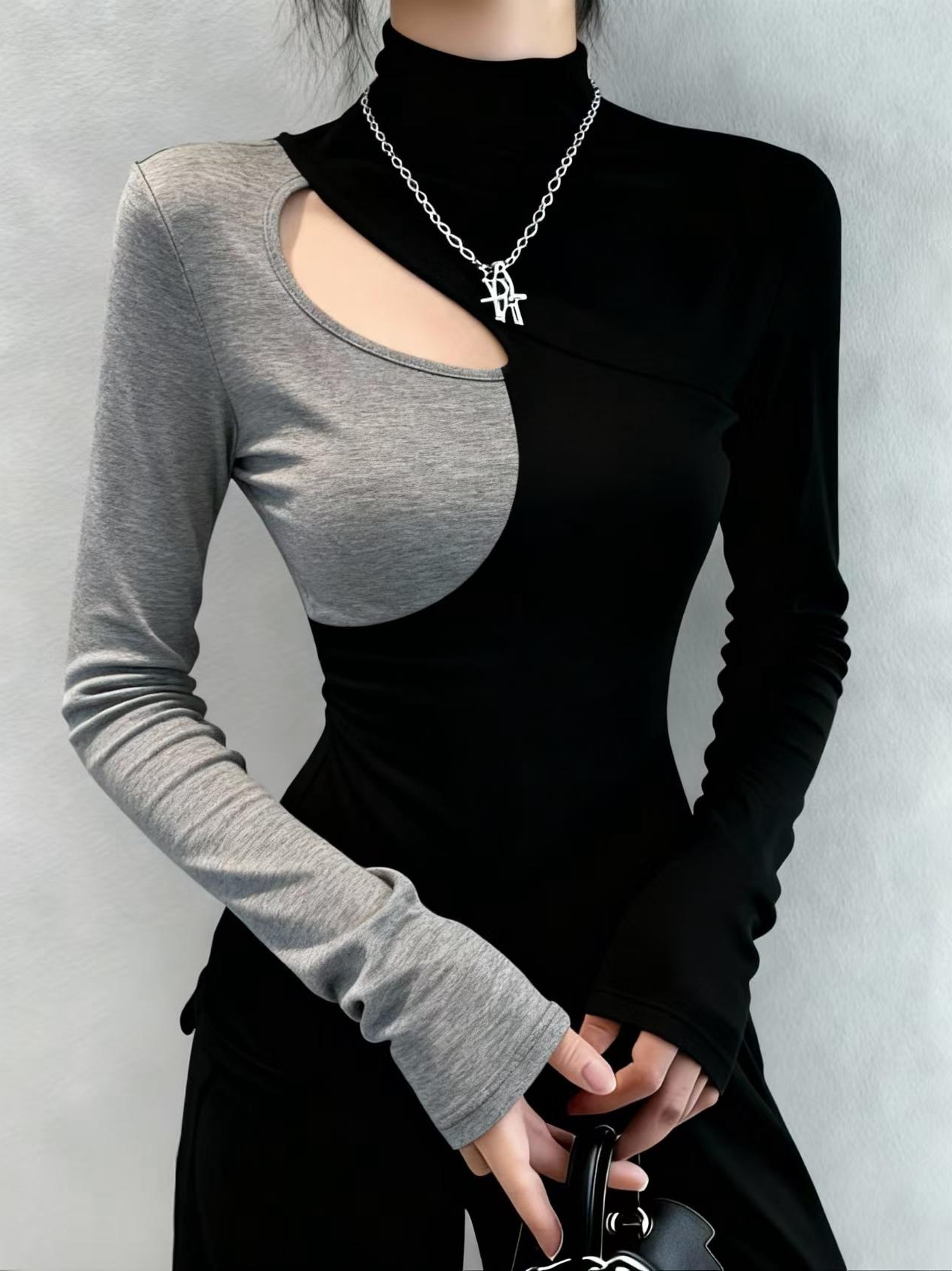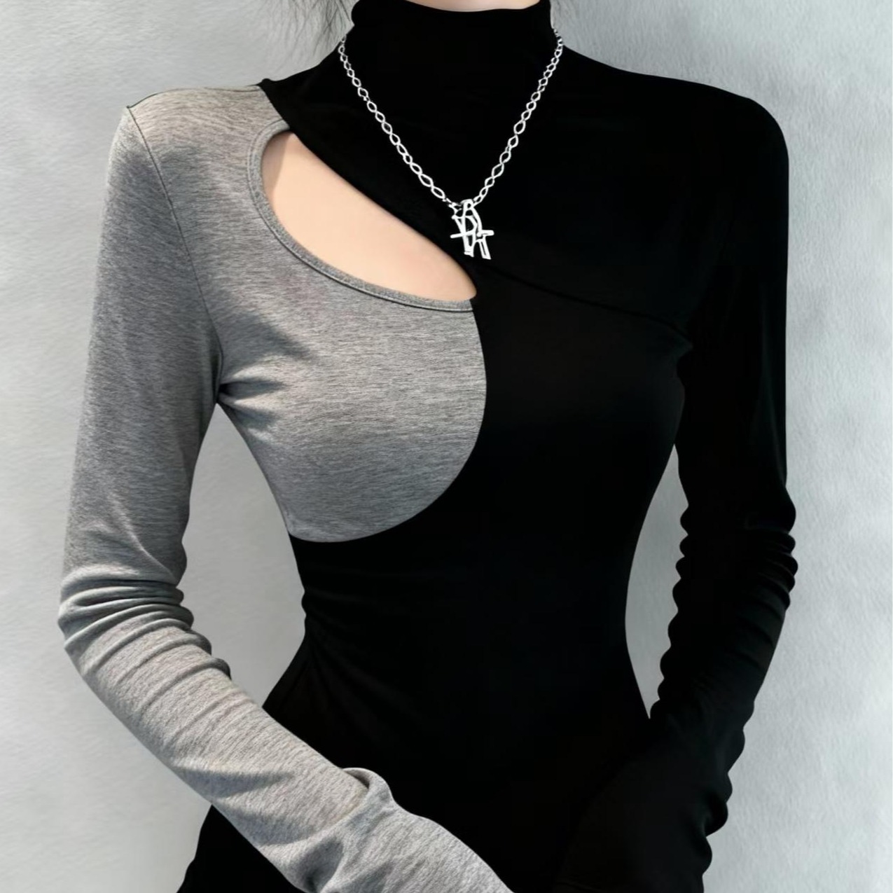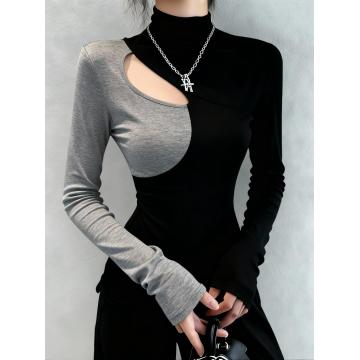 FA48439# 秋冬季时尚半高领镂空拼色长袖T恤女气质修身显瘦百搭上衣女 服裝批發女裝批發服飾貨源