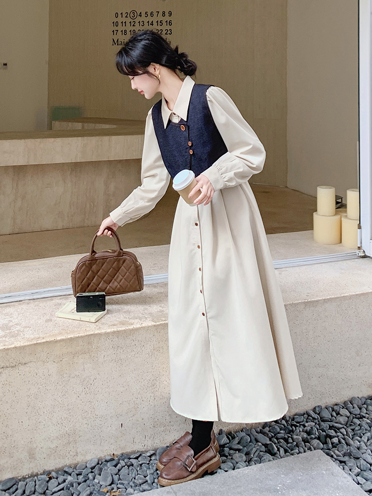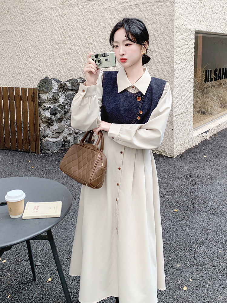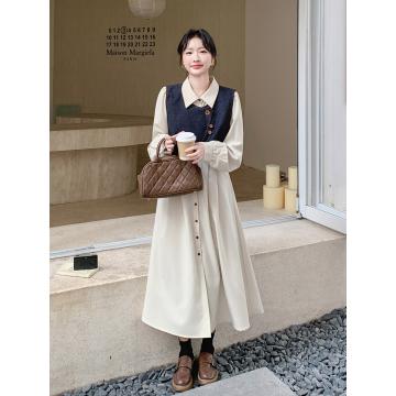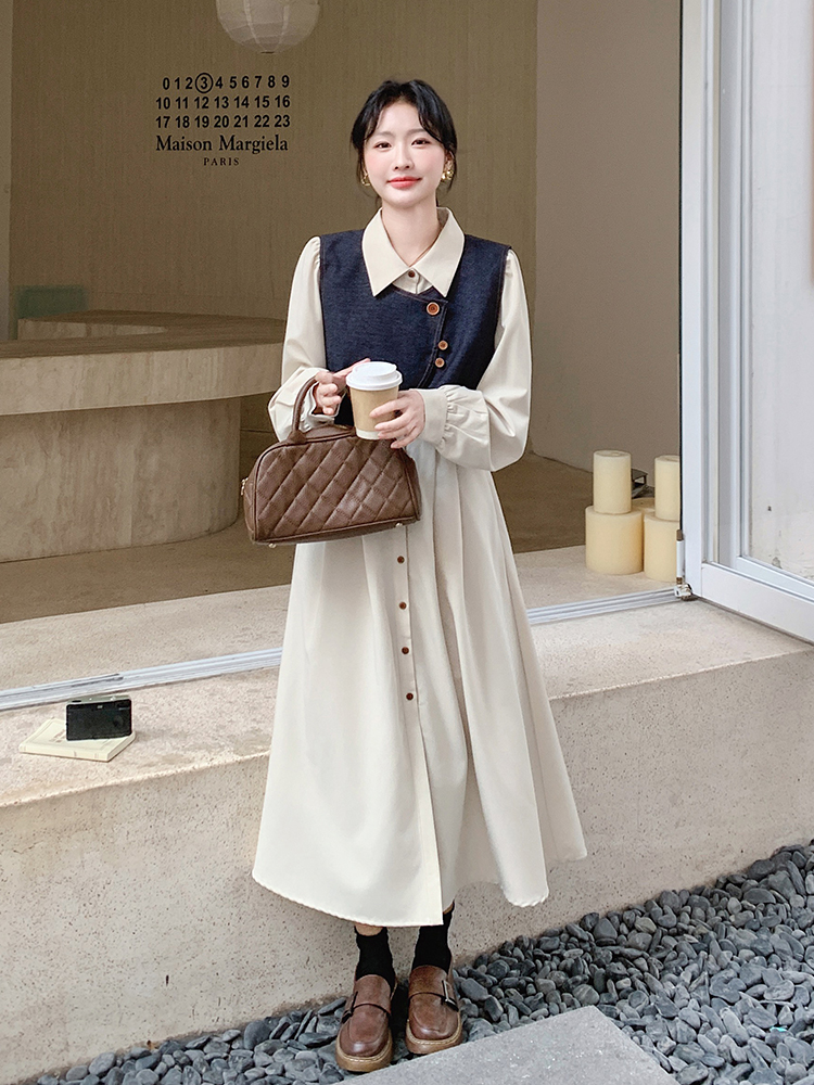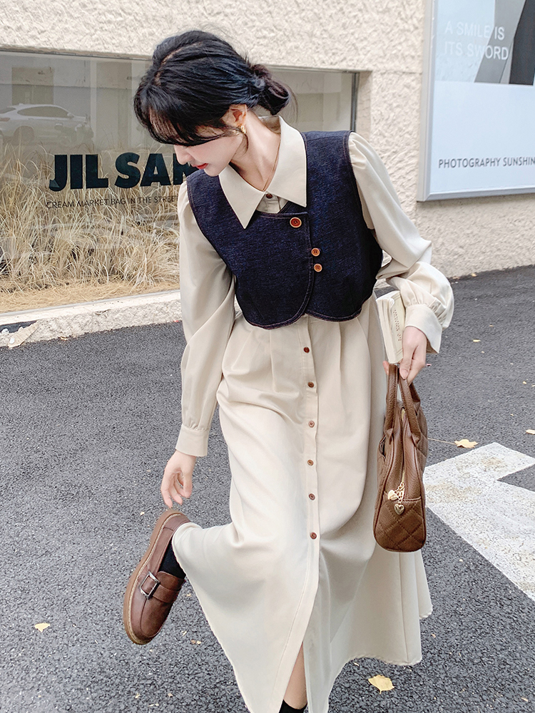 FA48445# 秋季新款法式气质穿搭牛仔马甲连衣裙套装女衬衫裙超火两件套 服裝批發女裝批發服飾貨源