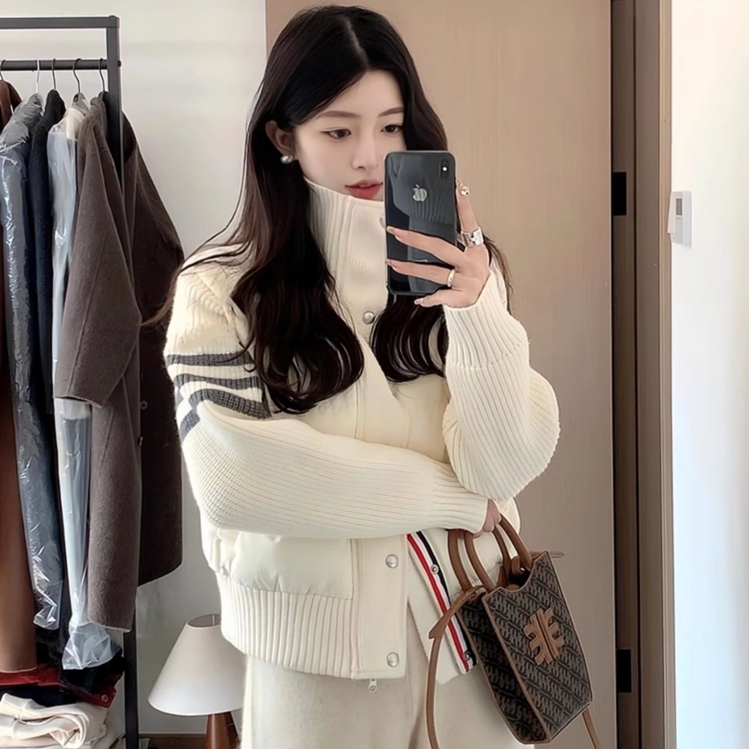 FA48479# 韩系学院风设计感拼接针织棉服男女秋冬独特别致立领轻薄棉衣外套 服裝批發女裝批發服飾貨源