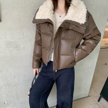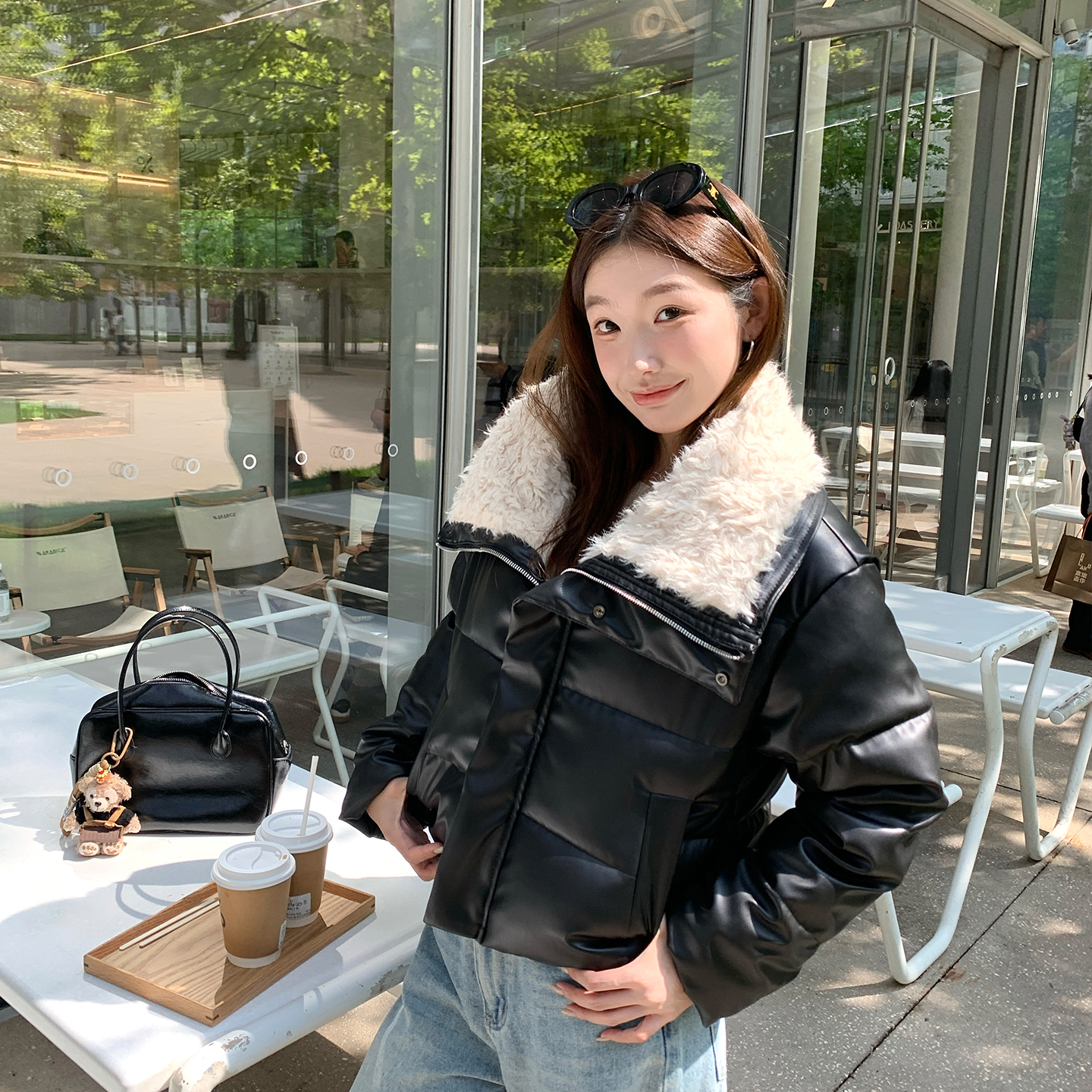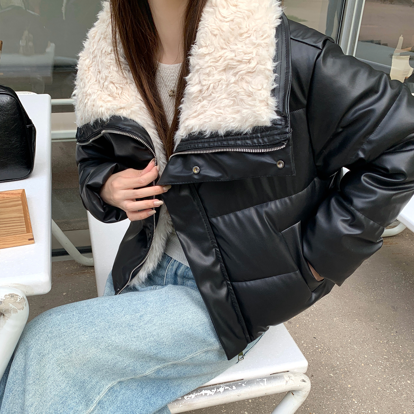 FA48486# 冬新款羊羔毛大翻领韩系宽松短款女PU皮时尚棉服外套 服裝批發女裝批發服飾貨源