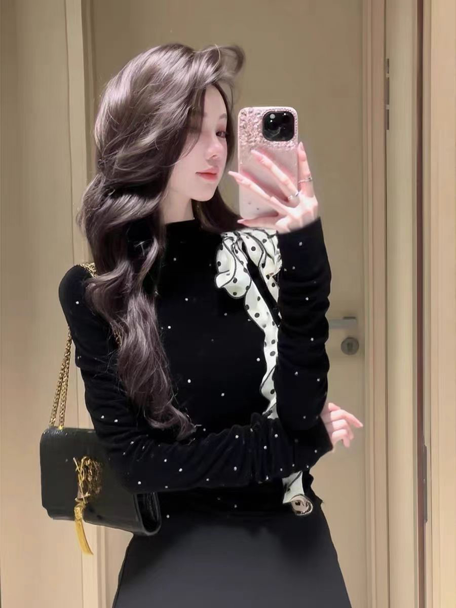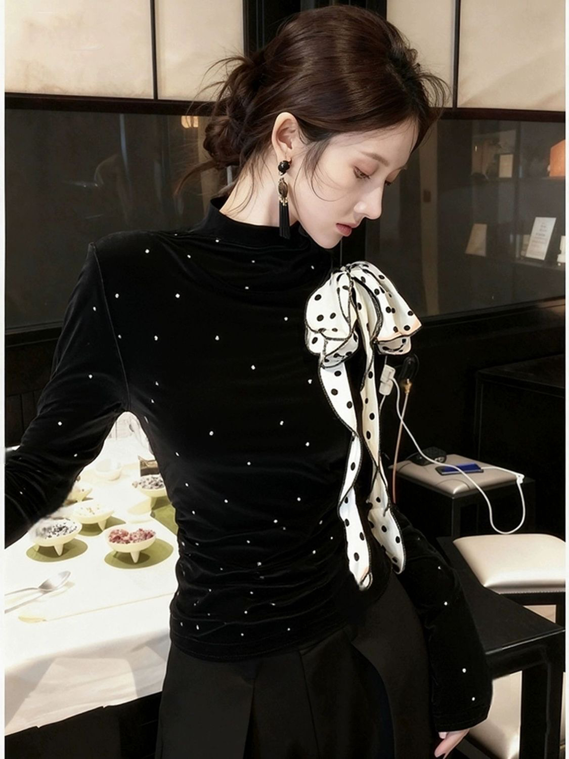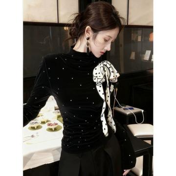 法式蝴蝶结绑带长袖丝绒T恤女秋冬黑色波点褶皱修身复古打底上衣 服裝批發女裝批發服飾貨源