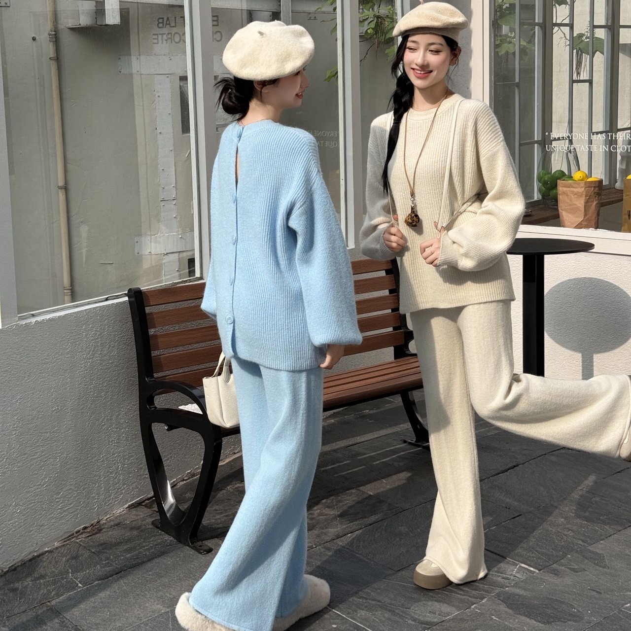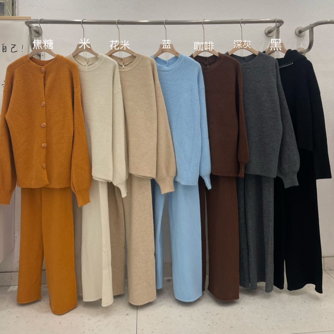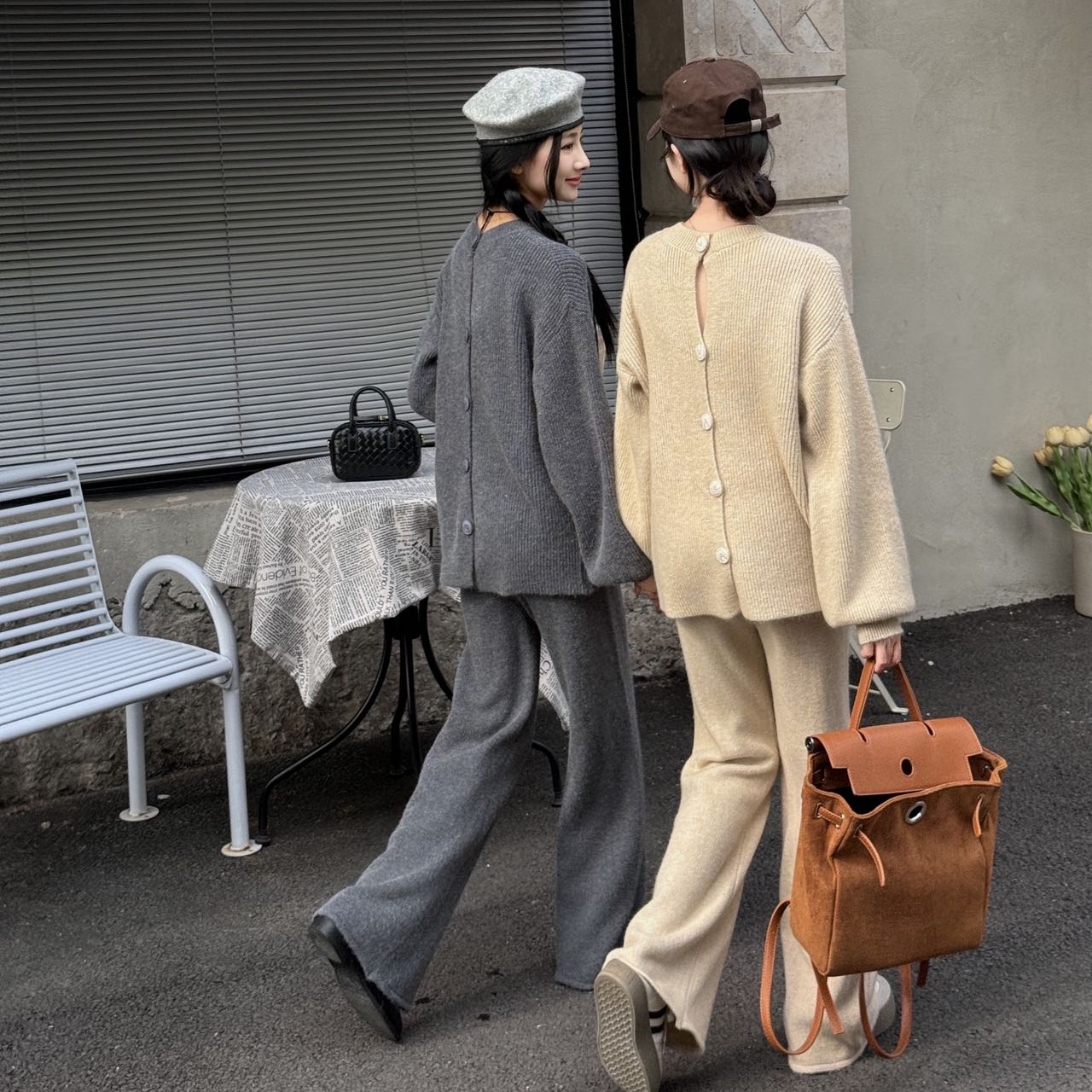 秋冬韩系背后纽扣设计感休闲慵懒风百搭时尚宽松阔腿裤套装女 服裝批發女裝批發服飾貨源