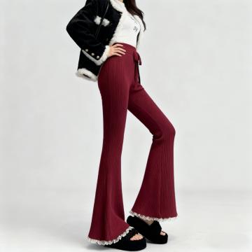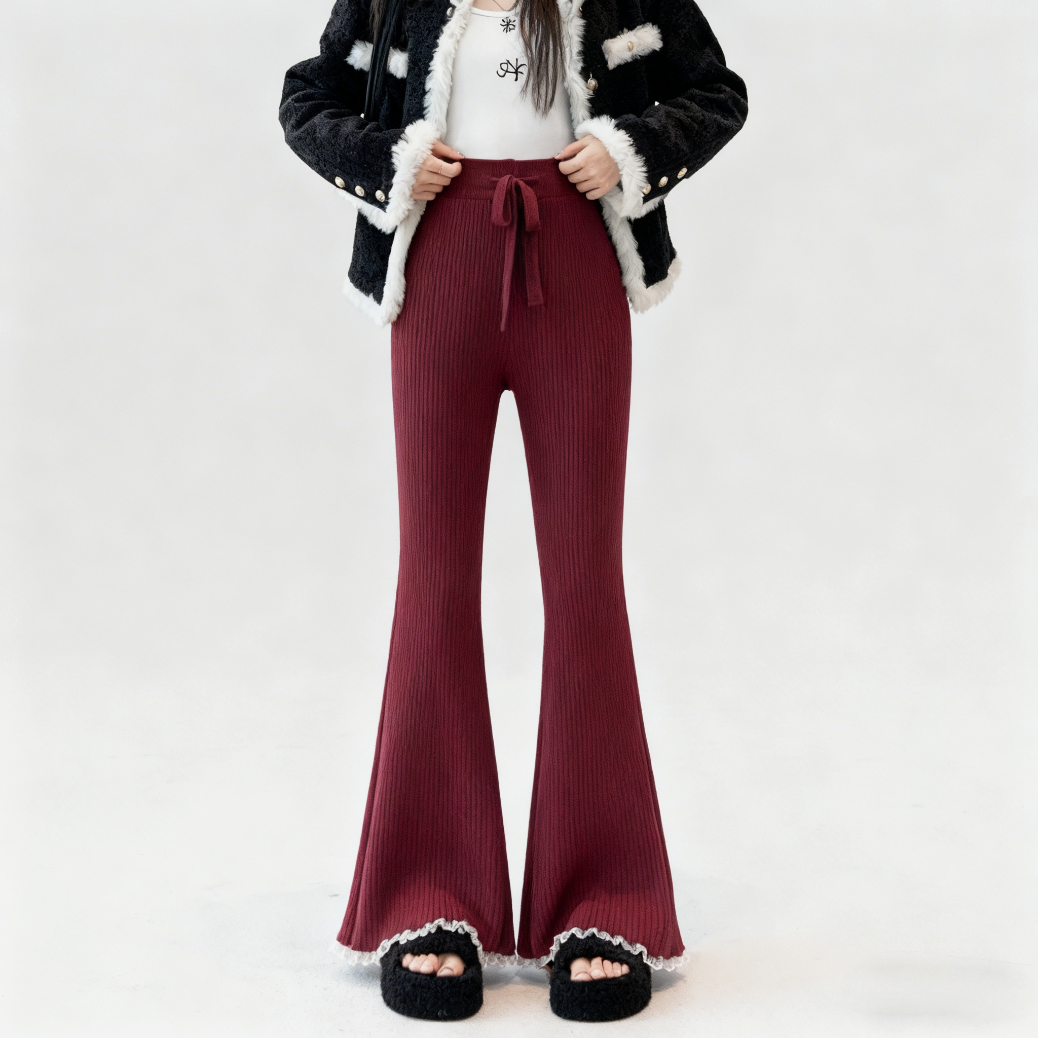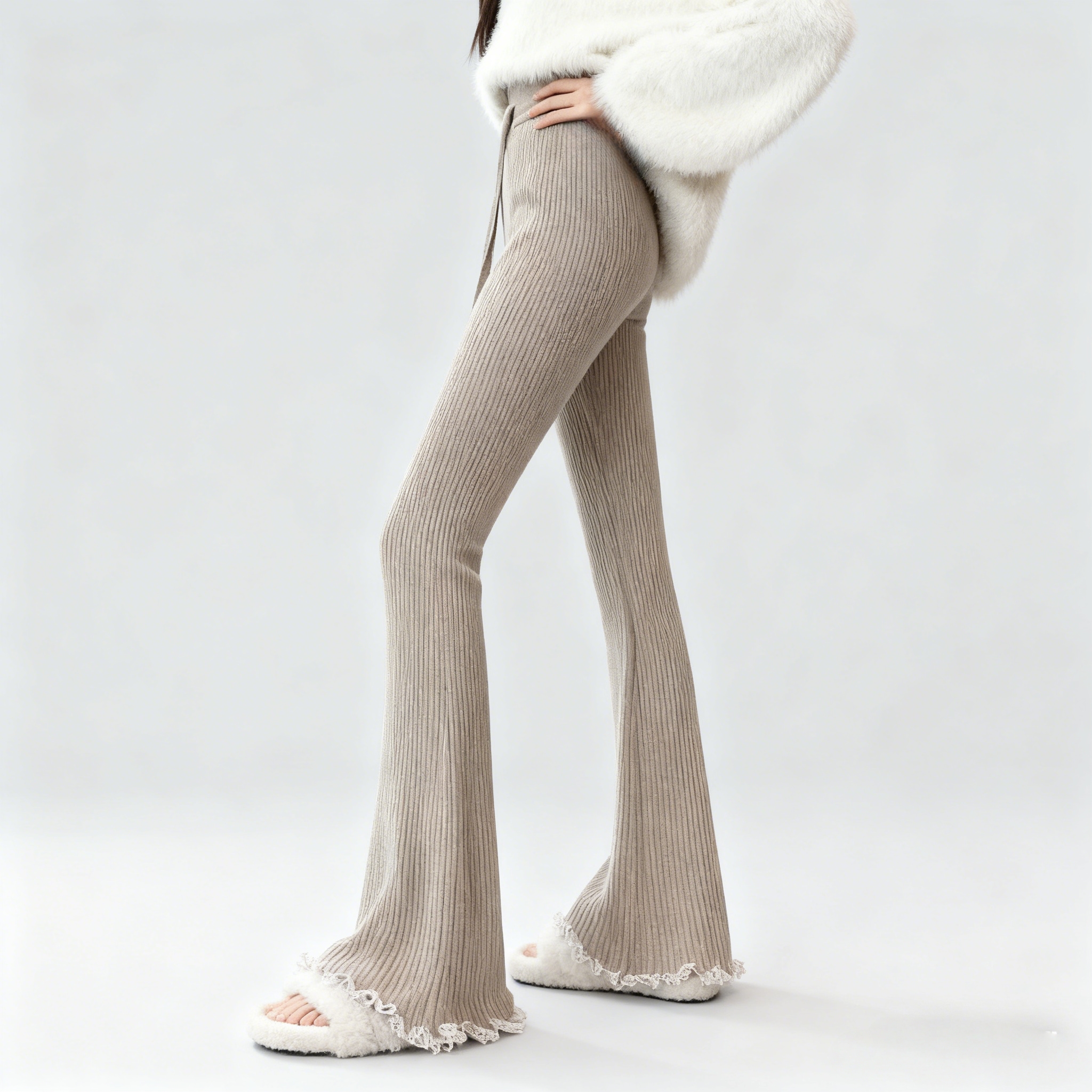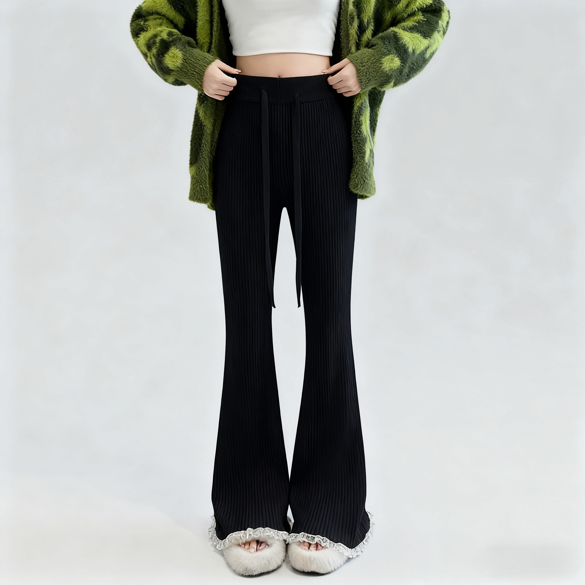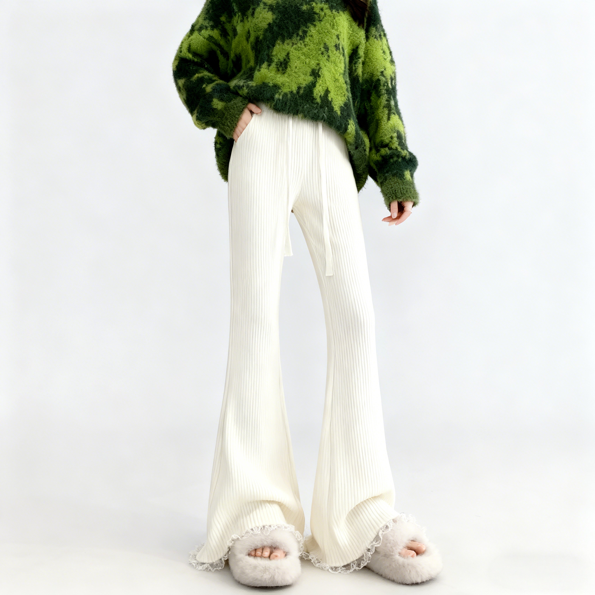 秋冬软糯微喇蕾丝花边针织阔腿裤女竖坑条高腰垂感显瘦拖地裤 服裝批發女裝批發服飾貨源