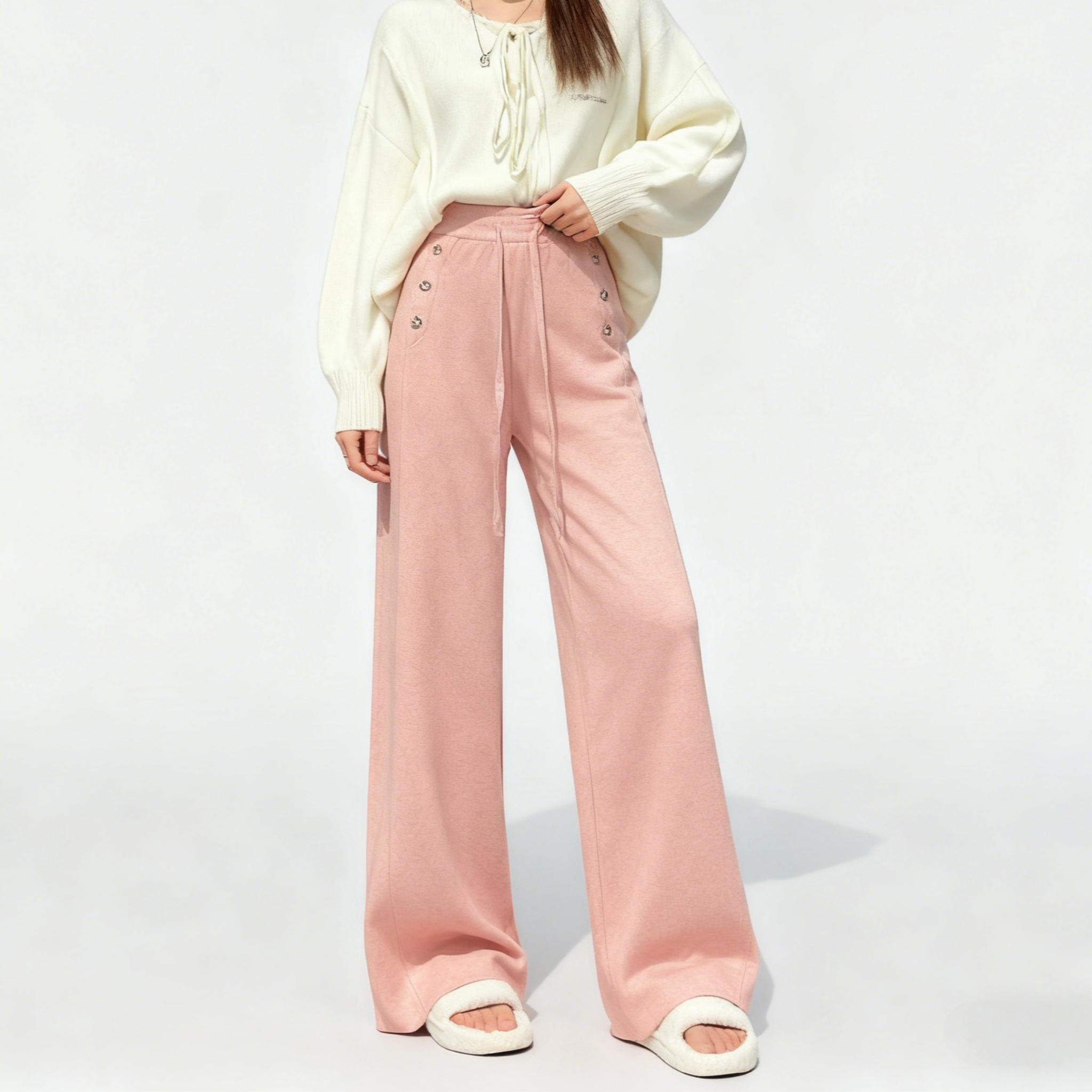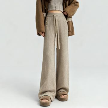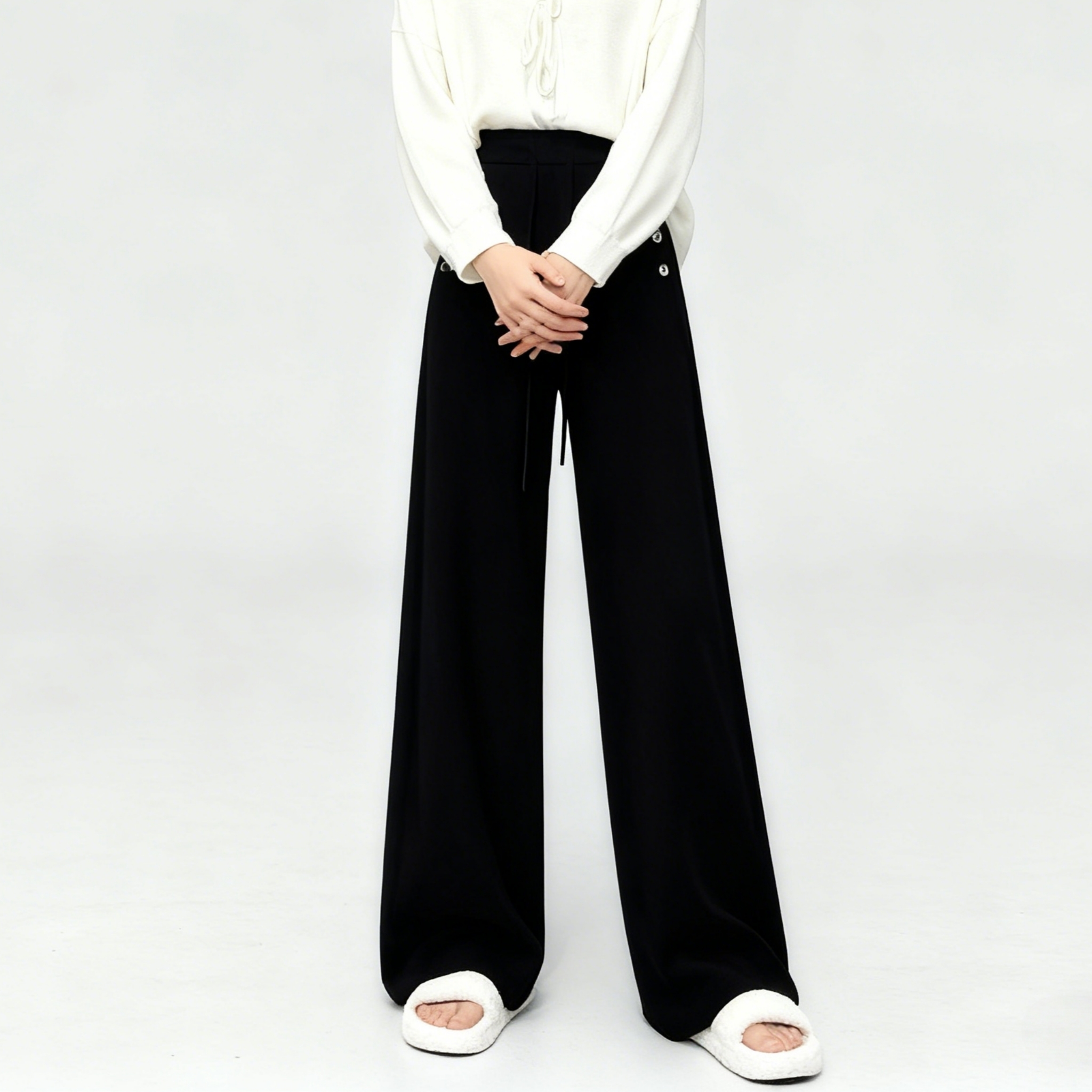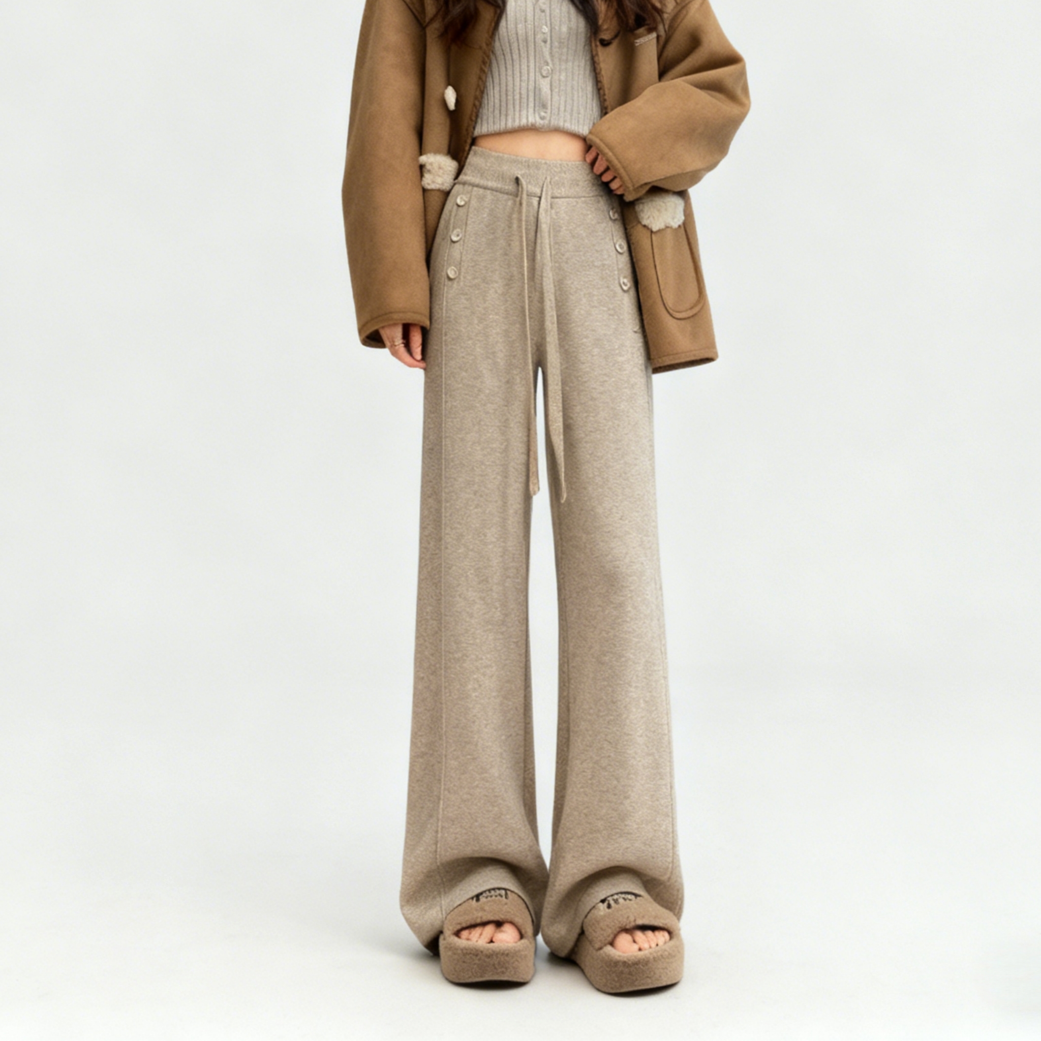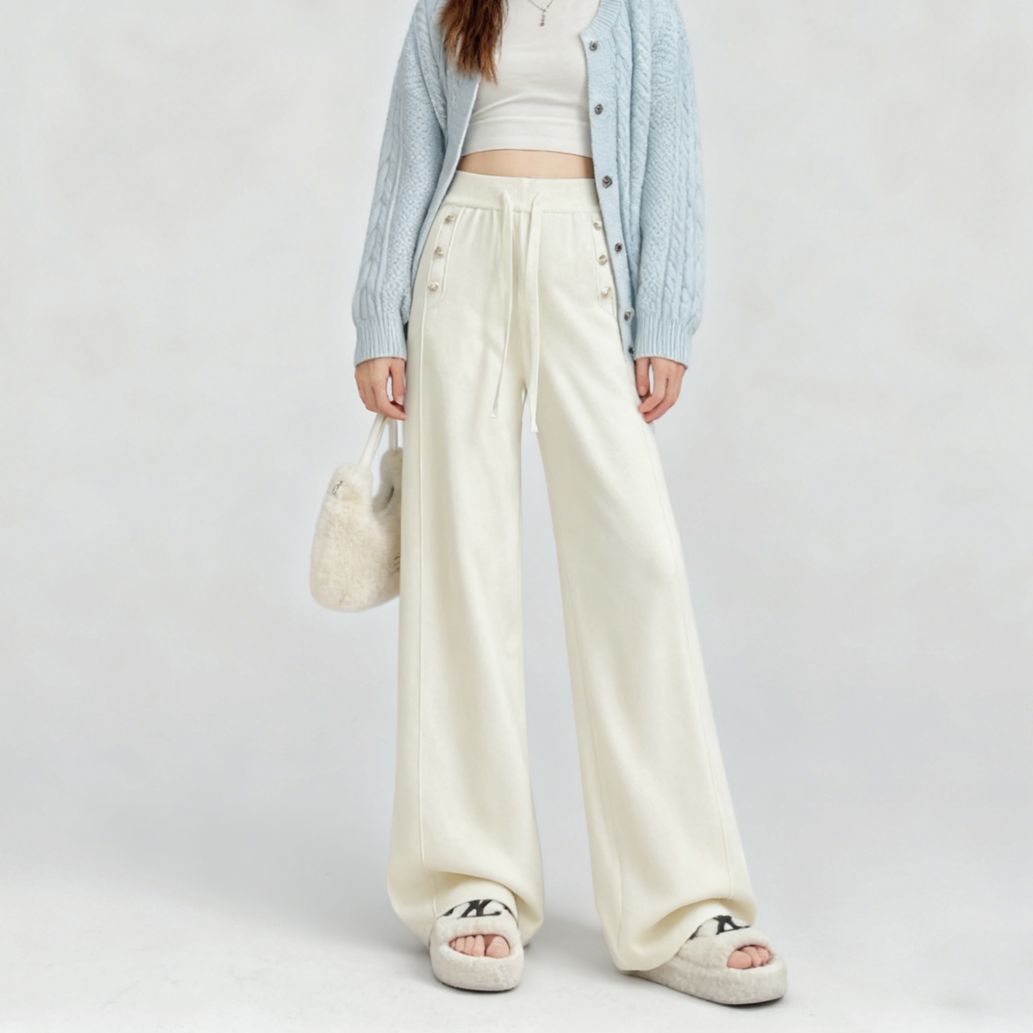 软糯纽扣针织阔腿裤女秋冬韩系垂感高腰抽绳显瘦休闲拖地长裤 服裝批發女裝批發服飾貨源