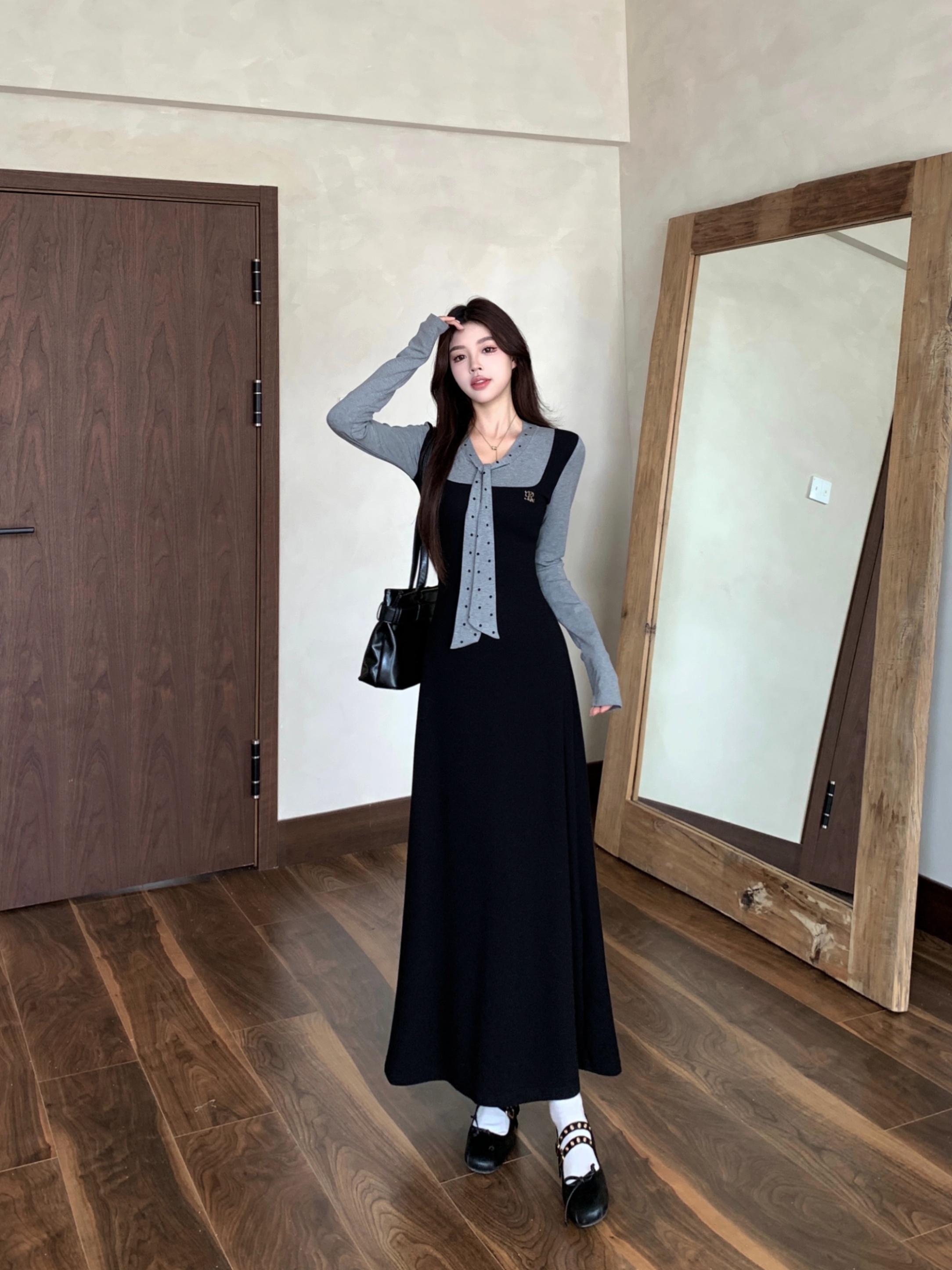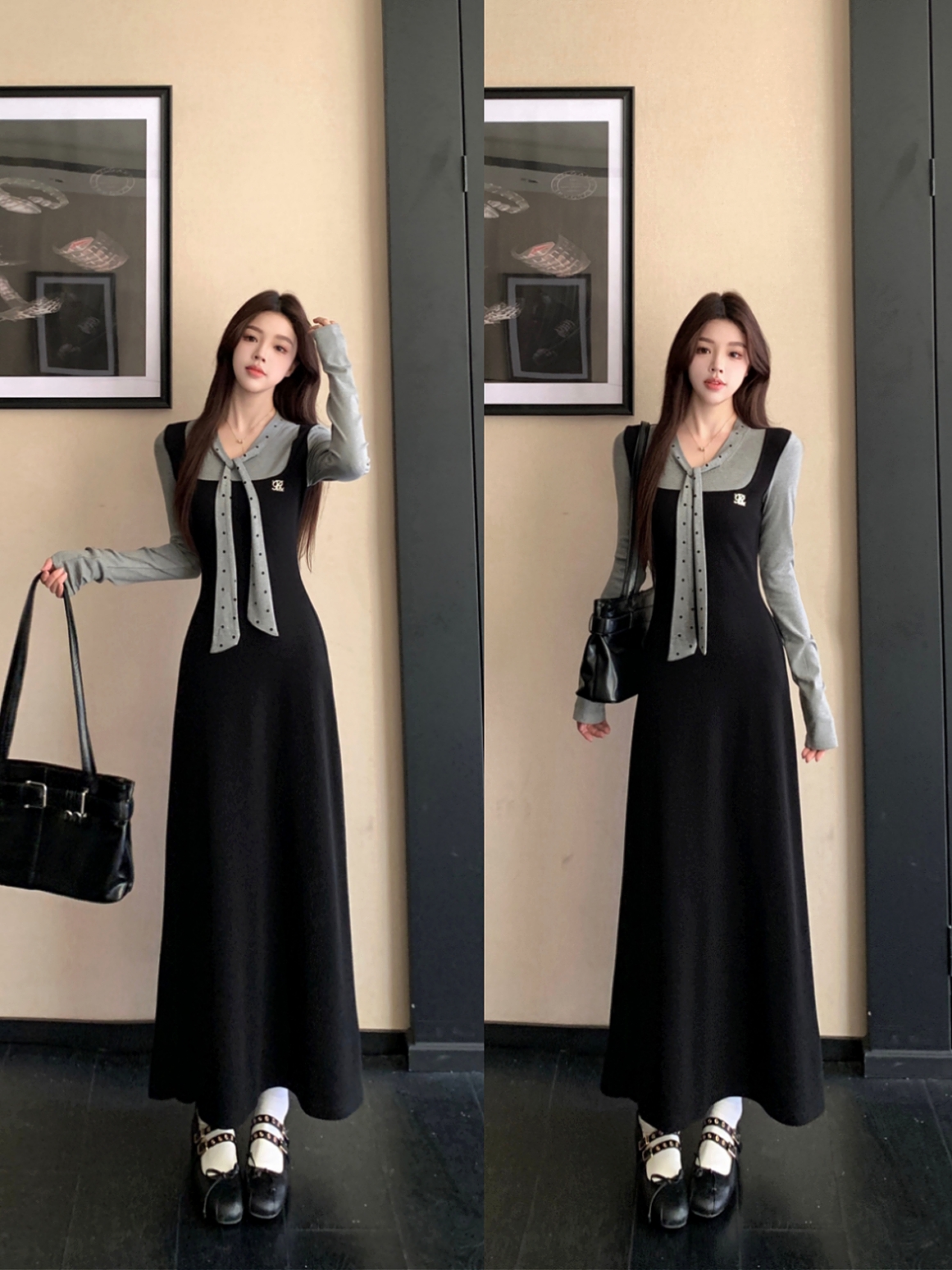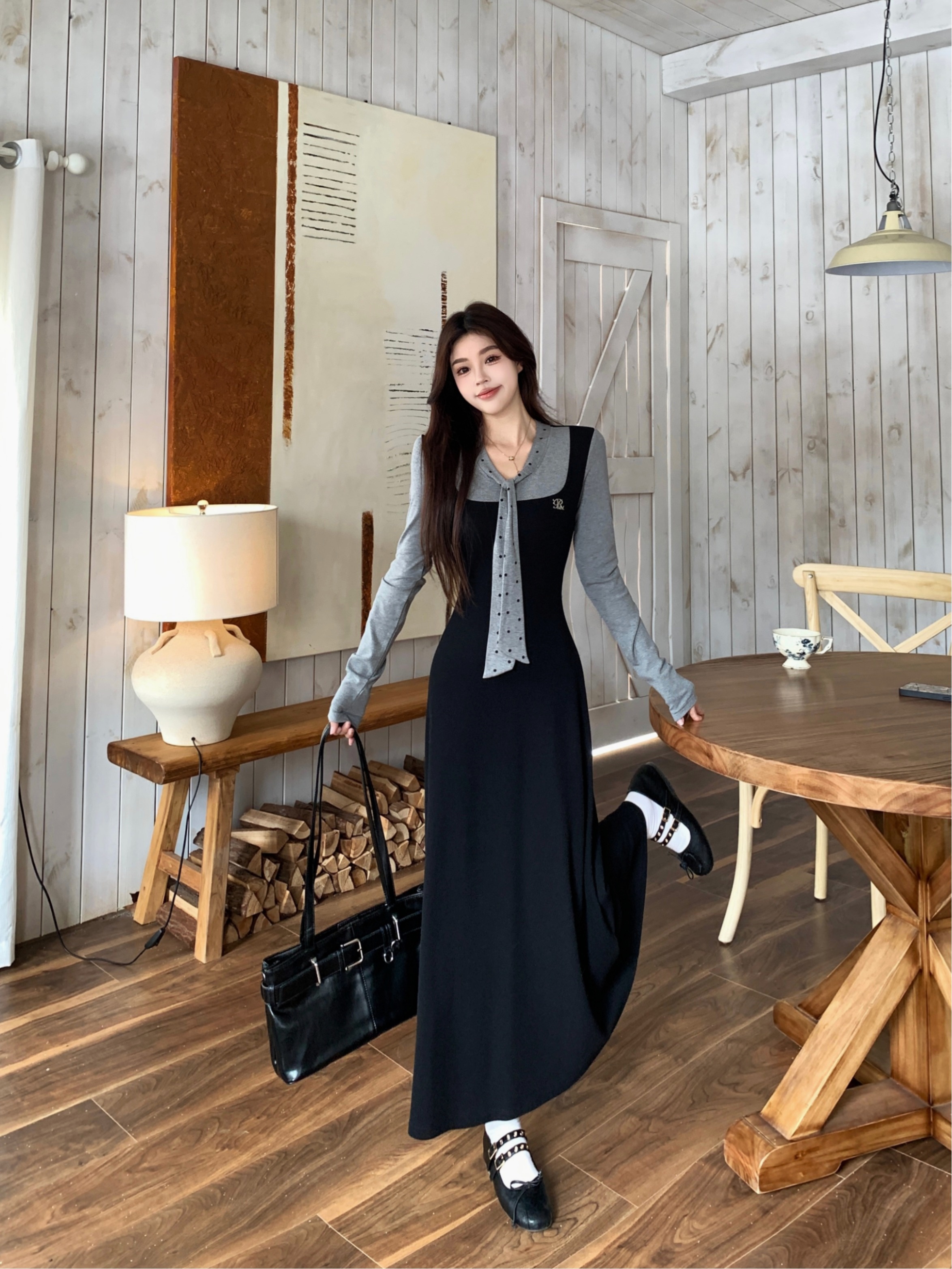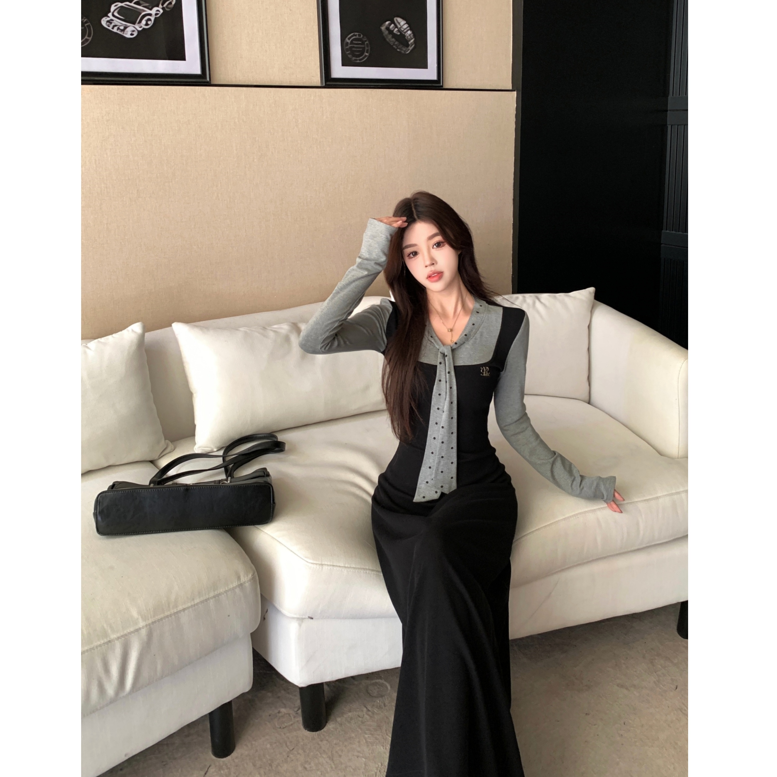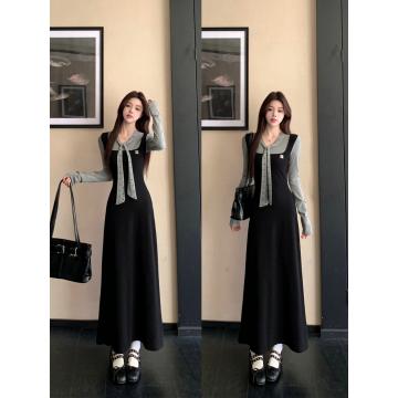 假两件拼接长袖连衣裙女新款收腰法式高级感长裙 服裝批發女裝批發服飾貨源