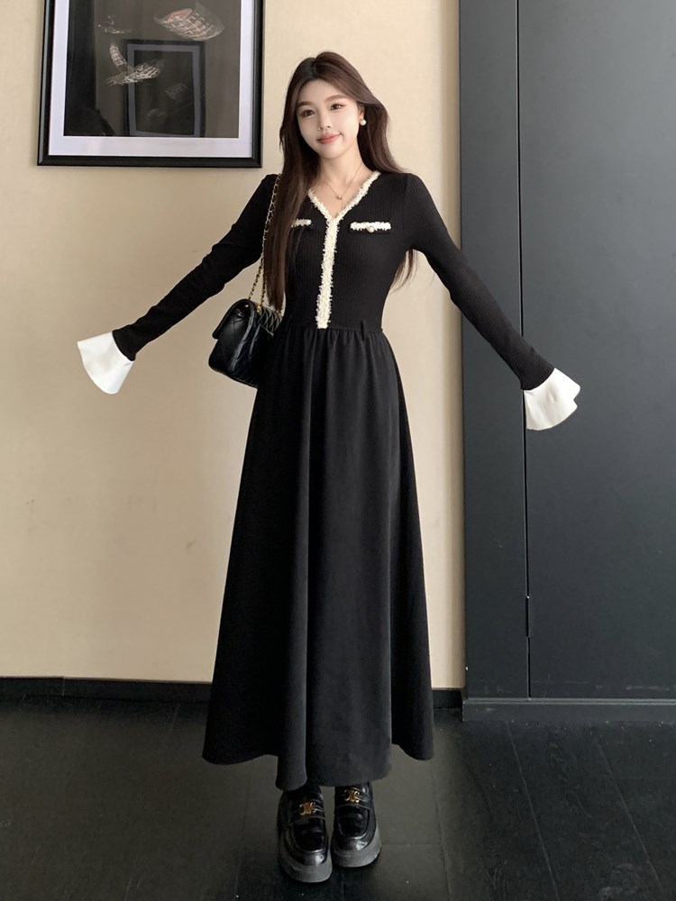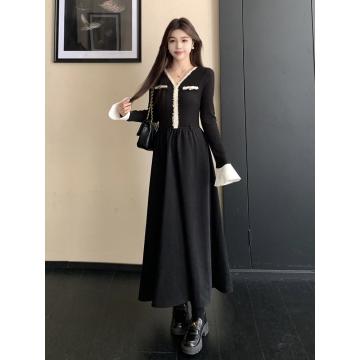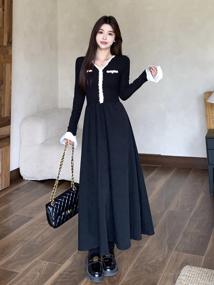秋新款胖mm设计感黑色小香风V领长袖连衣裙显瘦拼色长裙子女 服裝批發女裝批發服飾貨源