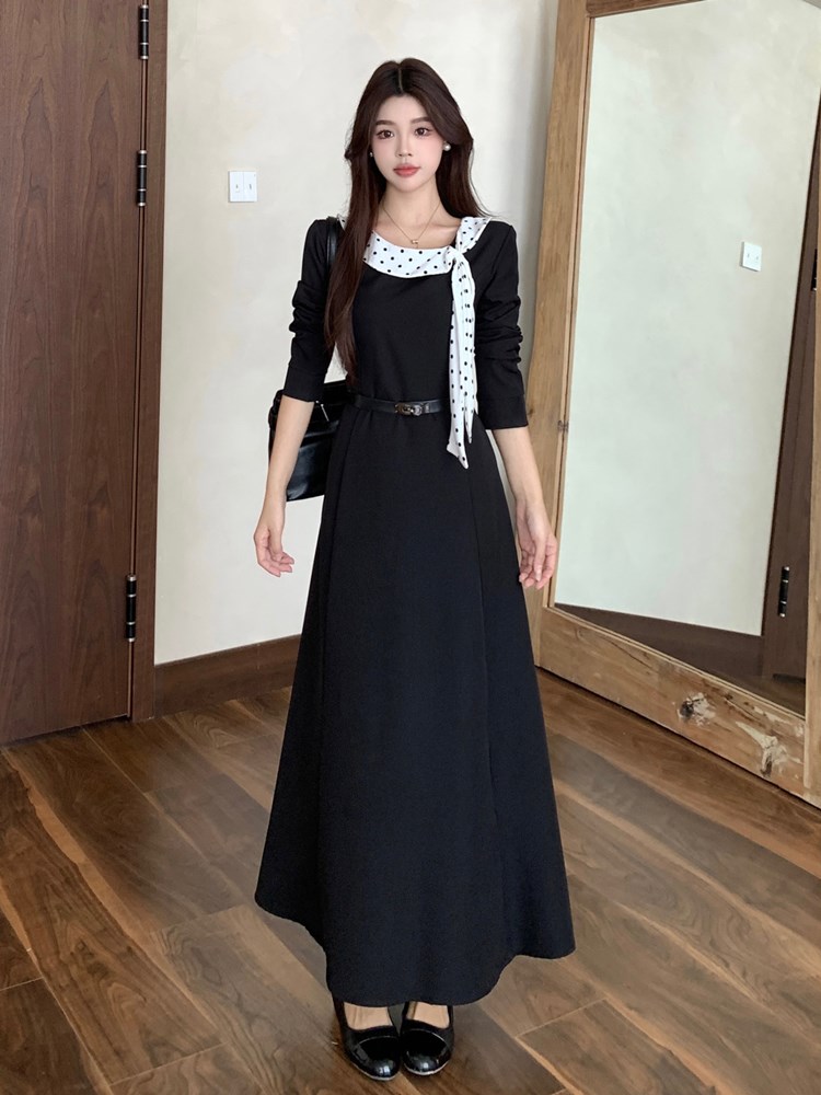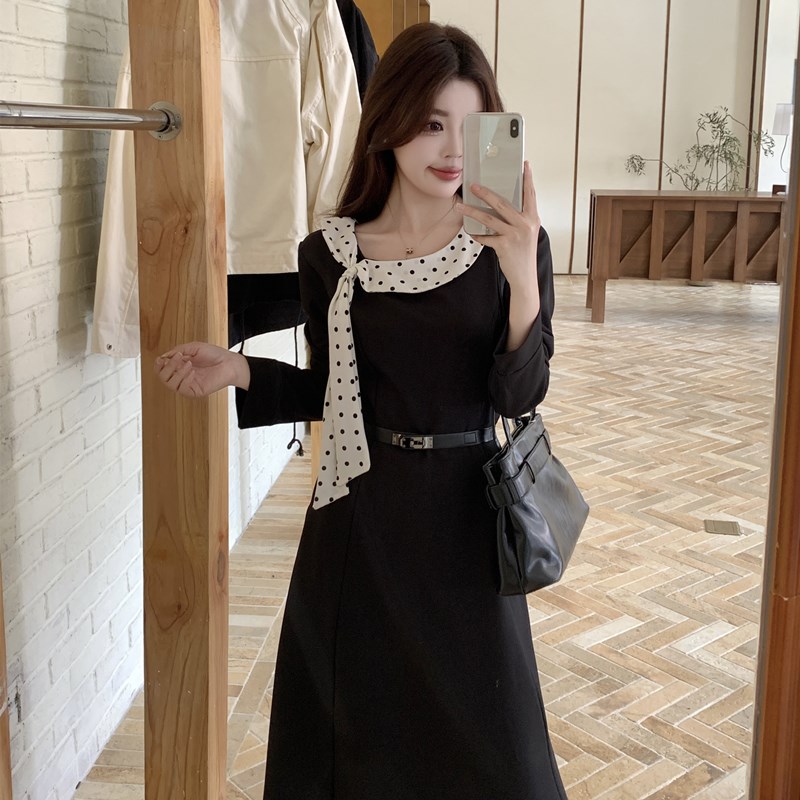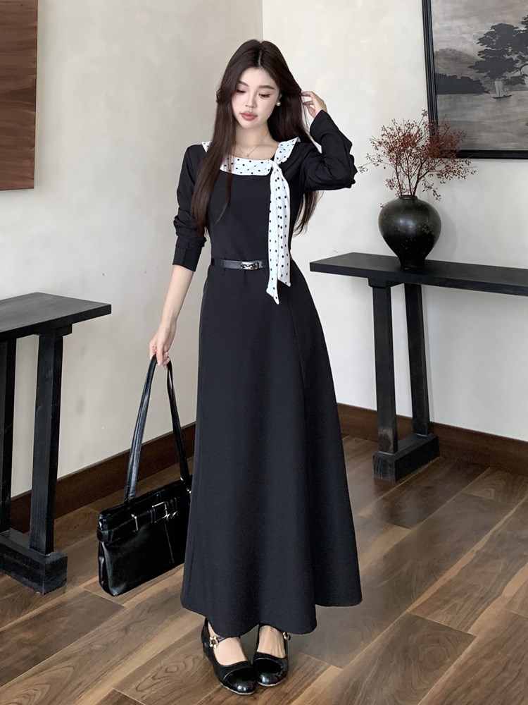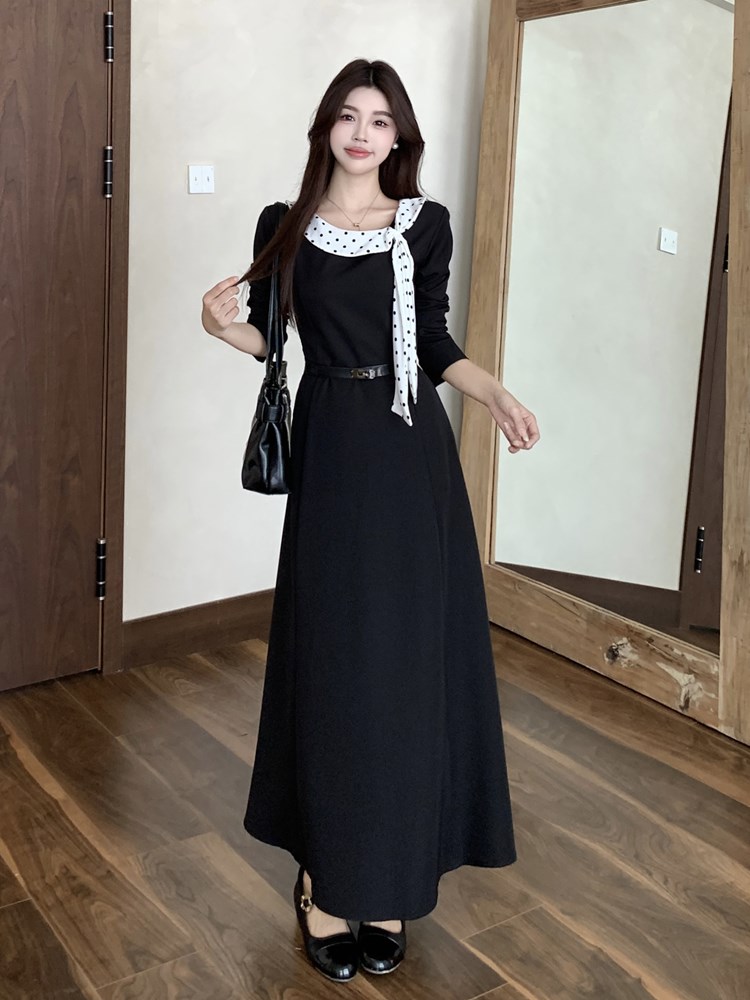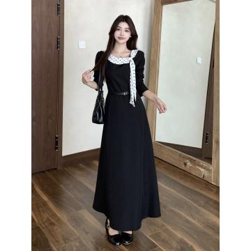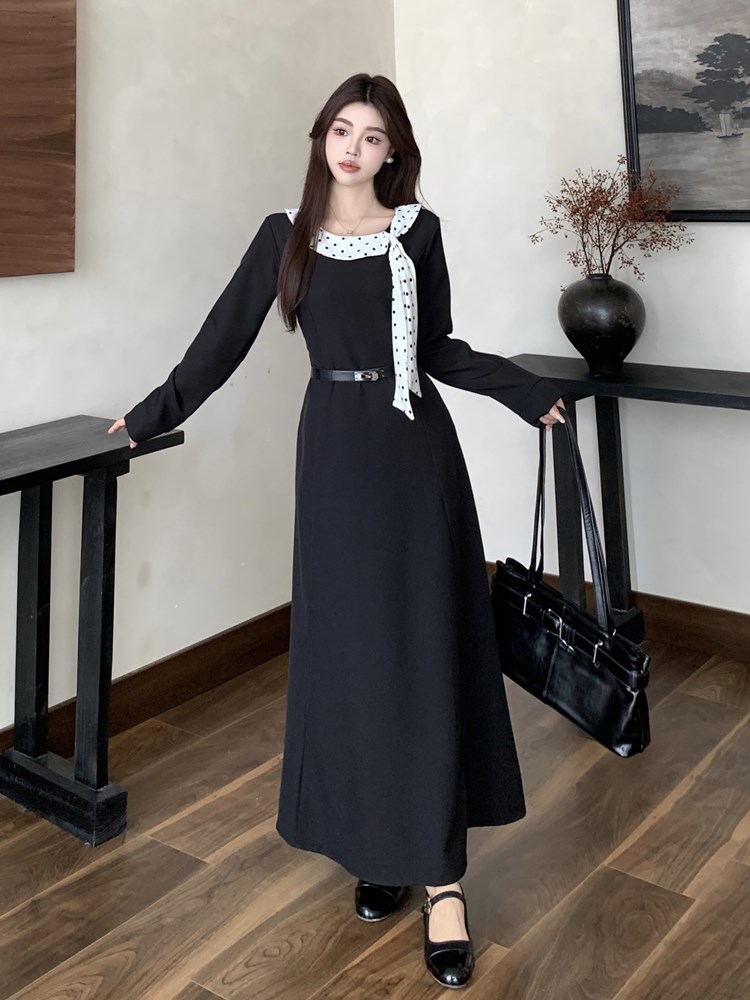 秋胖mm设计感法式气质波点飘带领拼黑色连衣裙女高级感长裙子 服裝批發女裝批發服飾貨源