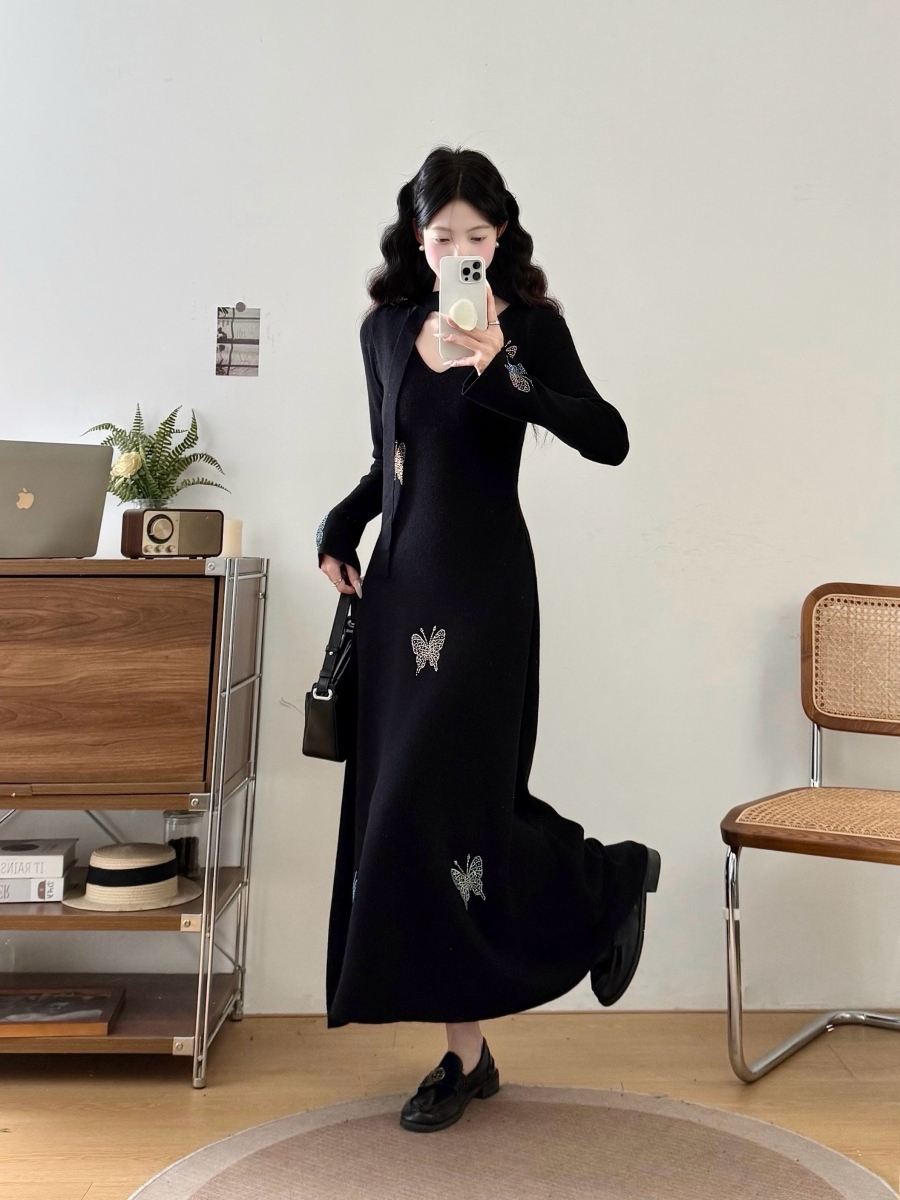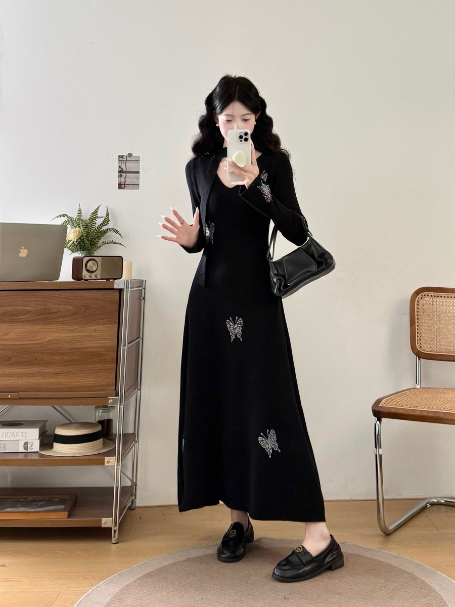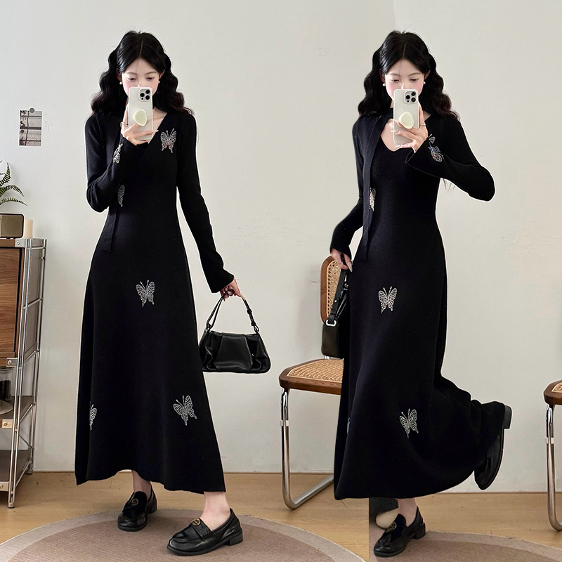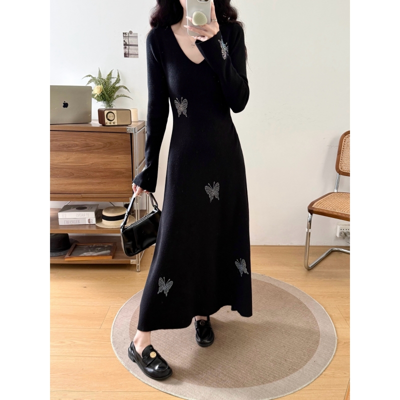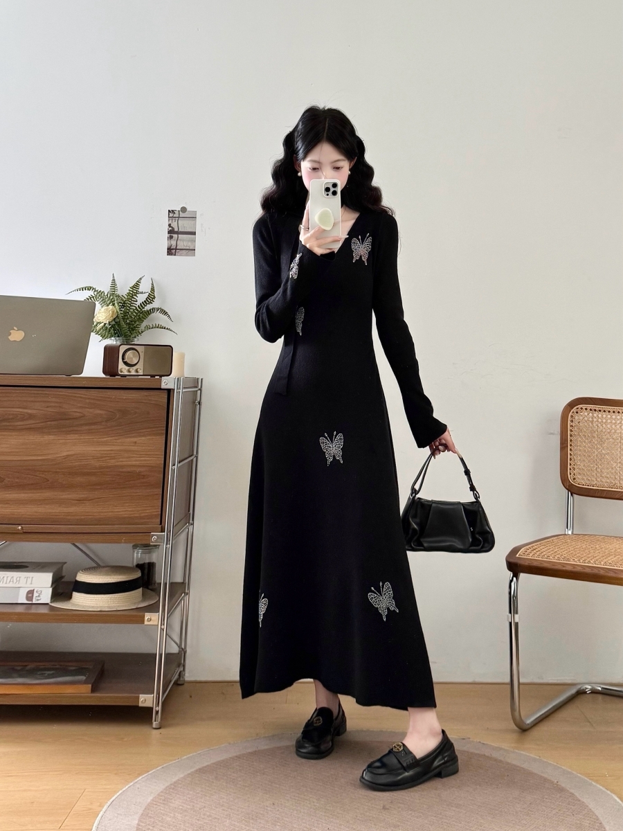 大码女装胖mm秋冬法式赫本风黑色V领烫钻蝴蝶显瘦毛衣连衣裙 服裝批發女裝批發服飾貨源