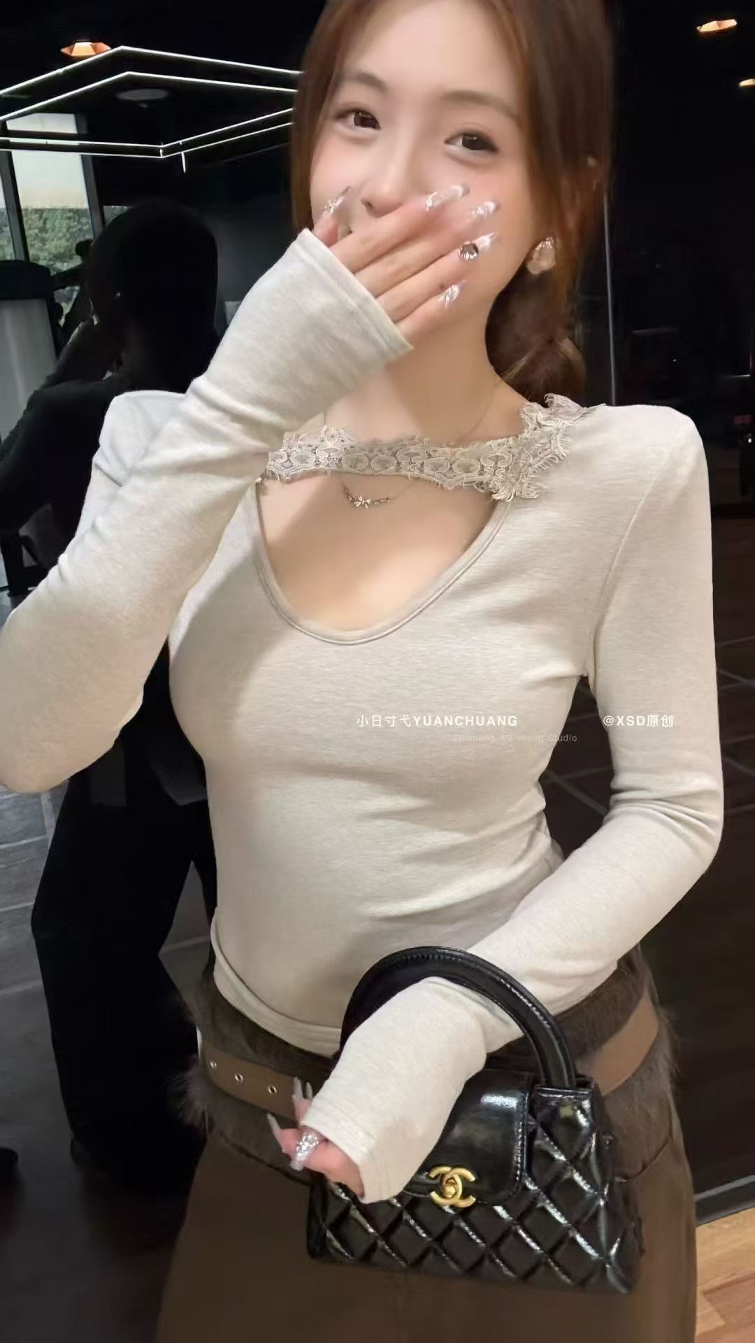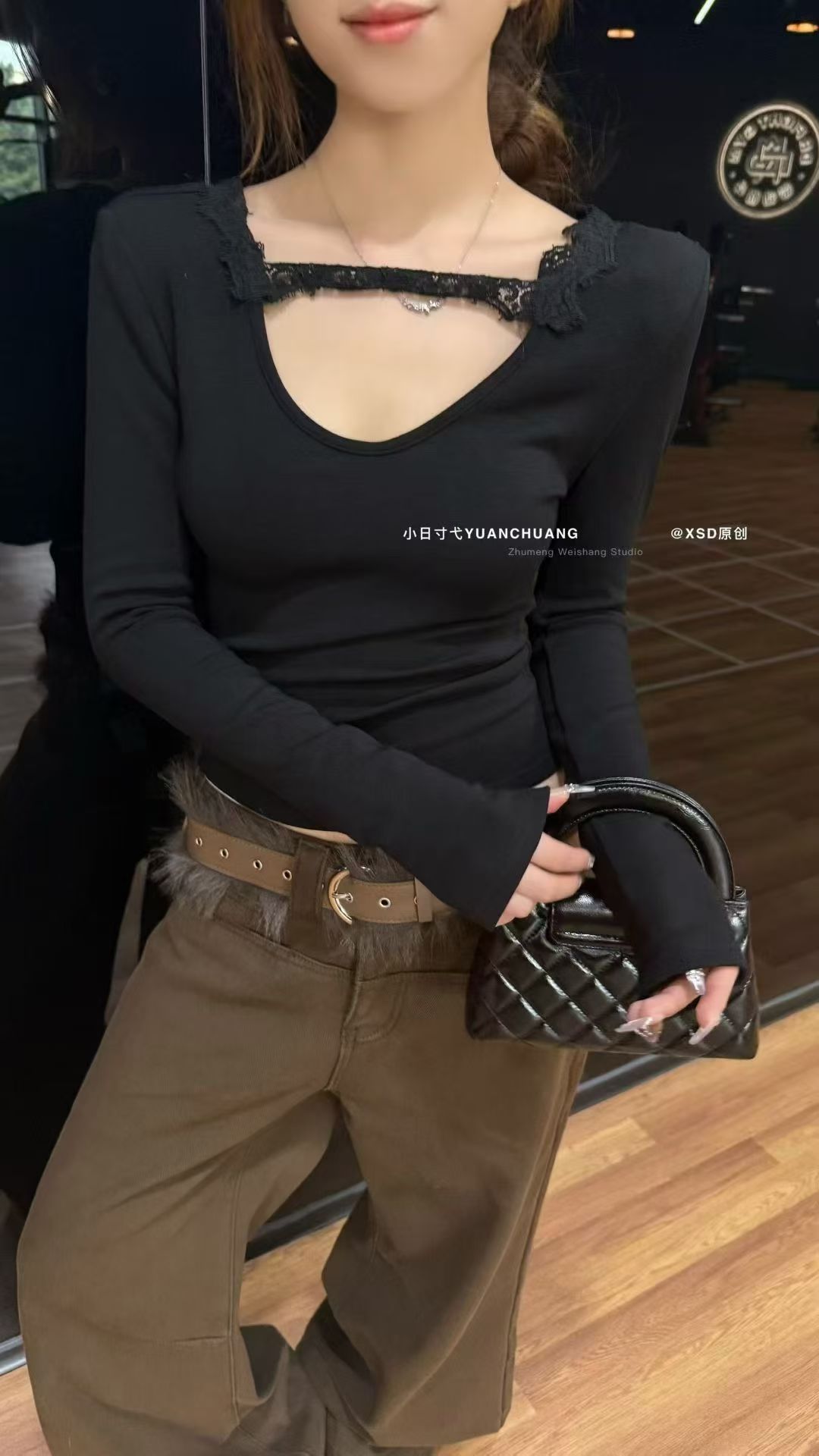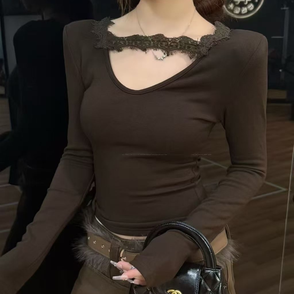 FA49154# 秋冬新款韩版蕾丝拼接V领显瘦T恤百搭磨毛绒打底衫内搭上衣女 服裝批發女裝批發服飾貨源