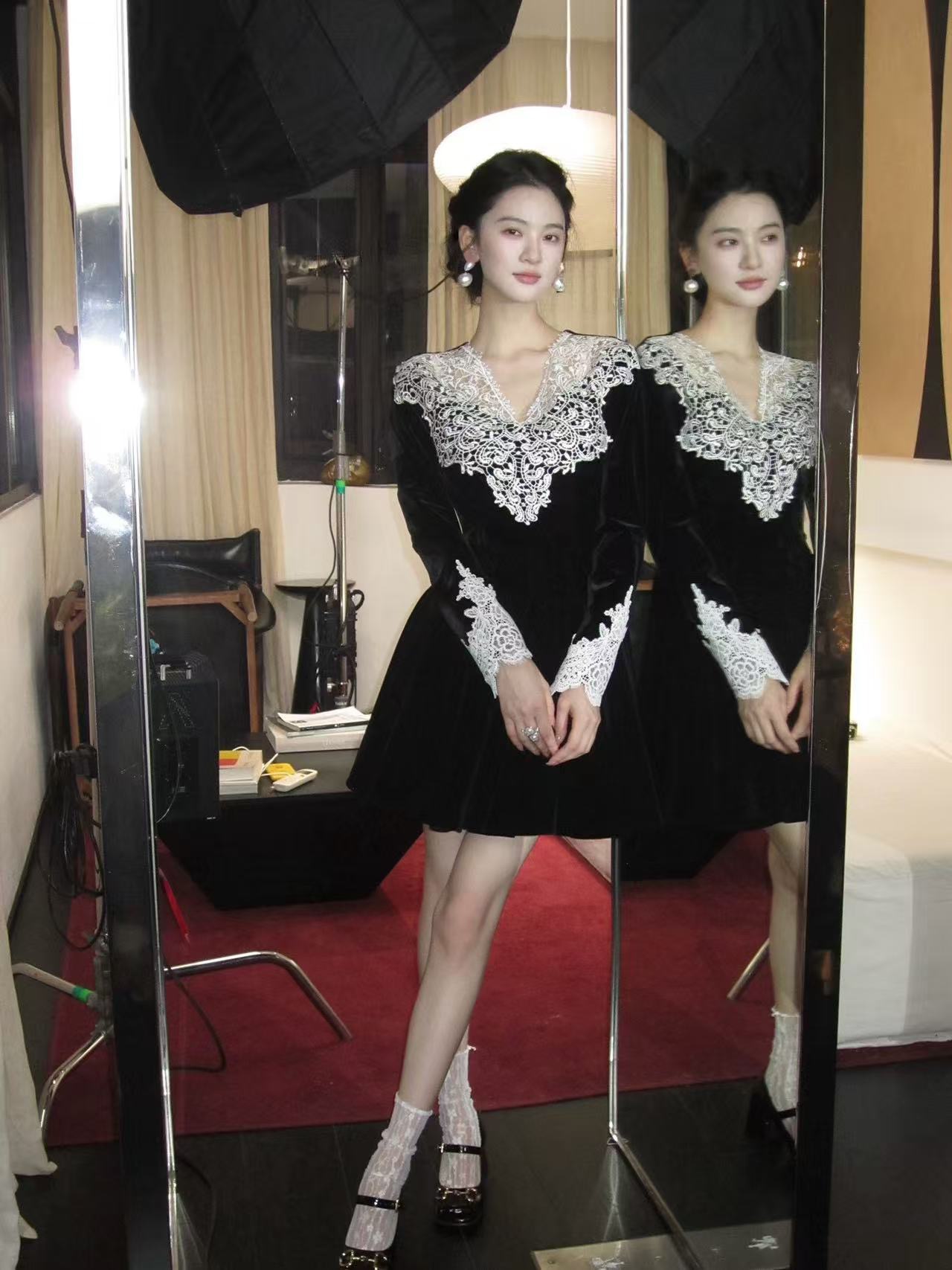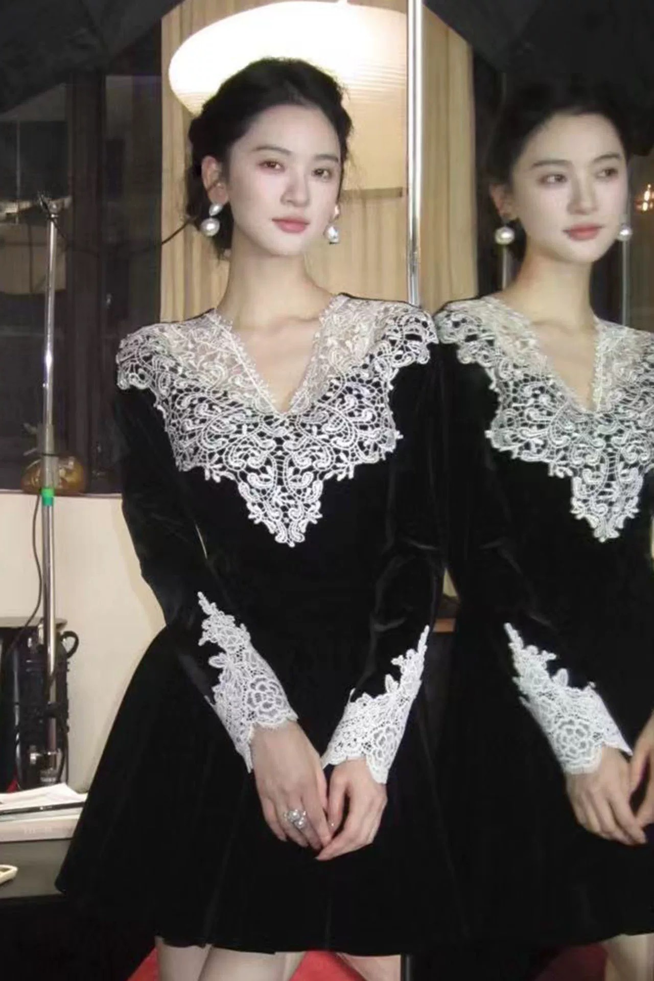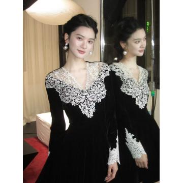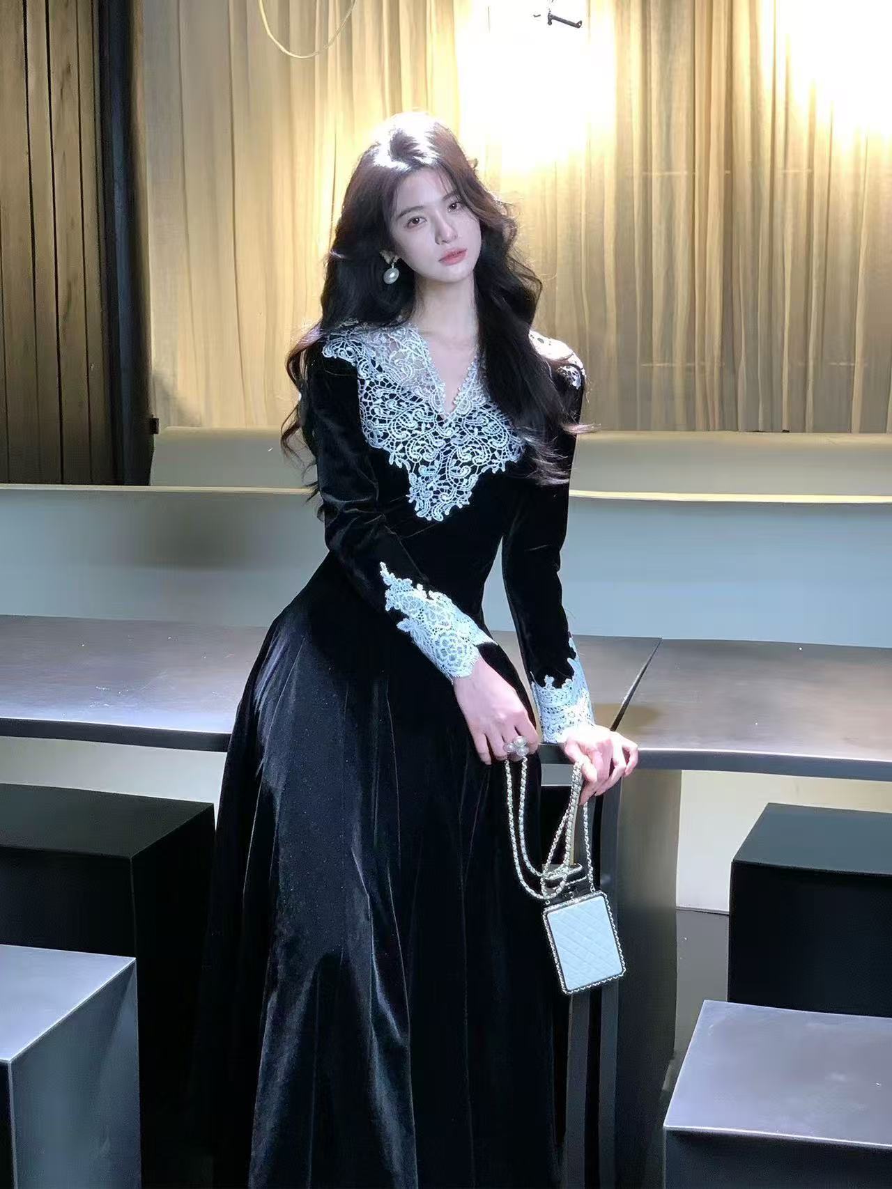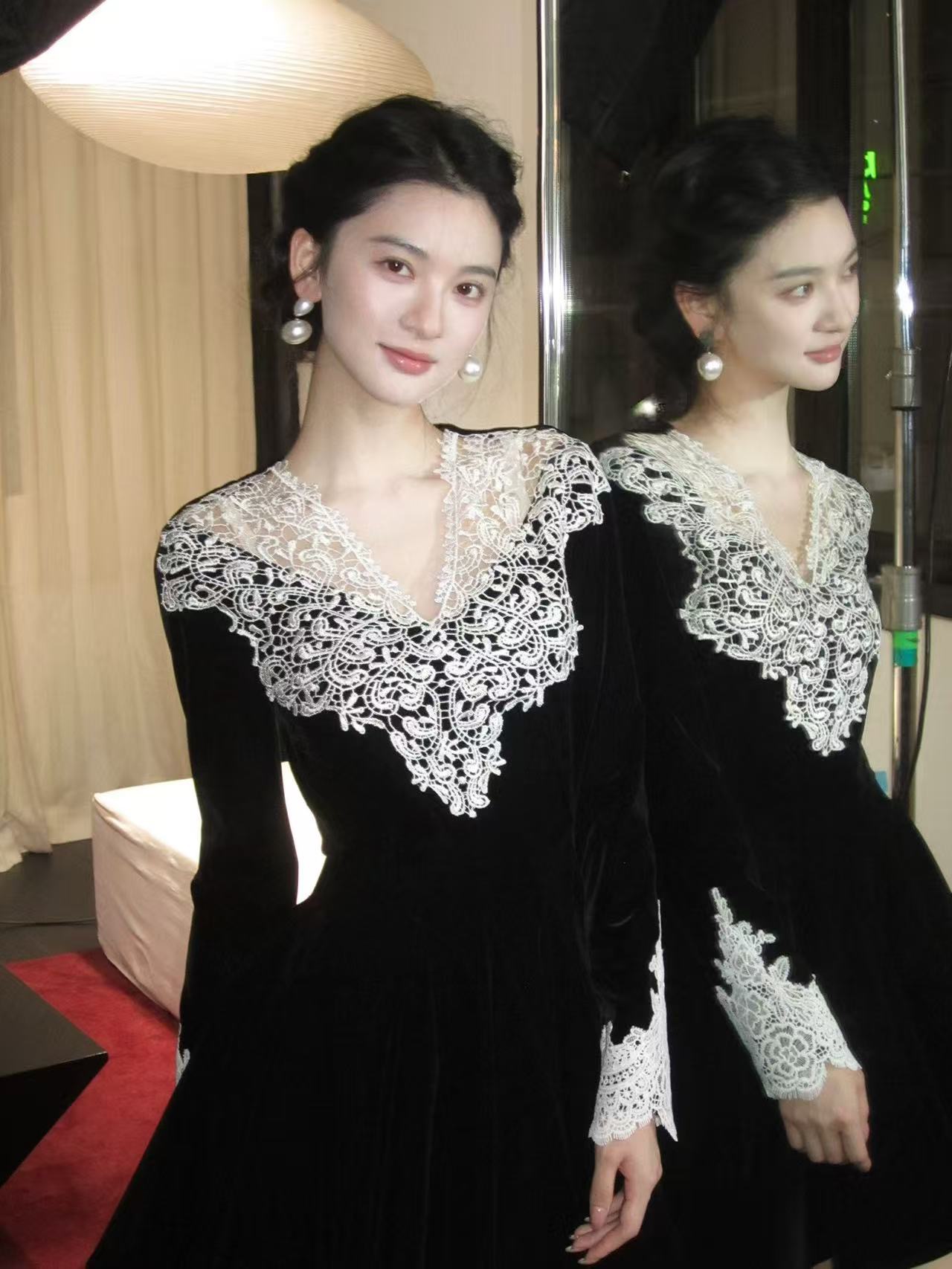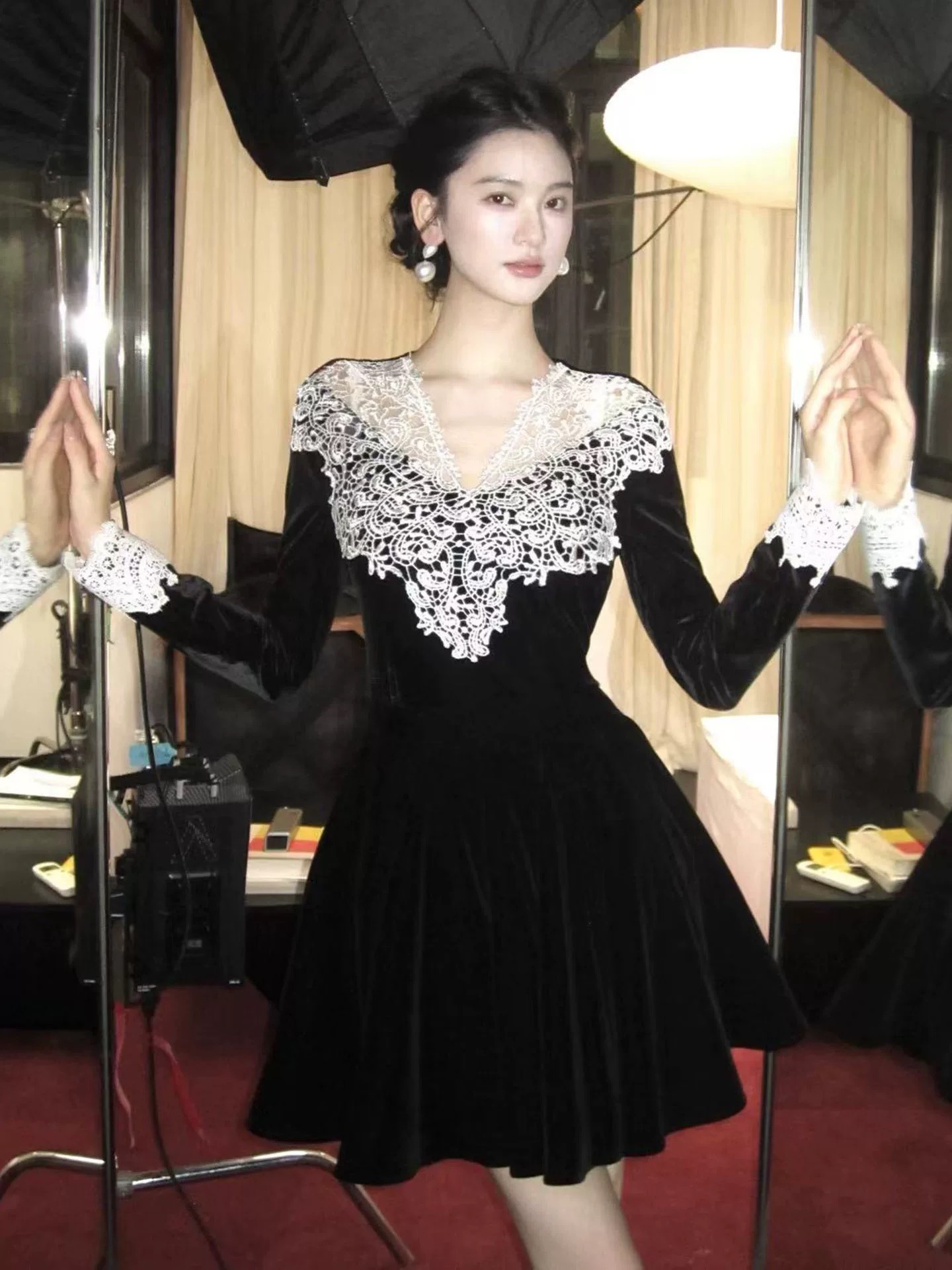 FA49406# 从一时刻撒旦之花蕾丝花边V领长袖丝绒连衣裙收腰A摆长短裙 服裝批發女裝批發服飾貨源