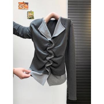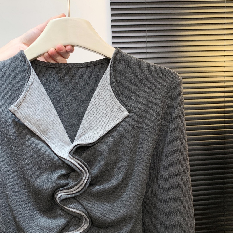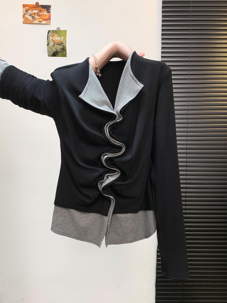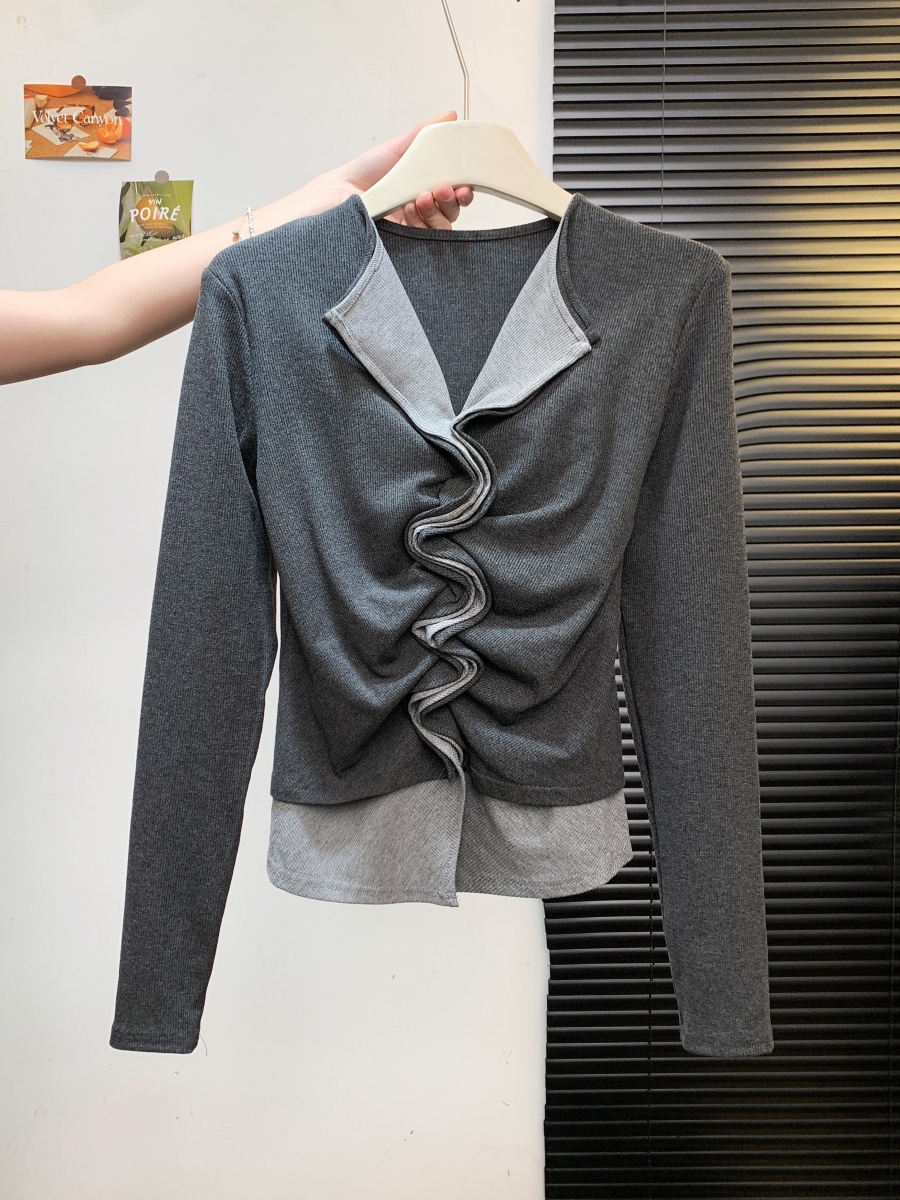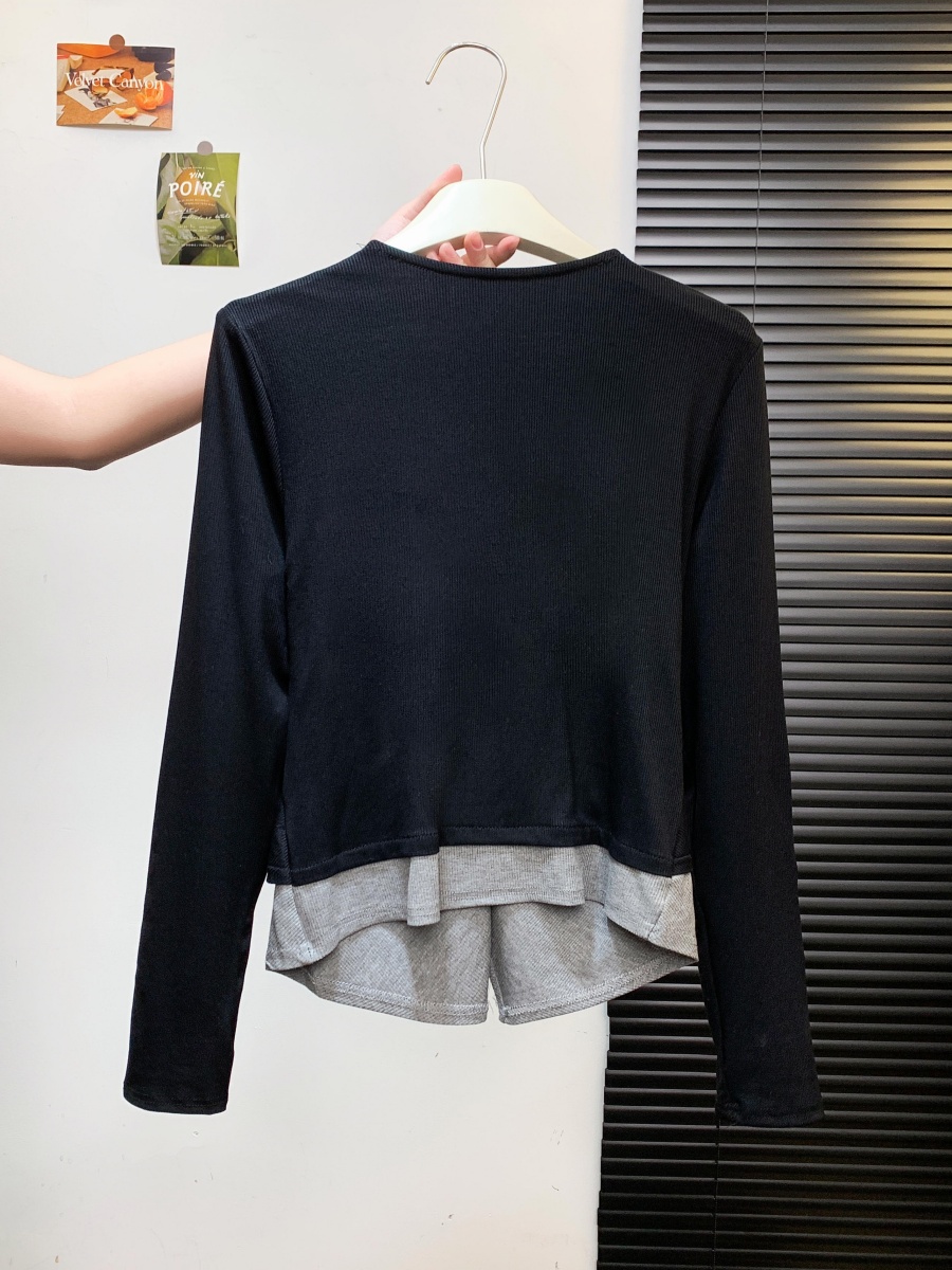 FA49414# 韩版时尚复古撞色拼接假两件设计感修身显瘦褶皱百搭T恤女 服裝批發女裝批發服飾貨源