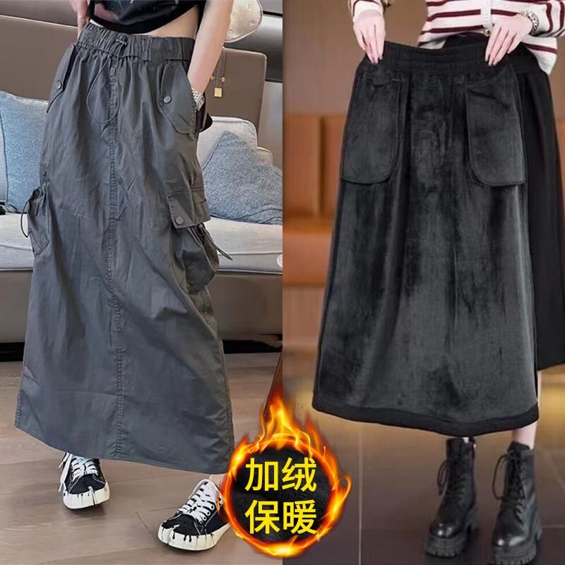 韩版复古大码工装裙女冬季加绒加厚设计感高腰中长款半身裙潮 服裝批發女裝批發服飾貨源
