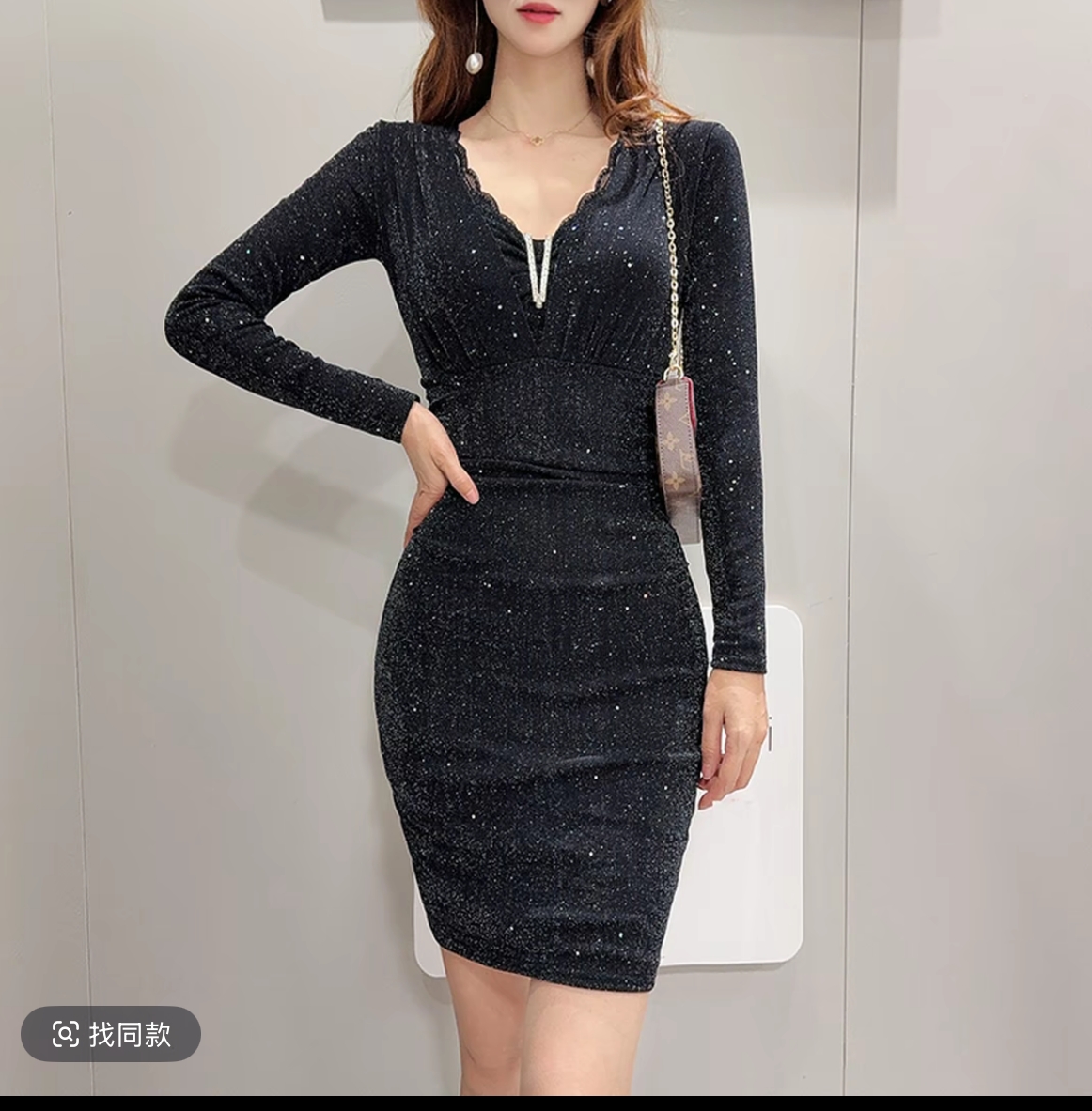 FA49469# 冬装新款修身连衣裙-小性感V领收腰包臀裙闪闪小黑裙打底裙子 服裝批發女裝批發服飾貨源