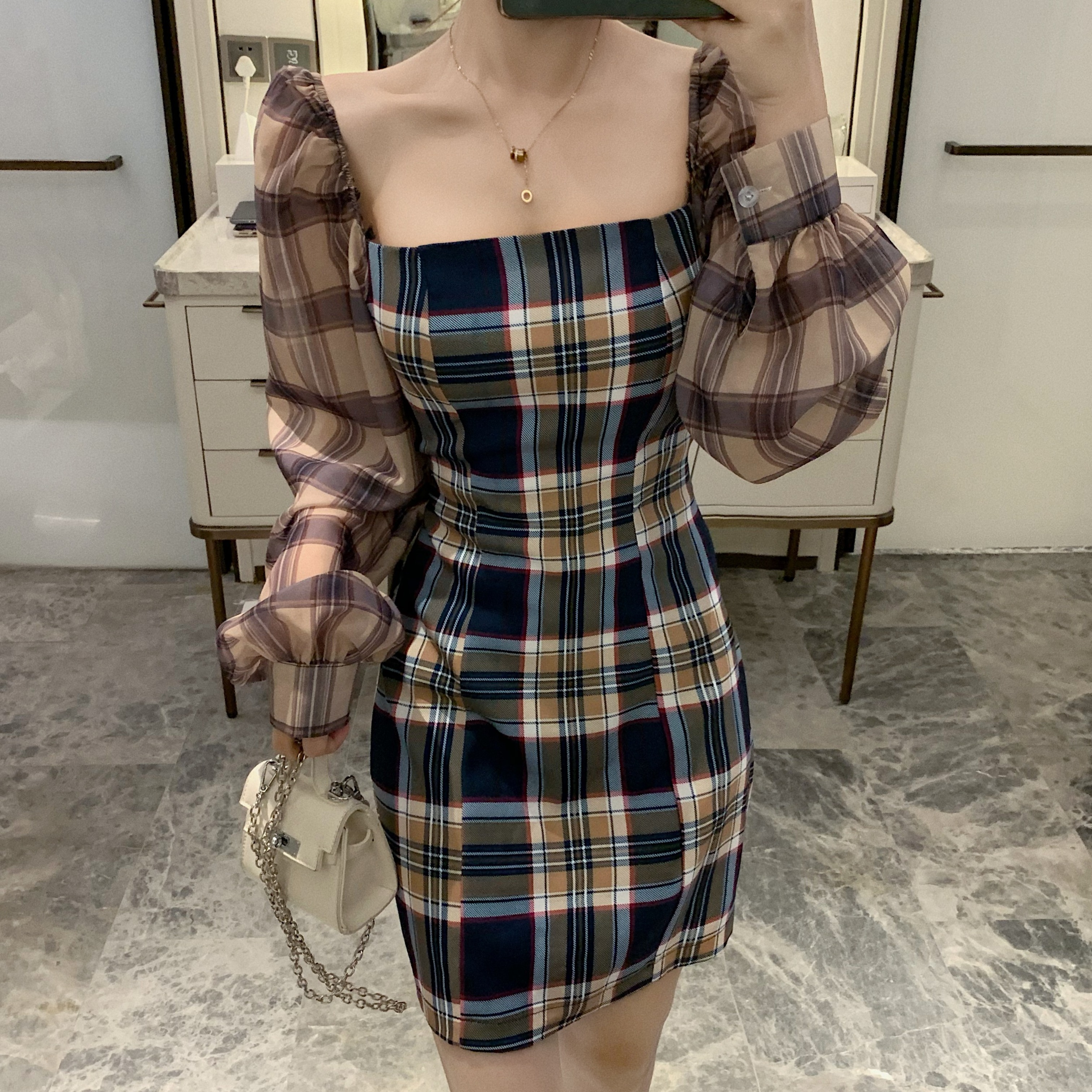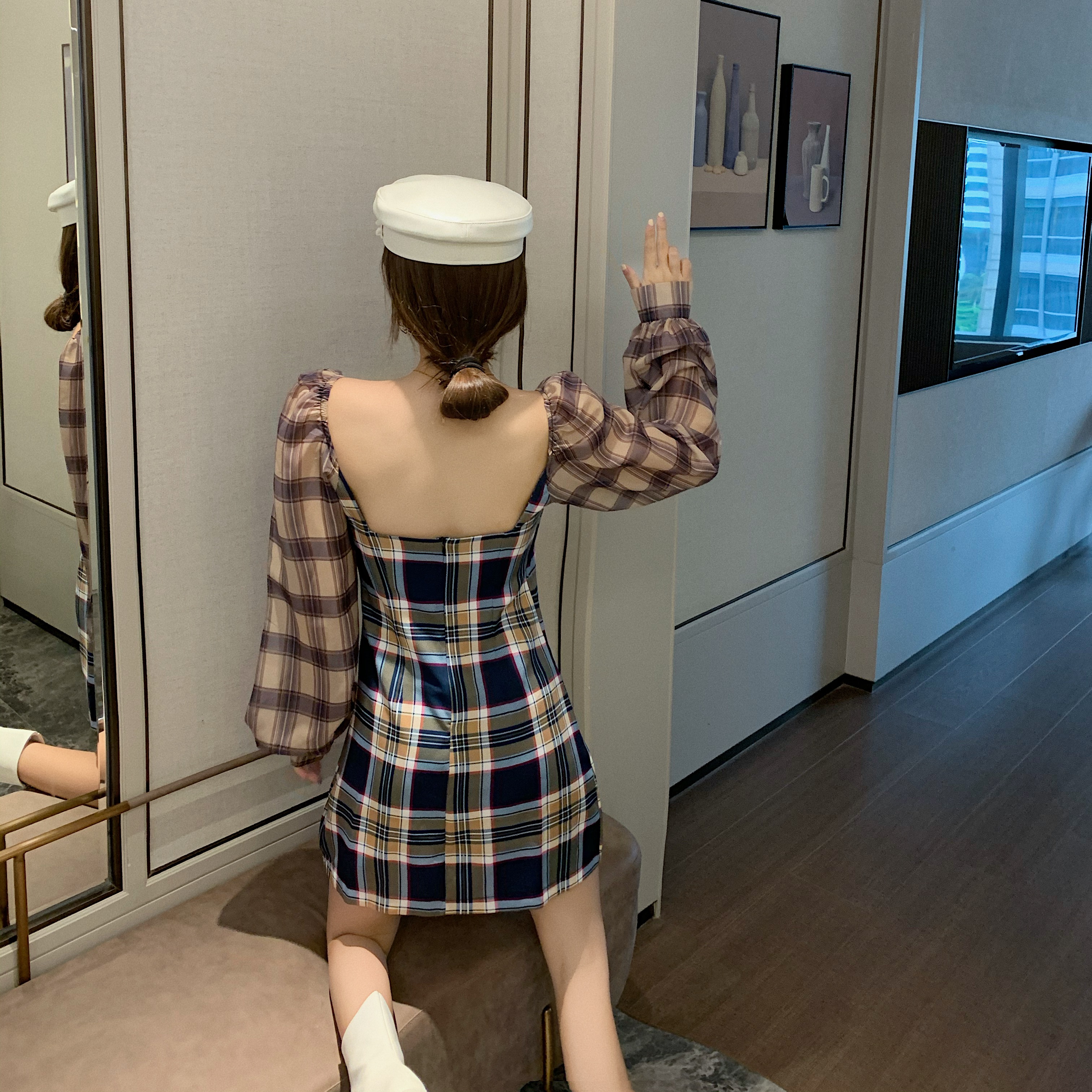 FA49475# 设计师品牌新款MIXEDMINI连衣裙灯笼袖格纹裙子女 服裝批發女裝批發服飾貨源