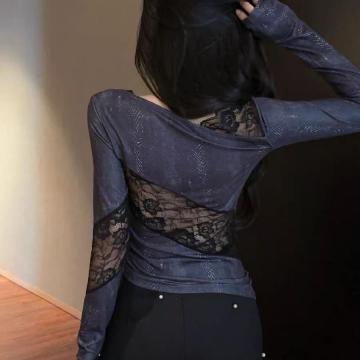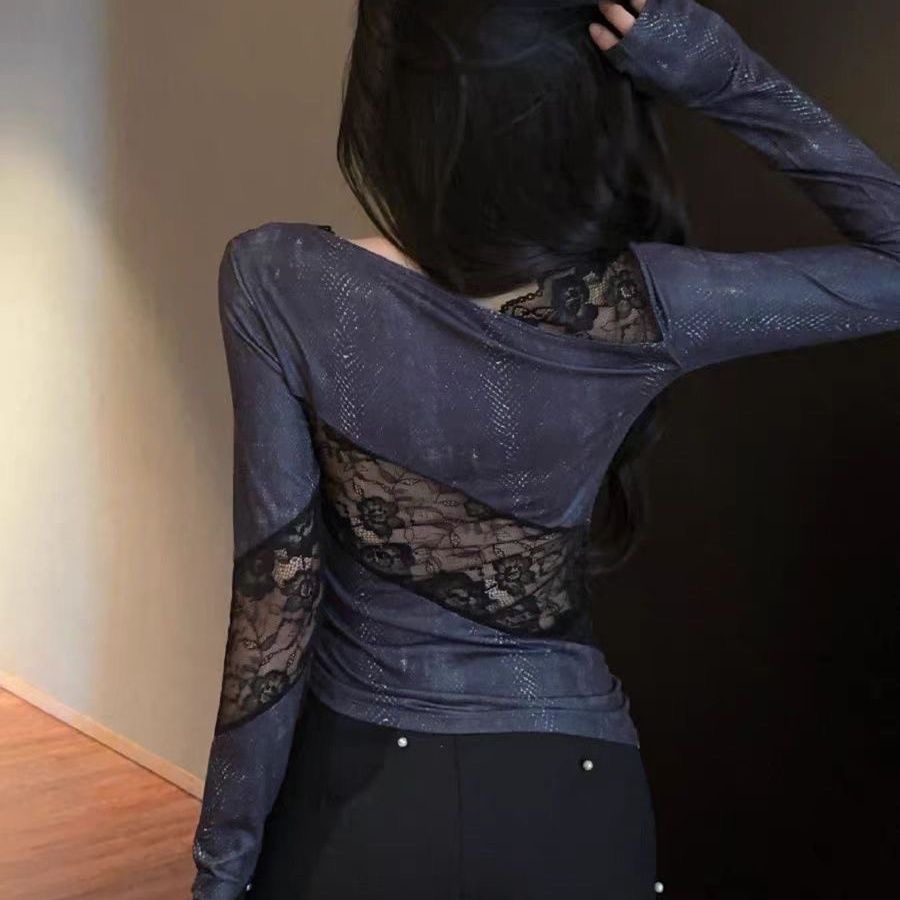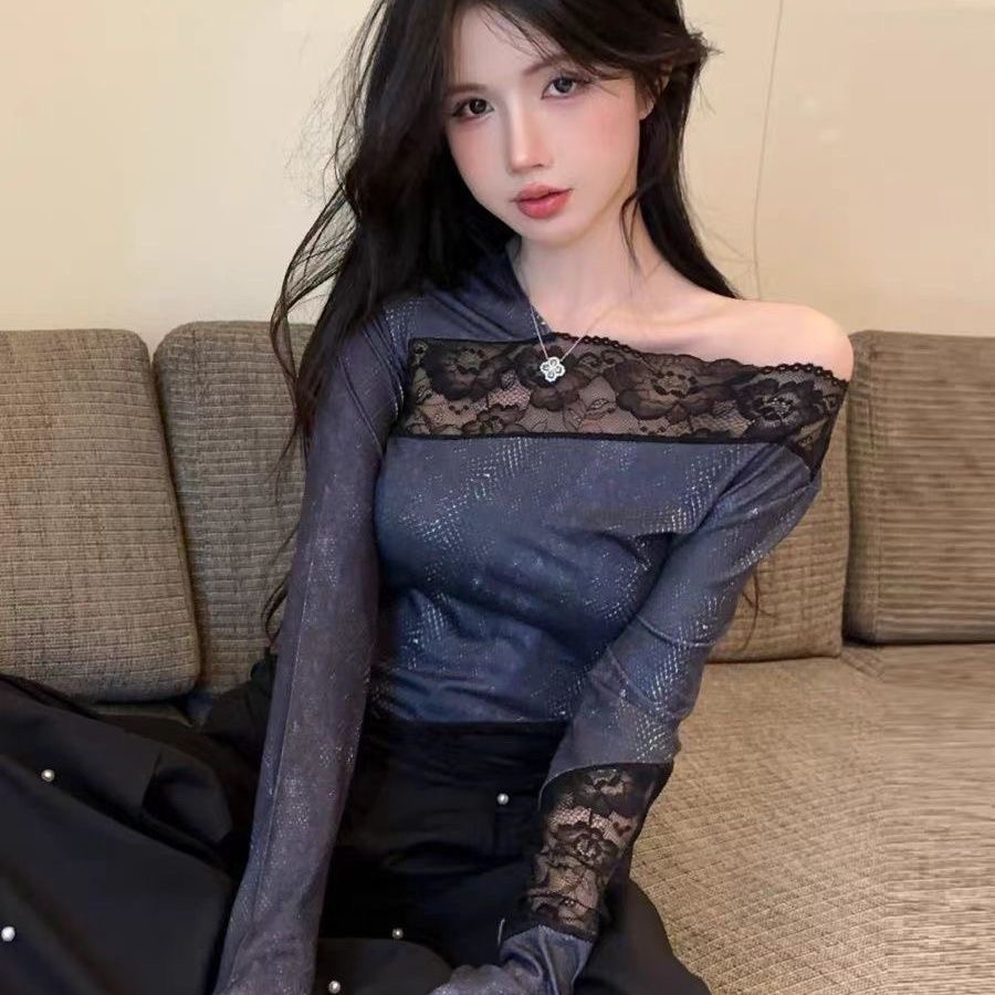 FA49478# 美式y2k甜辣妹斜肩上衣女秋季高级感不规则蕾丝打底衫内搭可外穿 服裝批發女裝批發服飾貨源