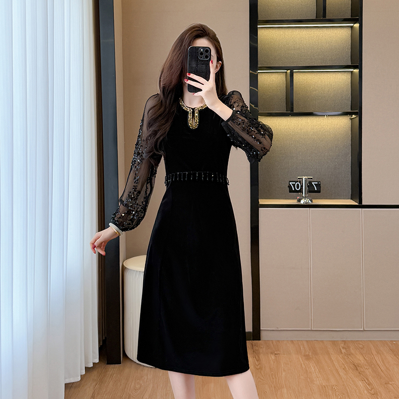 FA49497# 秋冬时尚钉珠重工名媛风拼接亮片流苏丝绒连衣裙 服裝批發女裝批發服飾貨源