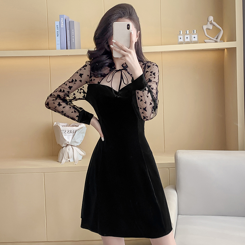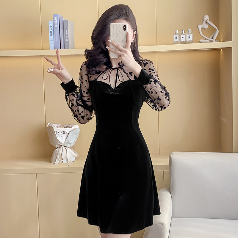 FA49503# 新款金丝绒长袖网纱印花拼接连衣裙时尚性感个性春秋连衣裙 服裝批發女裝批發服飾貨源