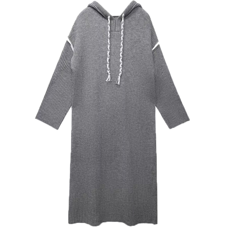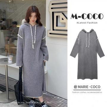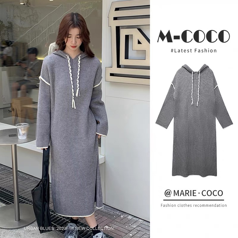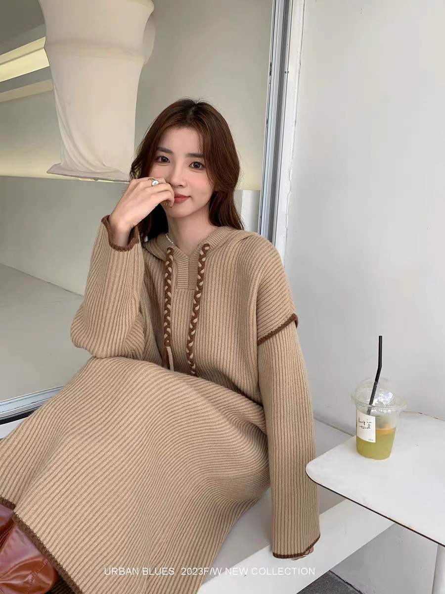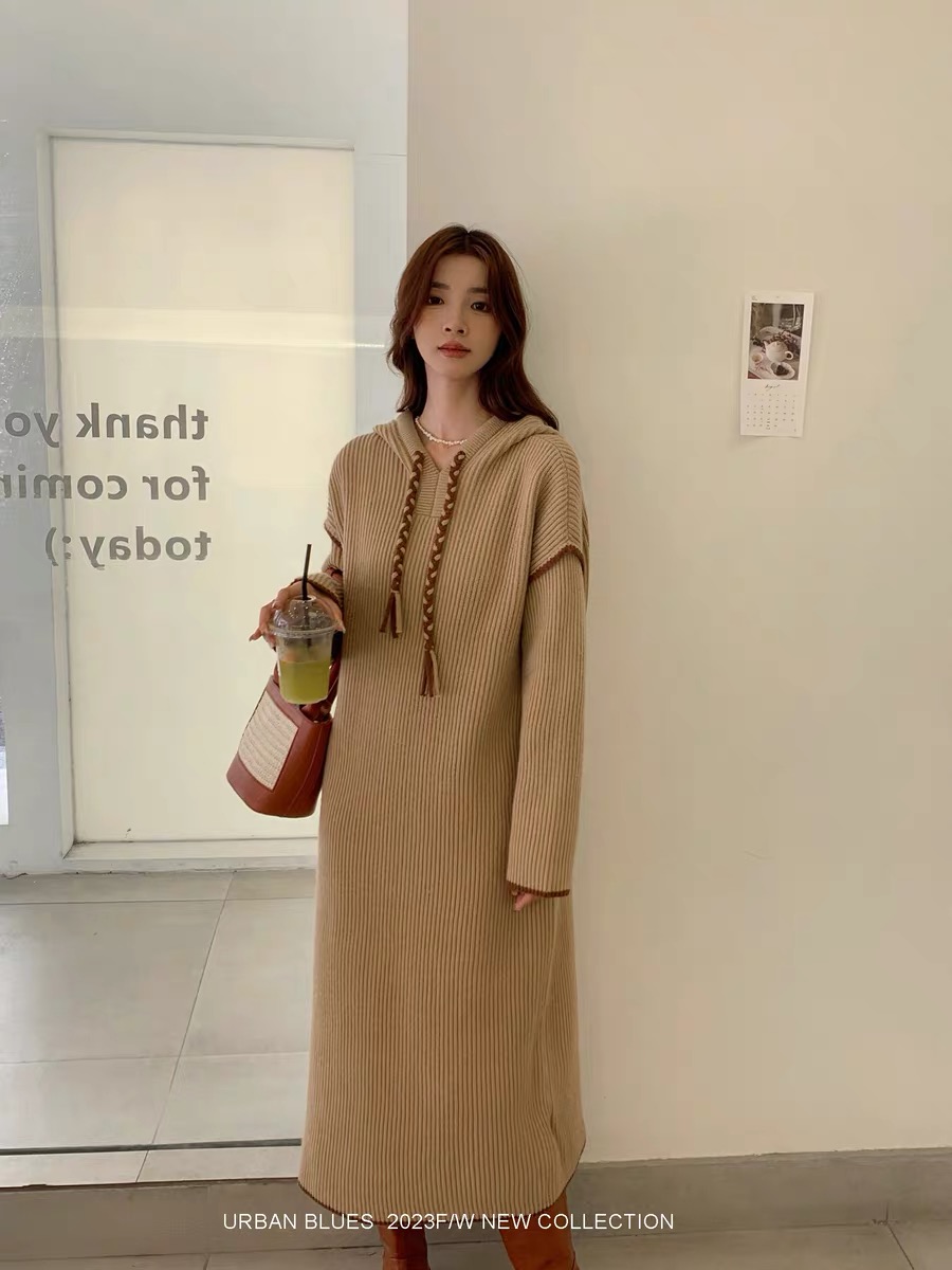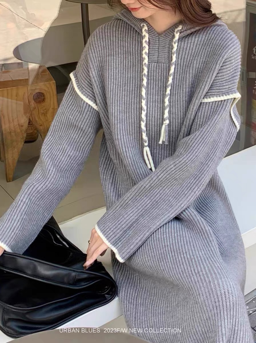 FA51341# 大码女装轻奢针织连衣裙女秋冬新款复古宽松慵懒风休闲连帽毛衣 服裝批發女裝批發服飾貨源