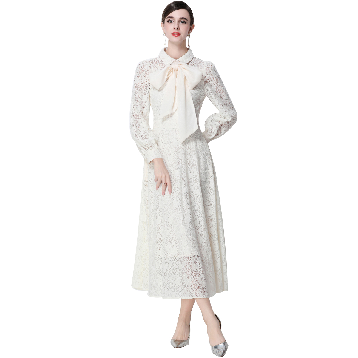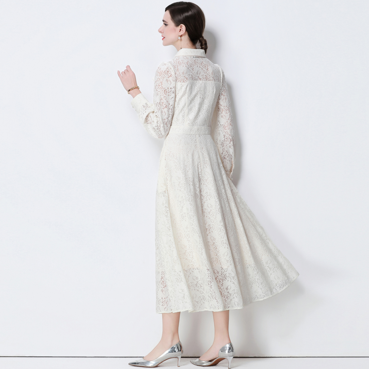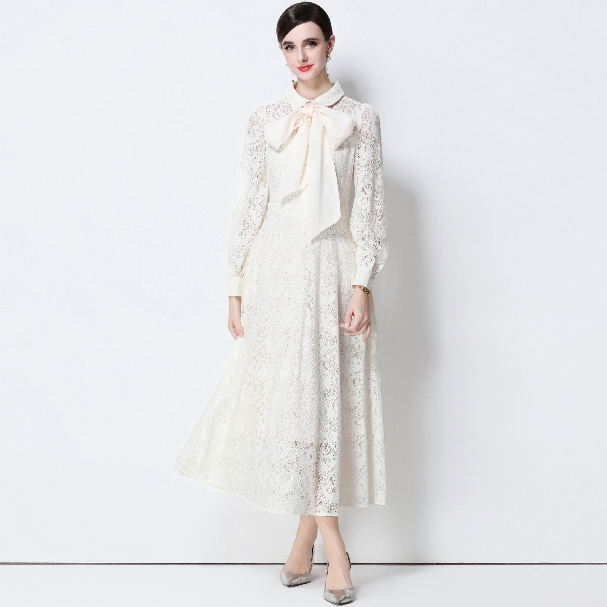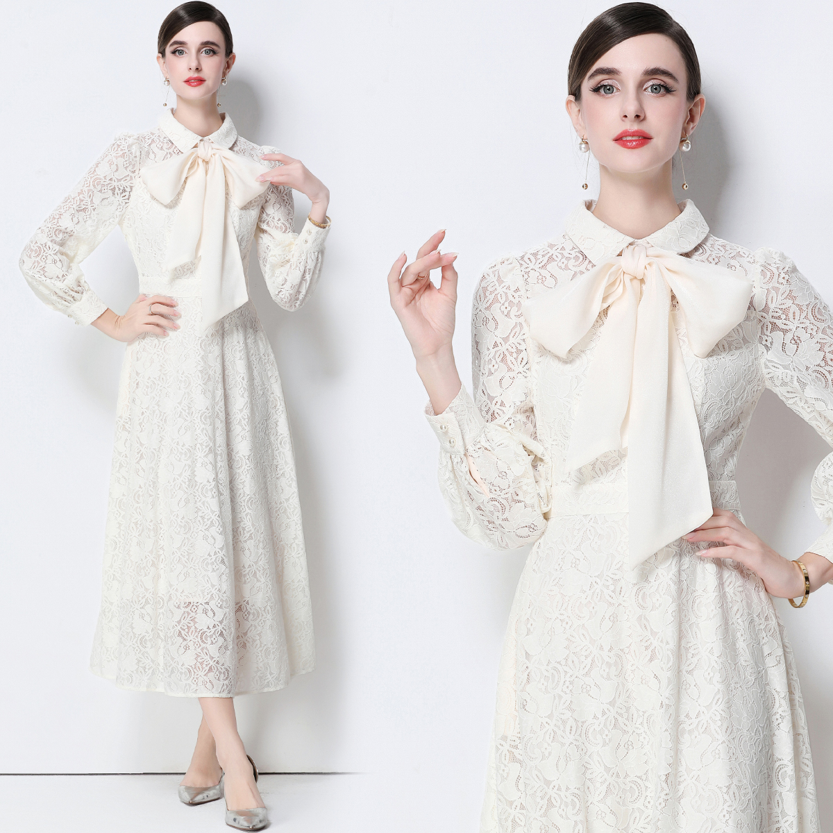 FA51351# 气质名媛高端水溶蕾丝长袖丝绸系带连衣裙女高腰显瘦中长裙 服裝批發女裝批發服飾貨源