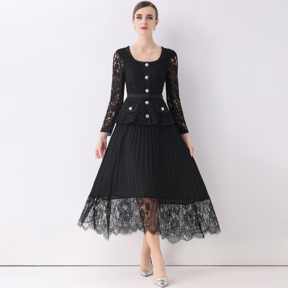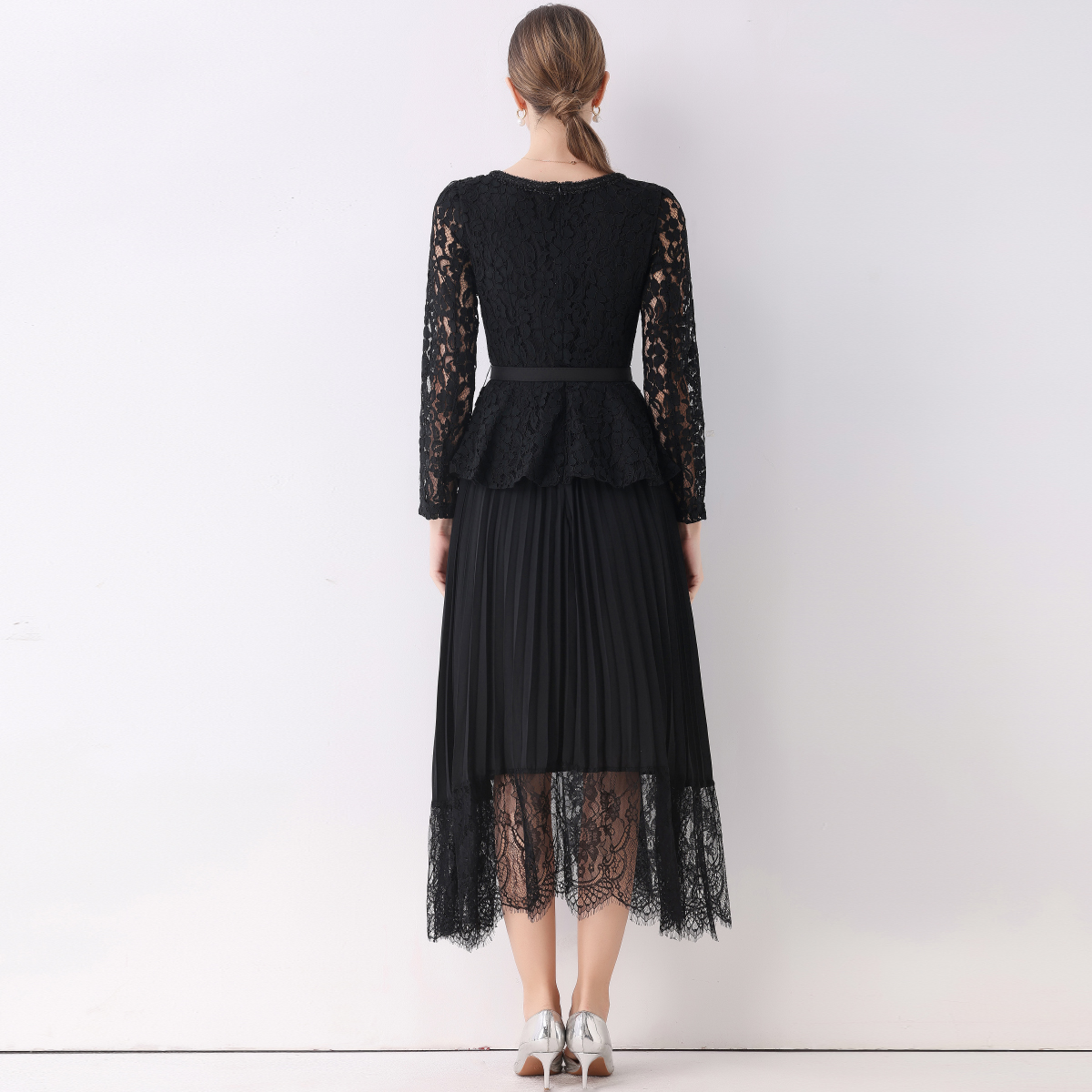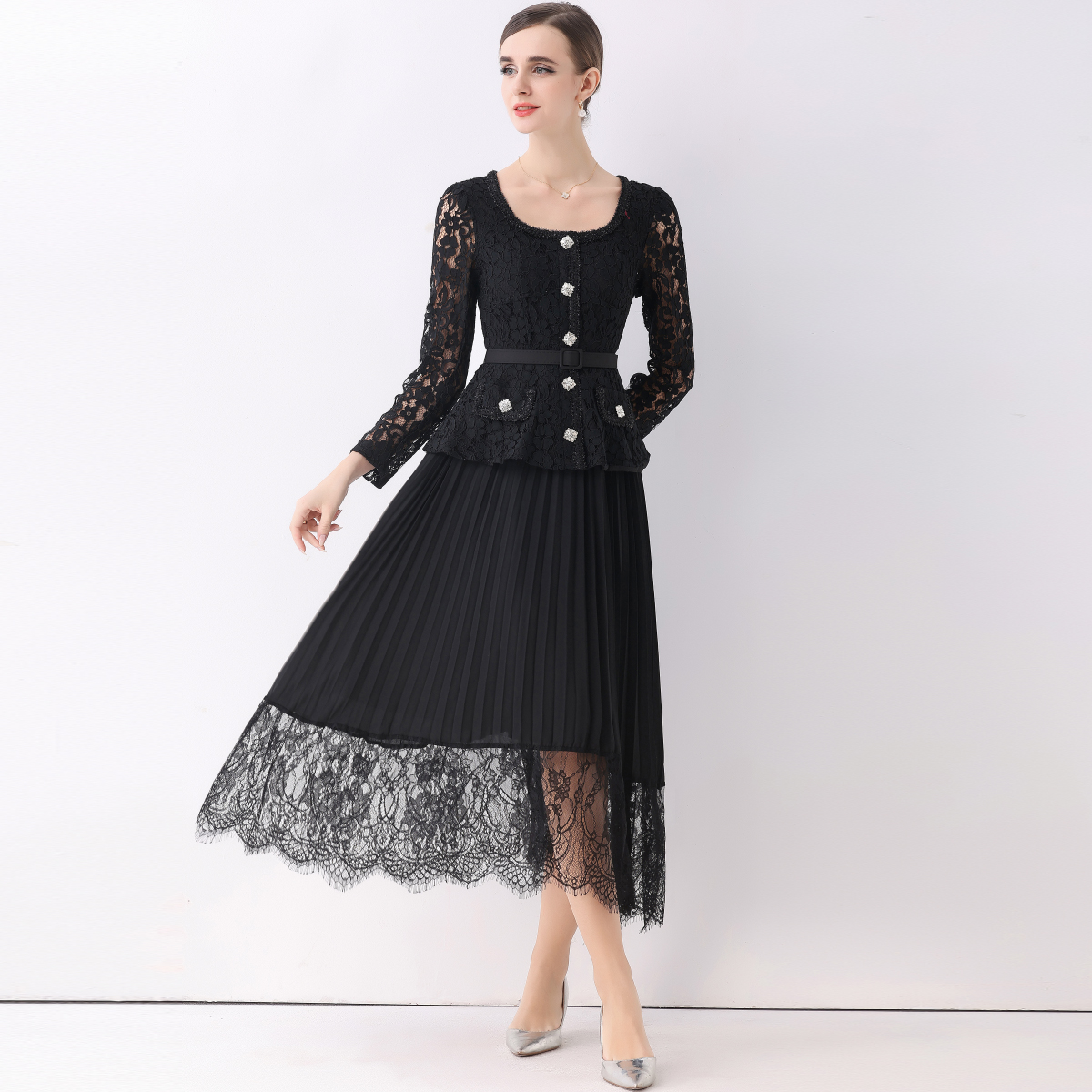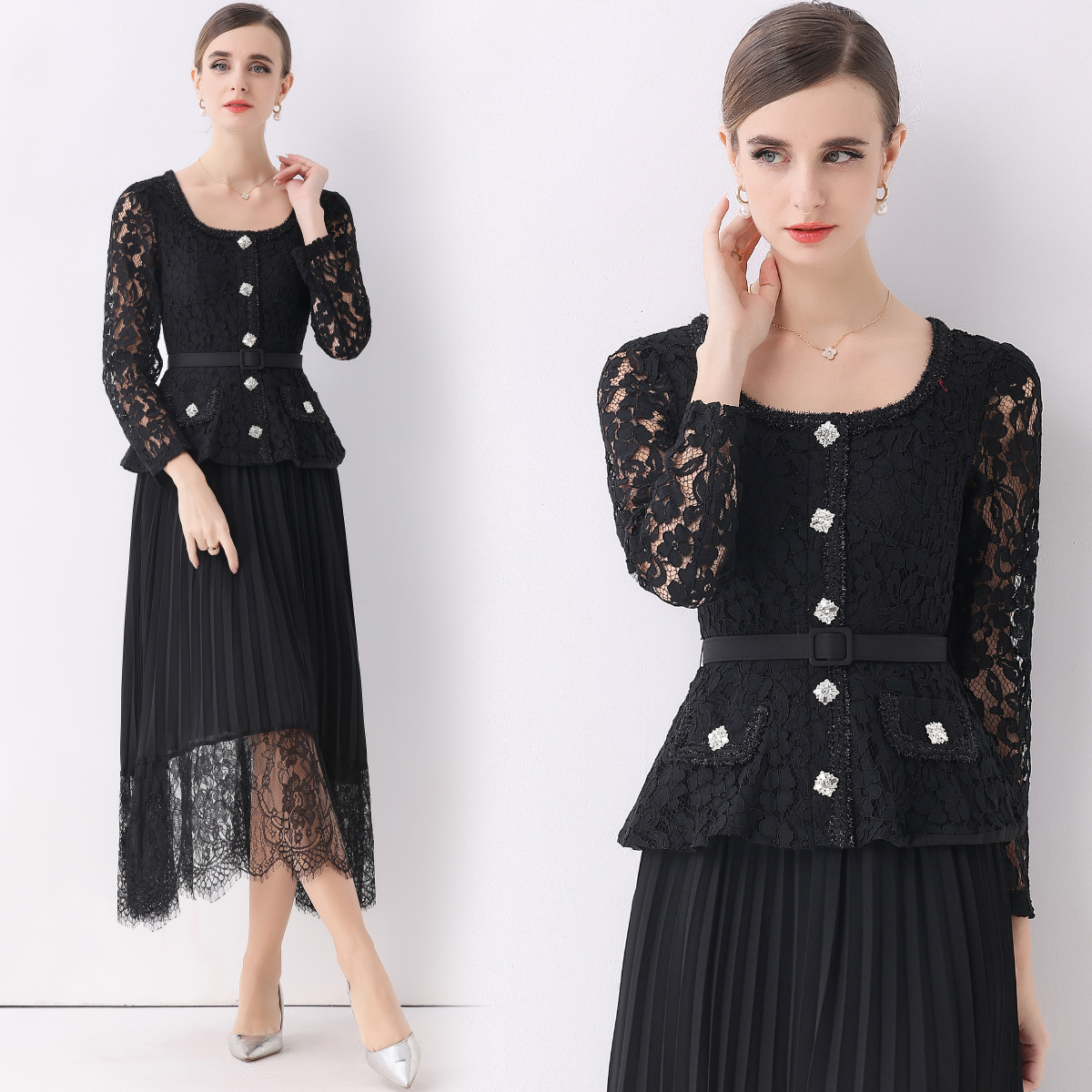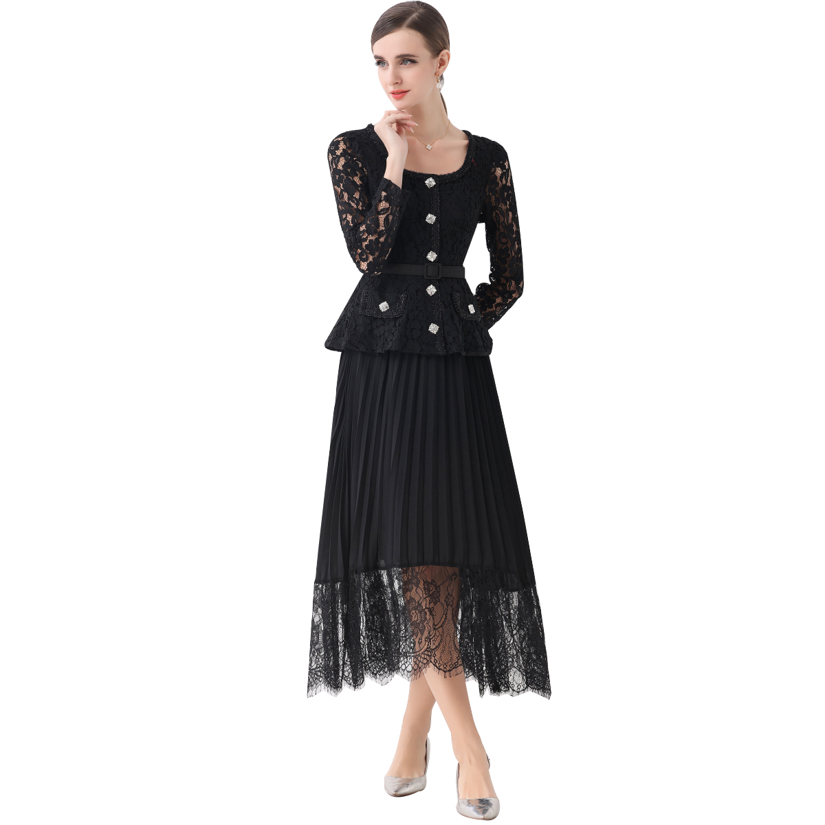 FA51359# 法式翻领蕾丝拼接收腰压褶连衣裙女秋季小香风长裙子送腰带 服裝批發女裝批發服飾貨源