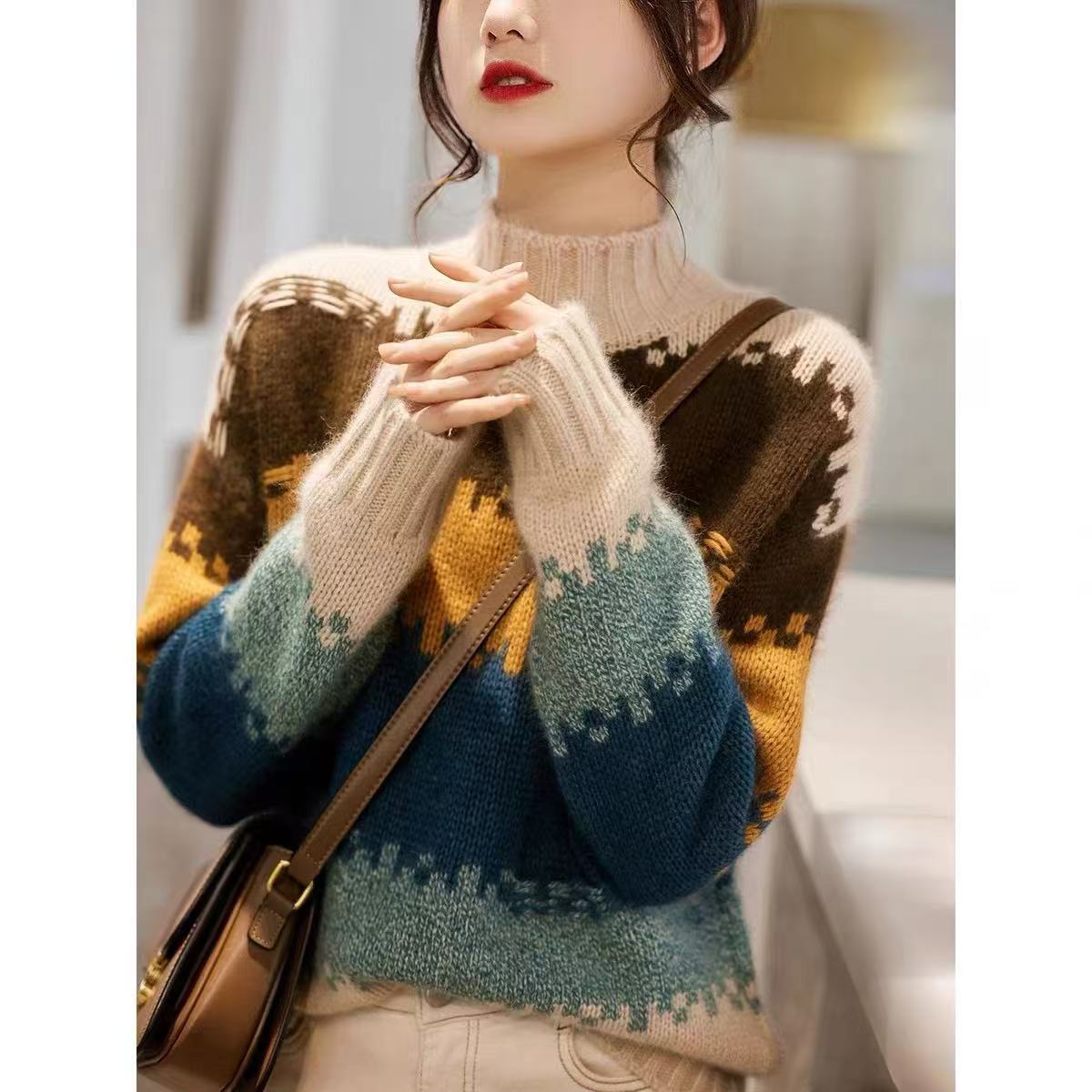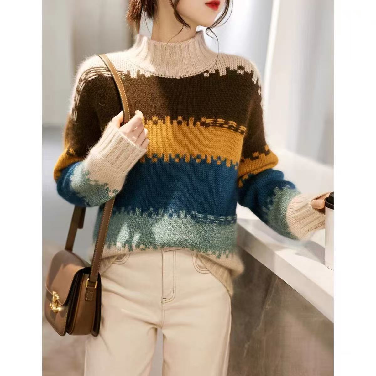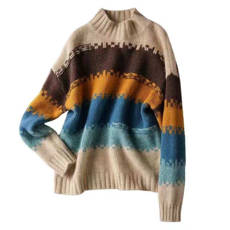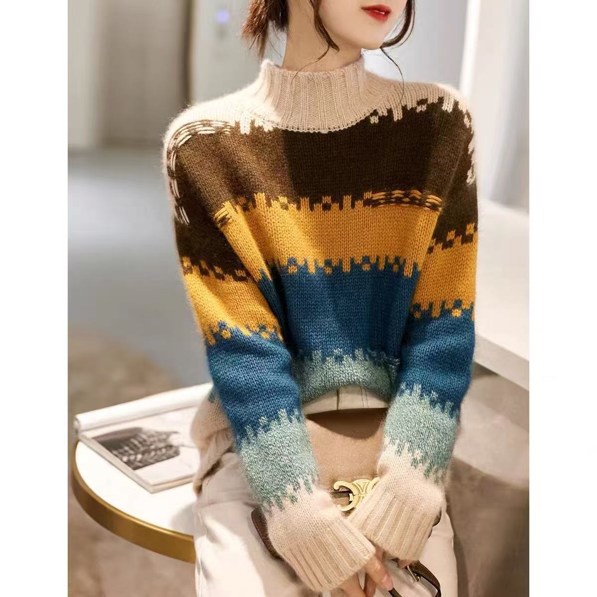 FA55480# い高颜值+“软实力”细腻彩虹条纹气质半高领针织毛衣 服裝批發女裝批發服飾貨源