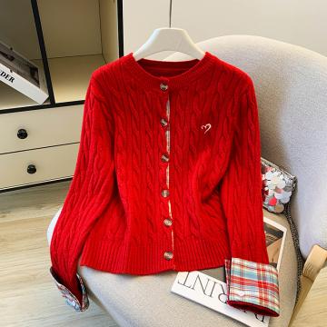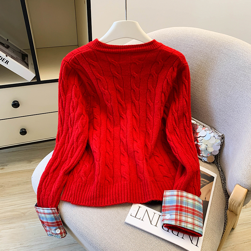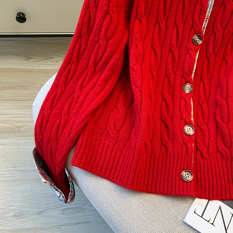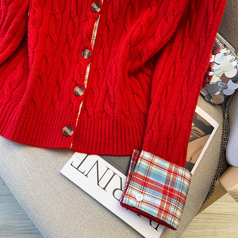 FA55505# 红色格子拼接针织开衫冬季保暖学院风chic麻花毛衣 服裝批發女裝批發服飾貨源