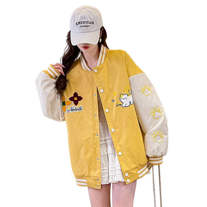 FA55517# 美式甜酷猫爪刺绣撞色超好看夹棉外套棒球服夹克男女百搭宽松情侣 服裝批發女裝批發服飾貨源