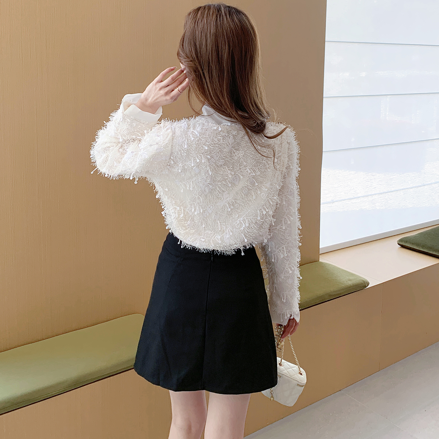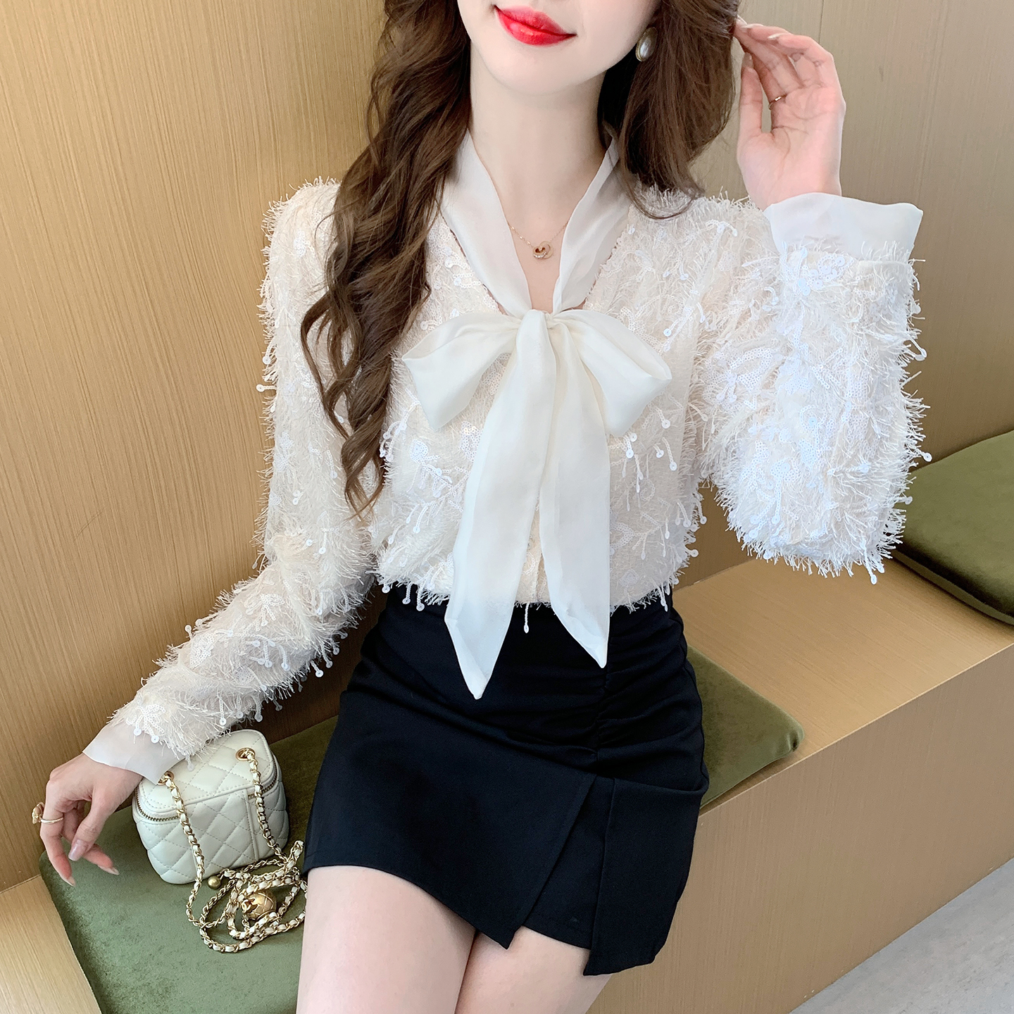 FA55610# 春季雪纺拼接蝴蝶结绑带V领衬衫重工绣花亮片流苏衬衣潮 服裝批發女裝批發服飾貨源