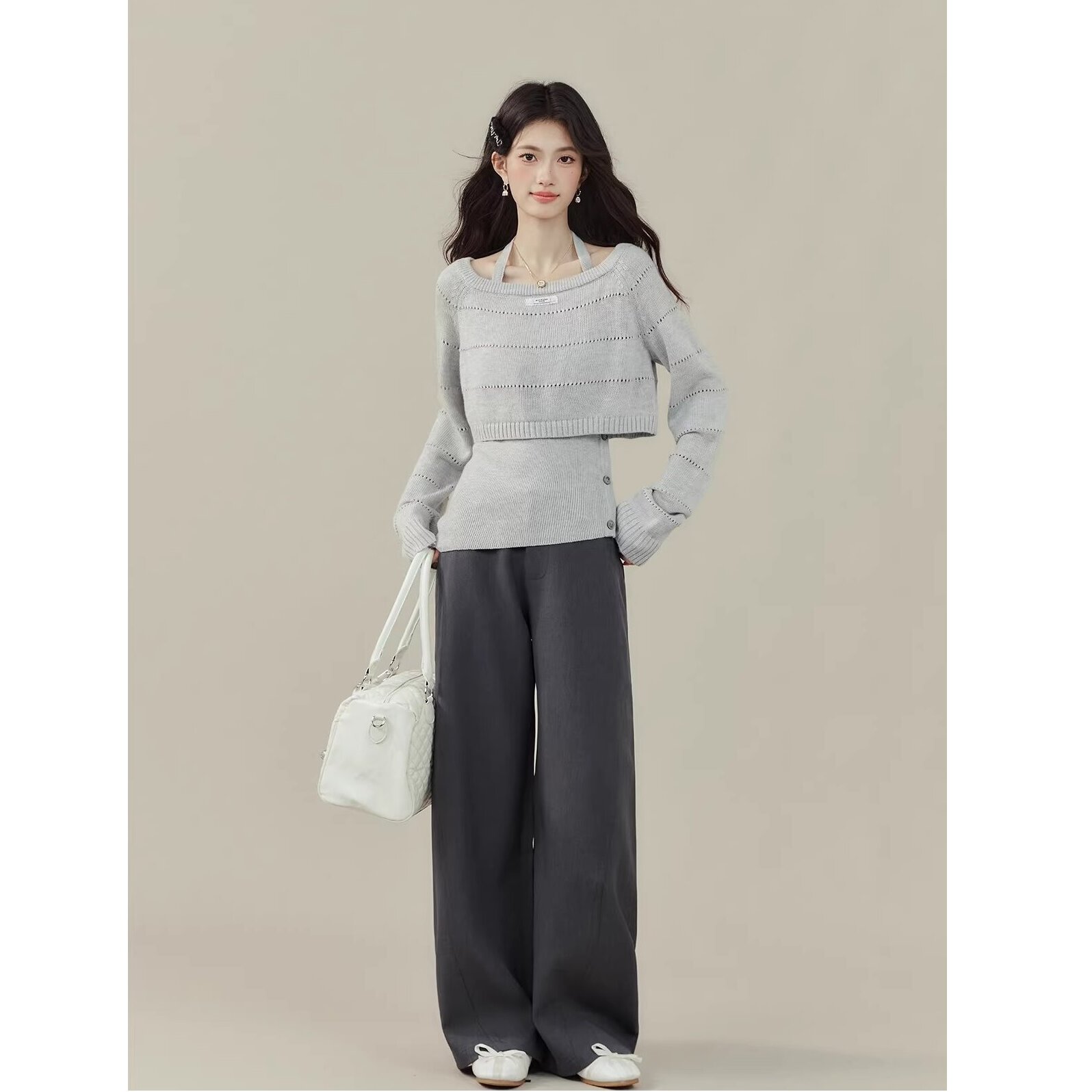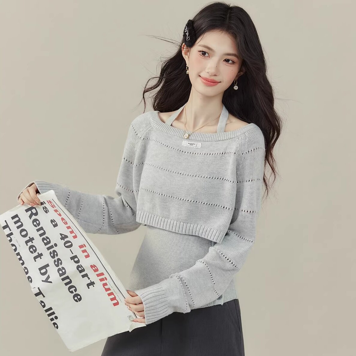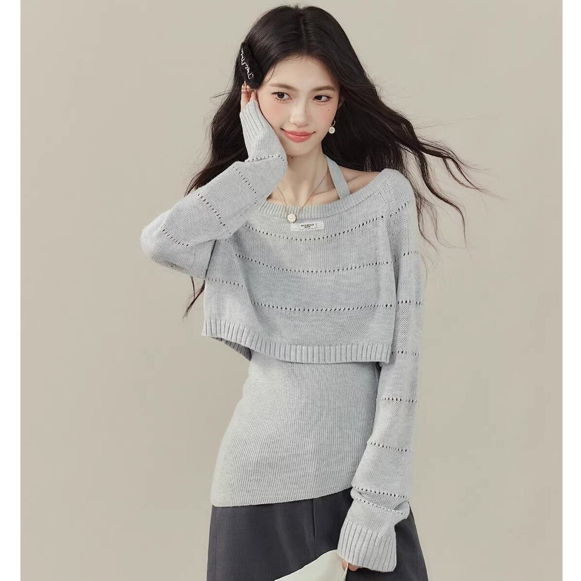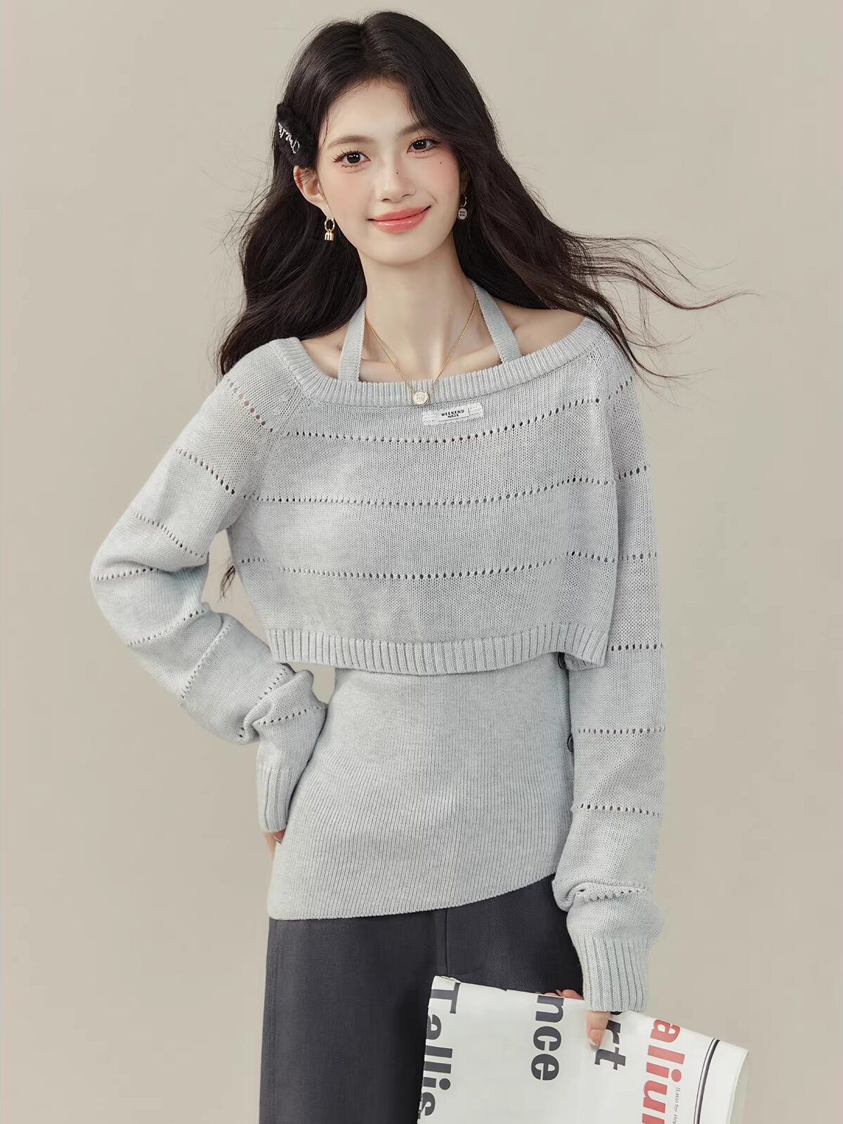 FA55623# 欧阳喜小嗲精早秋穿搭两件套挂脖背心针织衫镂空毛衣别致上衣 服裝批發女裝批發服飾貨源