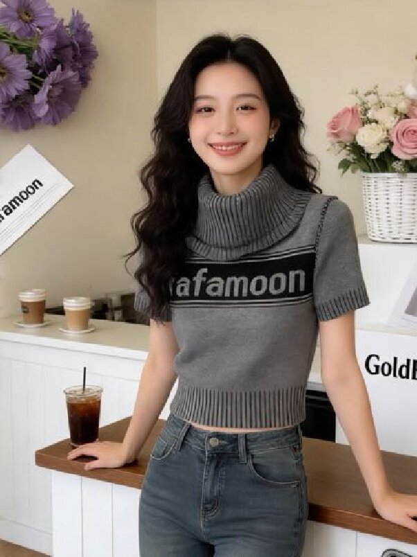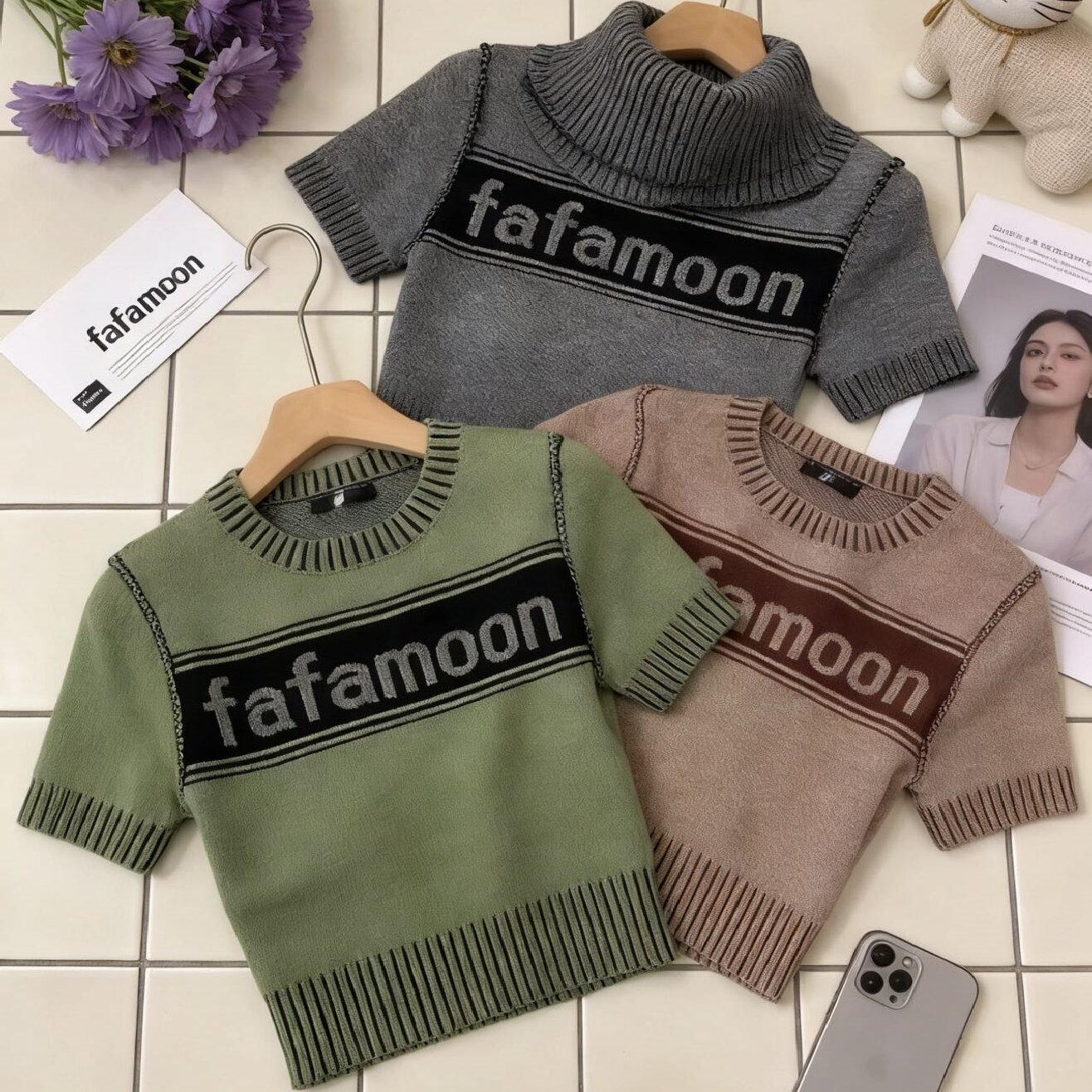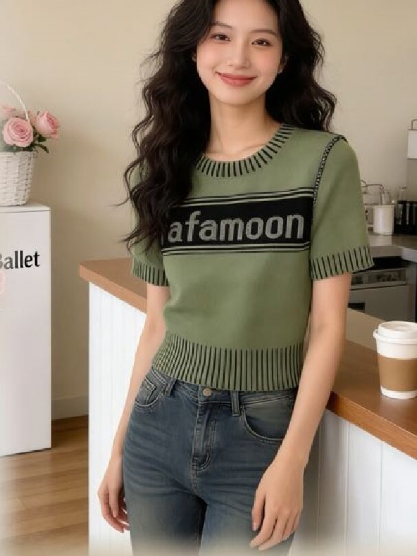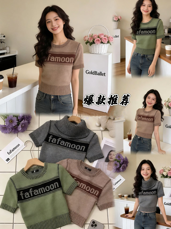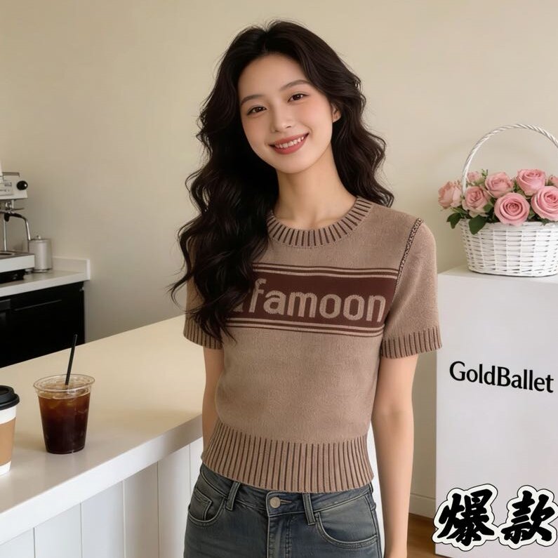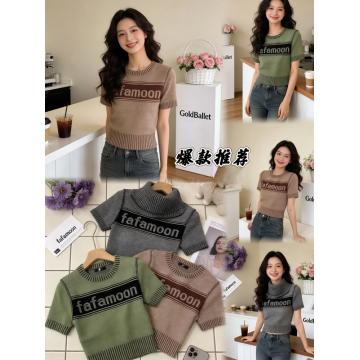 FA55624# 韩系春款上新圆领字母小香风针织衫短袖毛衣女洋气别致显瘦上衣潮 服裝批發女裝批發服飾貨源
