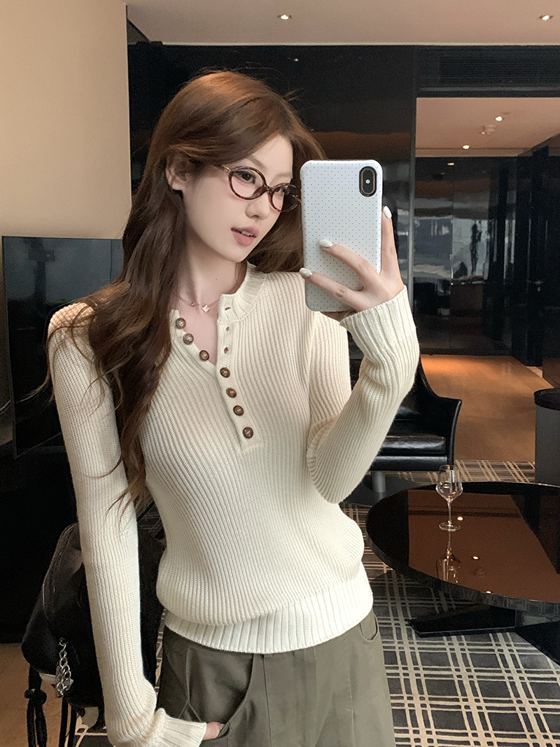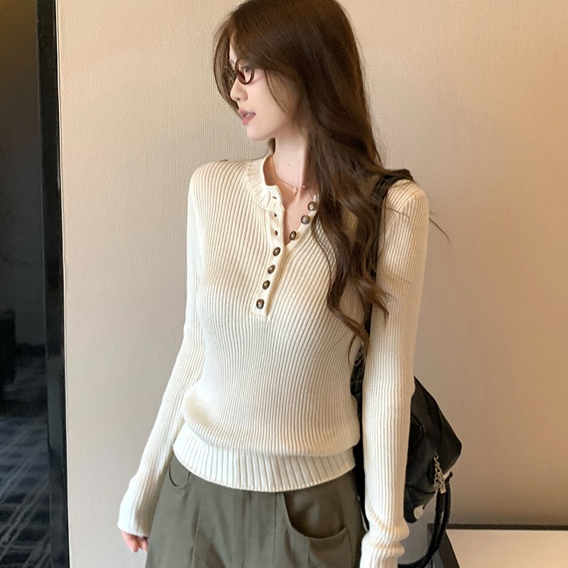 FA55671# 韩系白色半开领正肩长袖针织衫女秋冬 服裝批發女裝批發服飾貨源