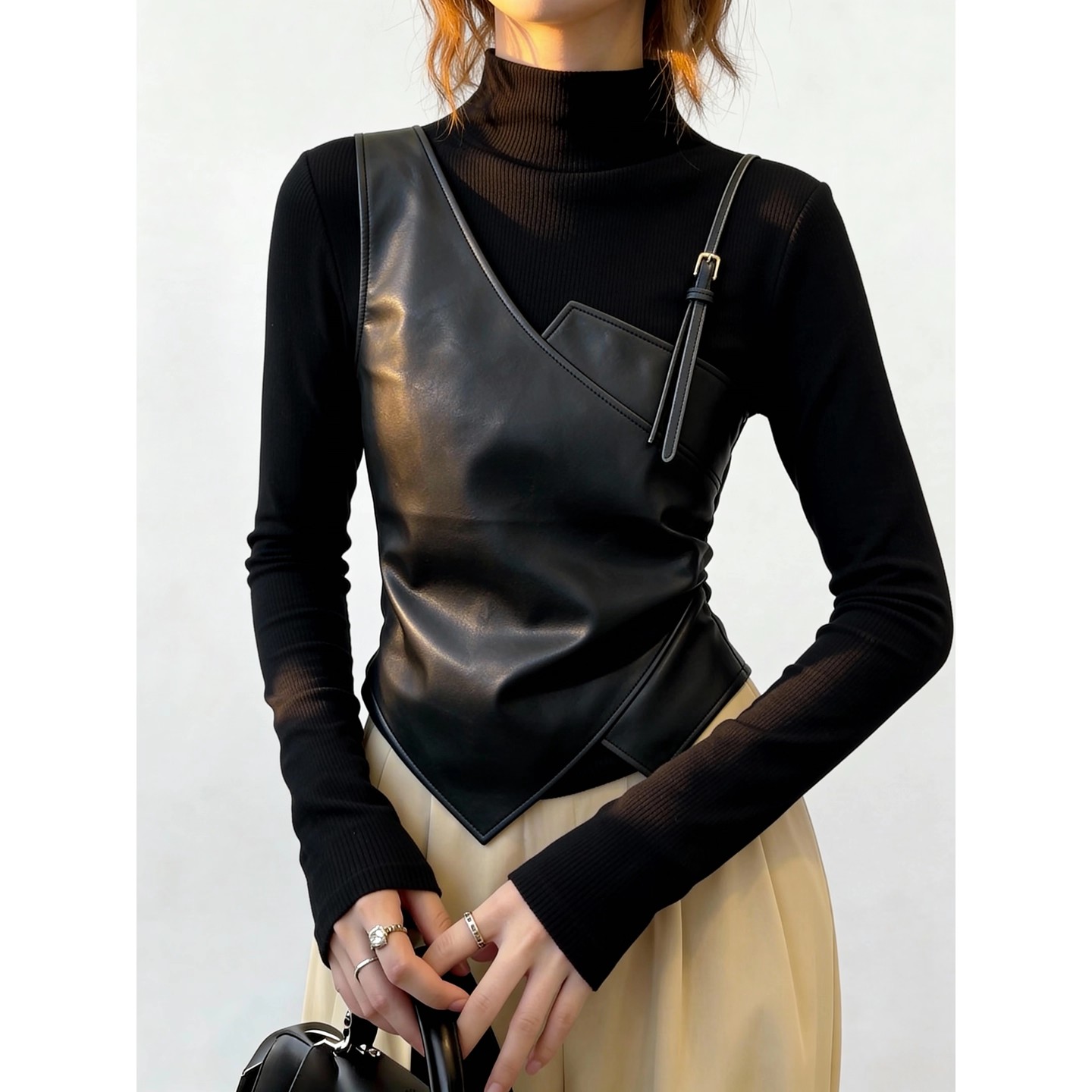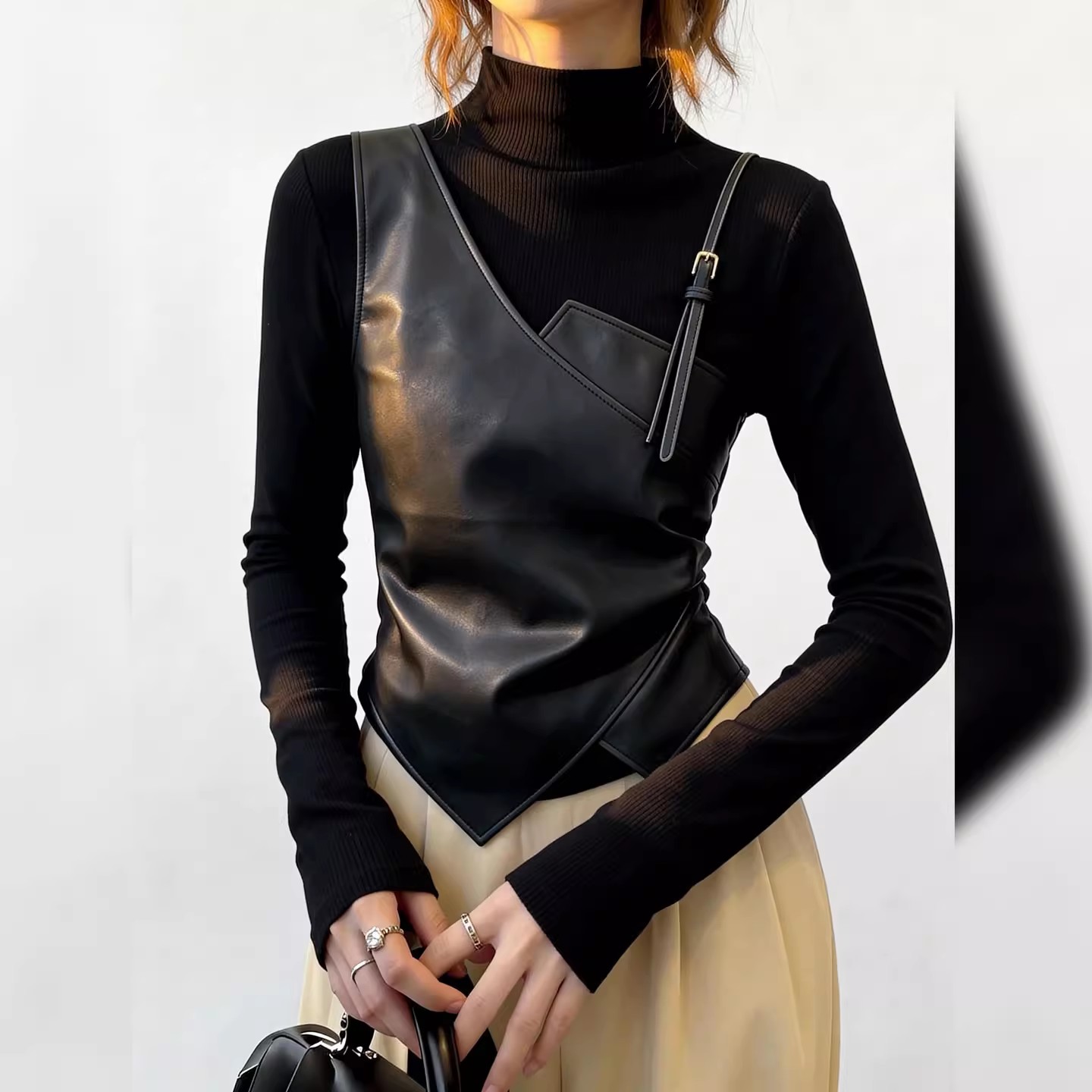 FA55675# 酷飒欧货黑色拼接上衣时尚高领小众设计长袖独特不规则冬季女 服裝批發女裝批發服飾貨源